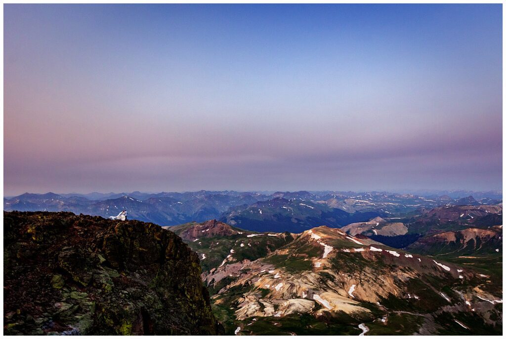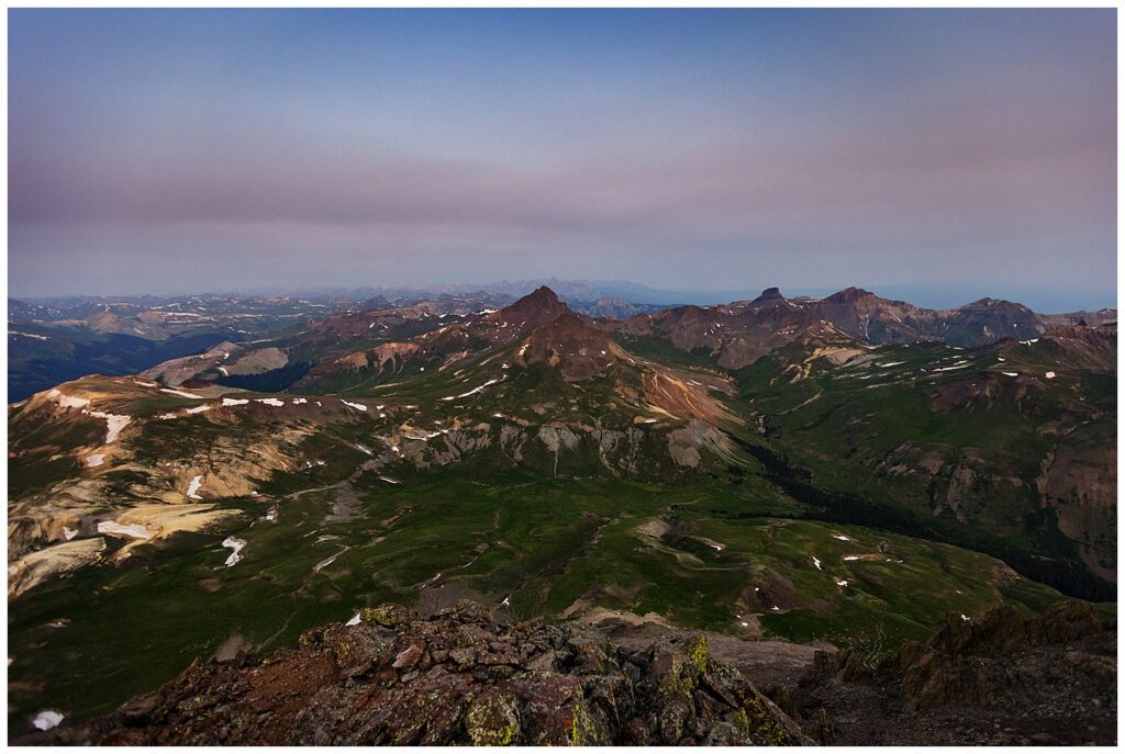 The summer of 2021 was one that was, unfortunately, full of smoke. You could see the line of smoke descending upon the San Juan mountains from atop the summit – we could tell we were about to be socked in and surrounded by hazy skies on our hike out. Smoky skies do make for some dramatic lighting though at sunrise – and the colors it provides always are stunning.
