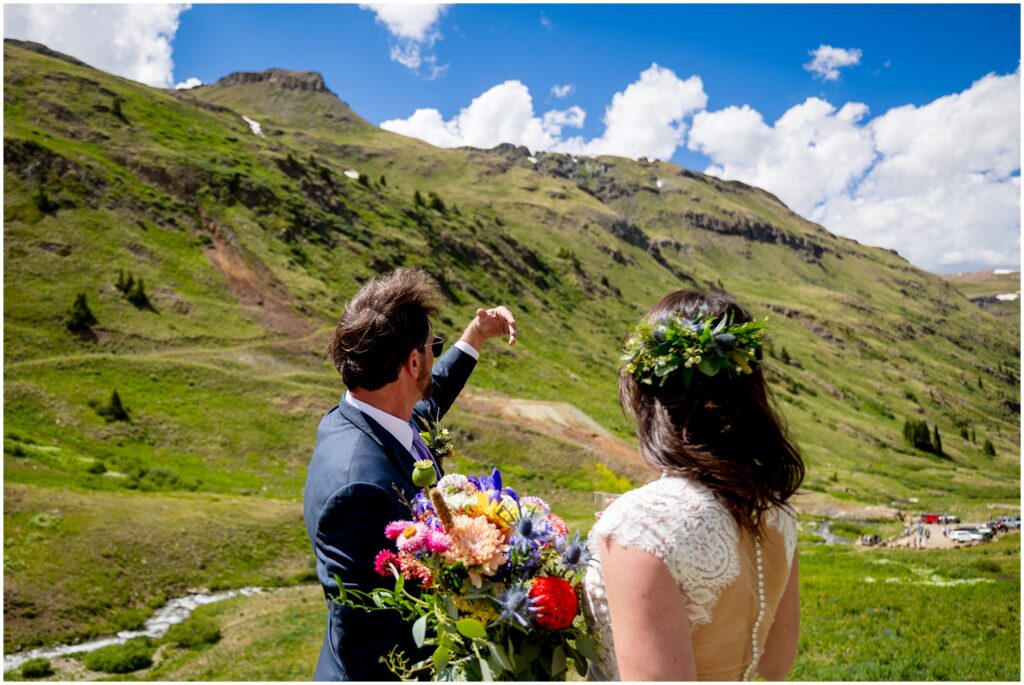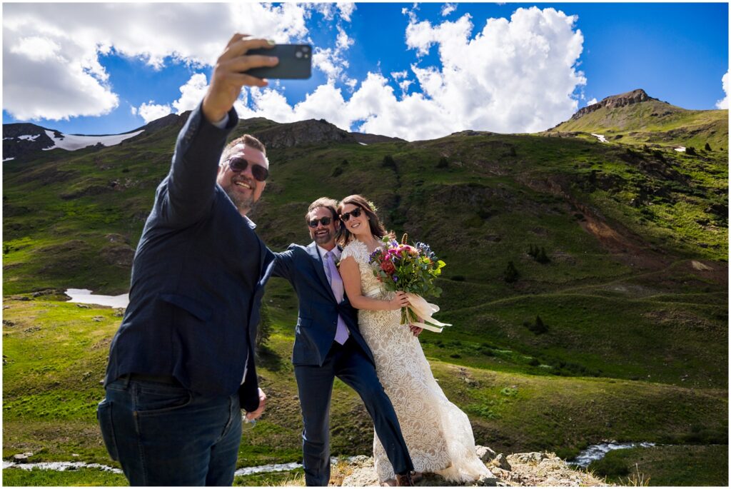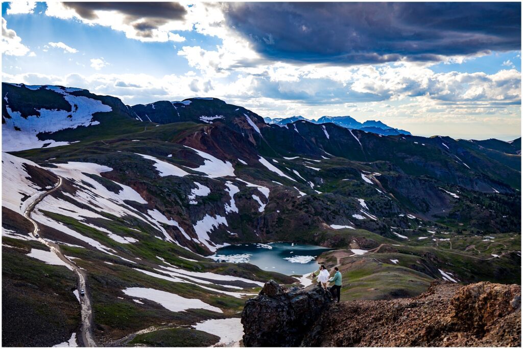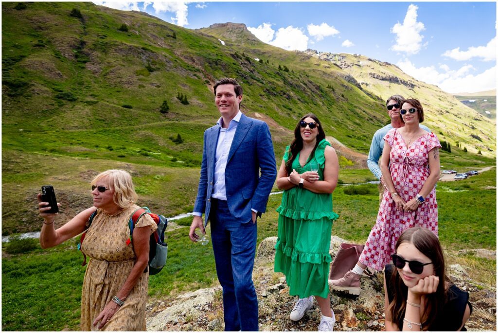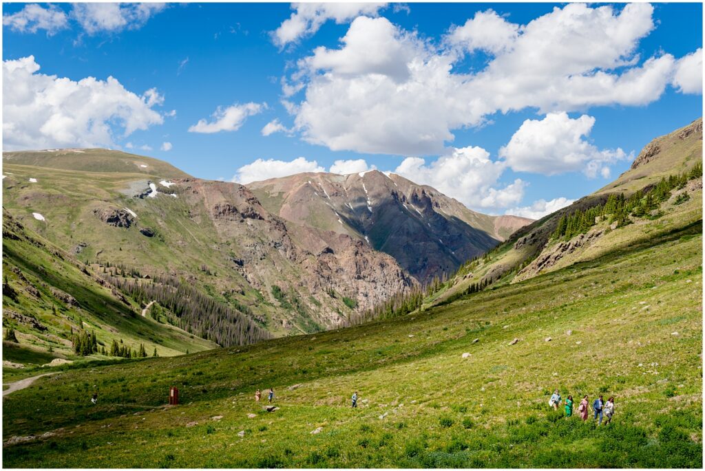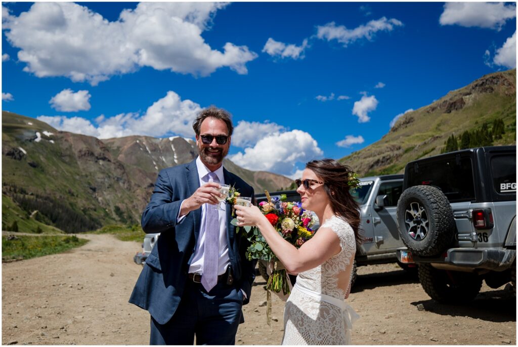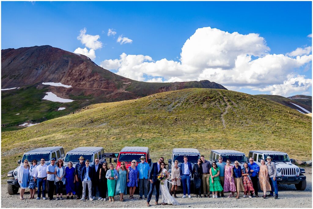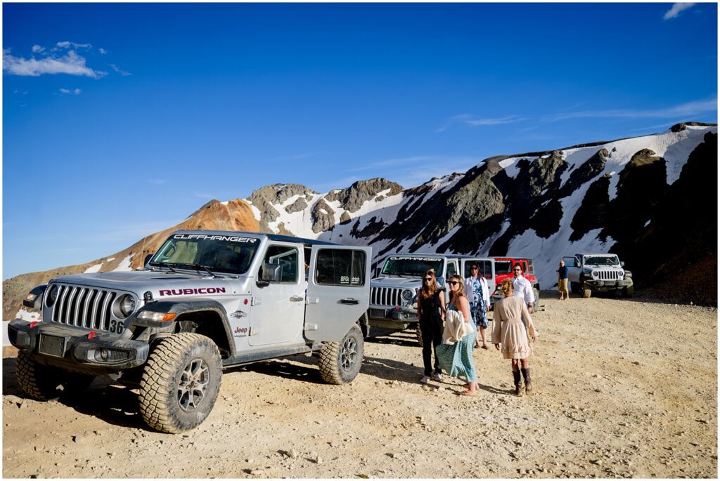 The morning of their elopement, Michael and Kelly had everyone rent a fleet of Jeep Rubicon’s, allowing them to navigate the challenging 4×4 road that leads from Silverton and over a few passes into American Basin. This thrilling journey not only added an element of excitement but also emphasized the couple’s love for exploration and the great outdoors. To add to the excitement – Colorado had a very late snow pack in 2023, meaning that the 4×4 roads were rather torn up and extra rough this year. Everyone certainly got the rugged Colorado experience that Michael and Kelly were hoping for.