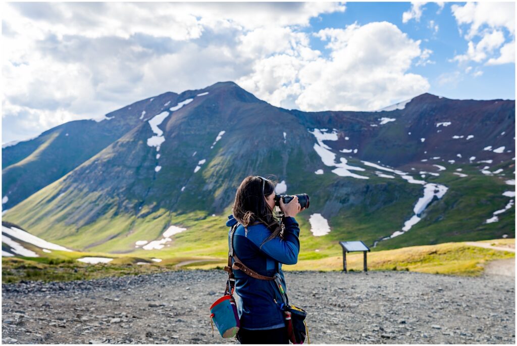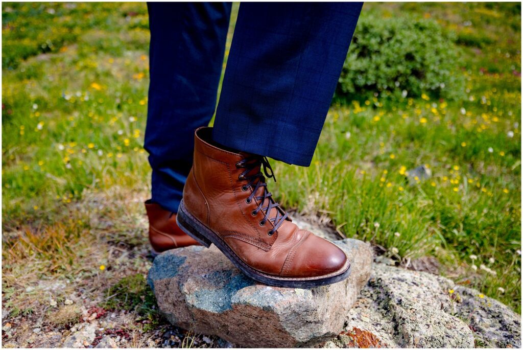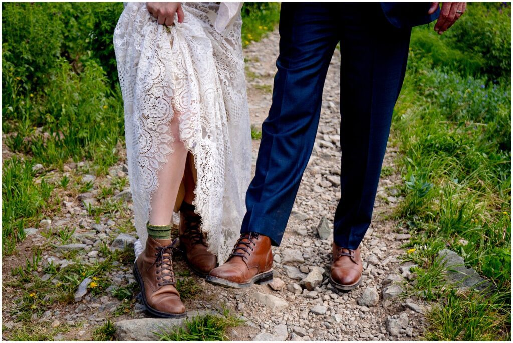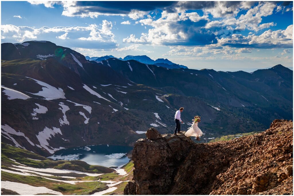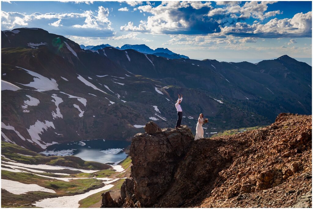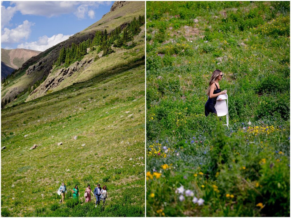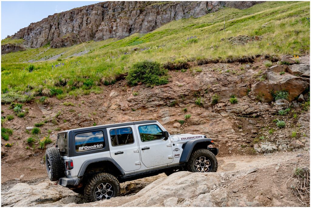 The morning of their elopement, Michael and Kelly had everyone rent a fleet of Jeep Rubicon’s, allowing them to navigate the challenging 4×4 road that leads from Silverton and over a few passes into American Basin. This thrilling journey not only added an element of excitement but also emphasized the couple’s love for exploration and the great outdoors. To add to the excitement – Colorado had a very late snow pack in 2023, meaning that the 4×4 roads were rather torn up and extra rough this year. Everyone certainly got the rugged Colorado experience that Michael and Kelly were hoping for.