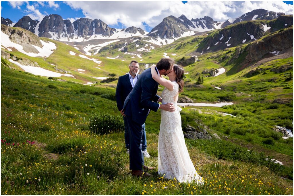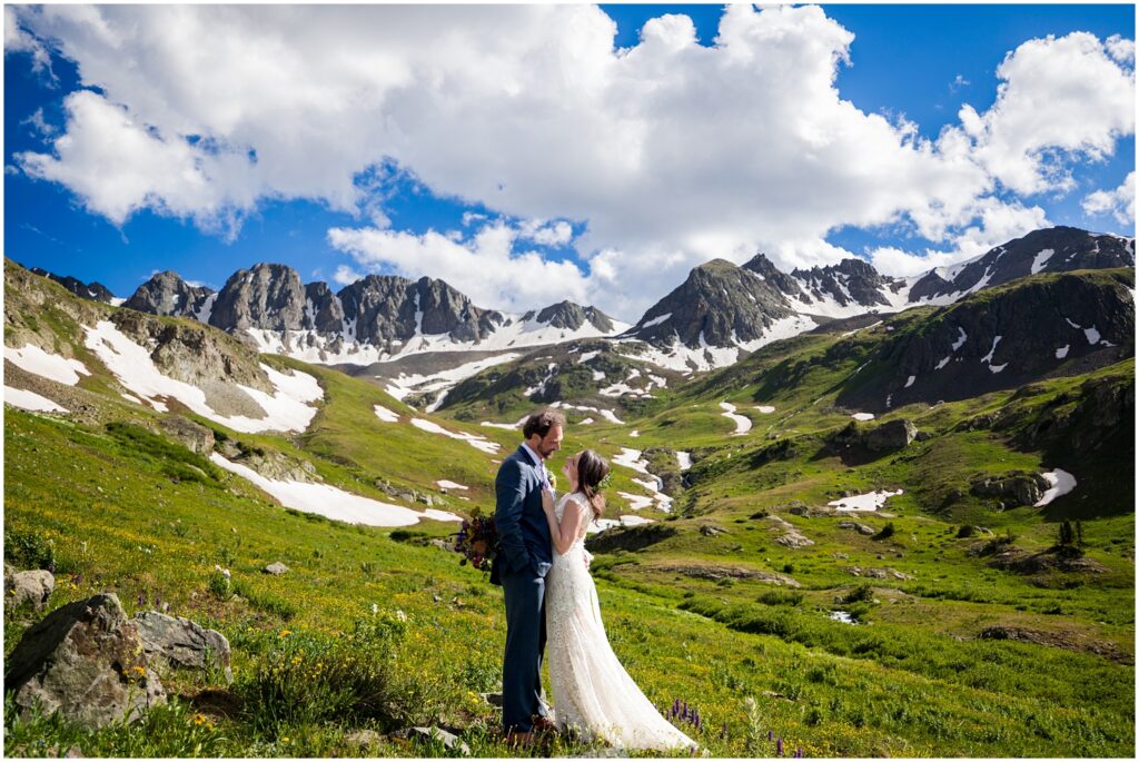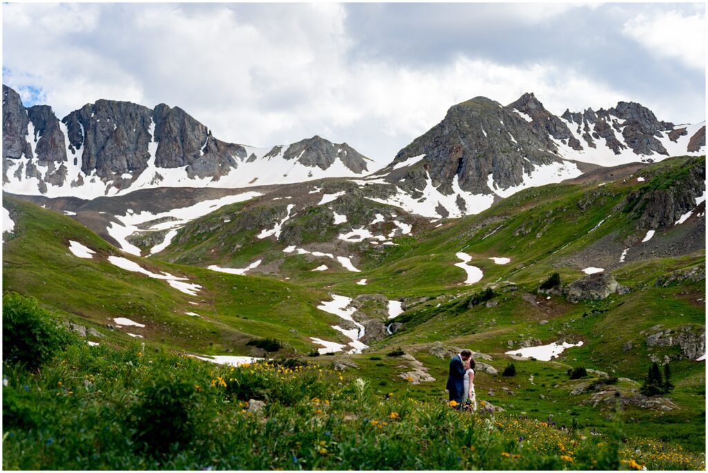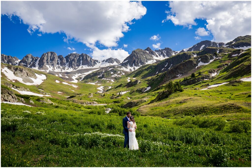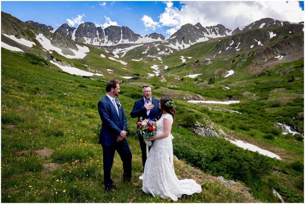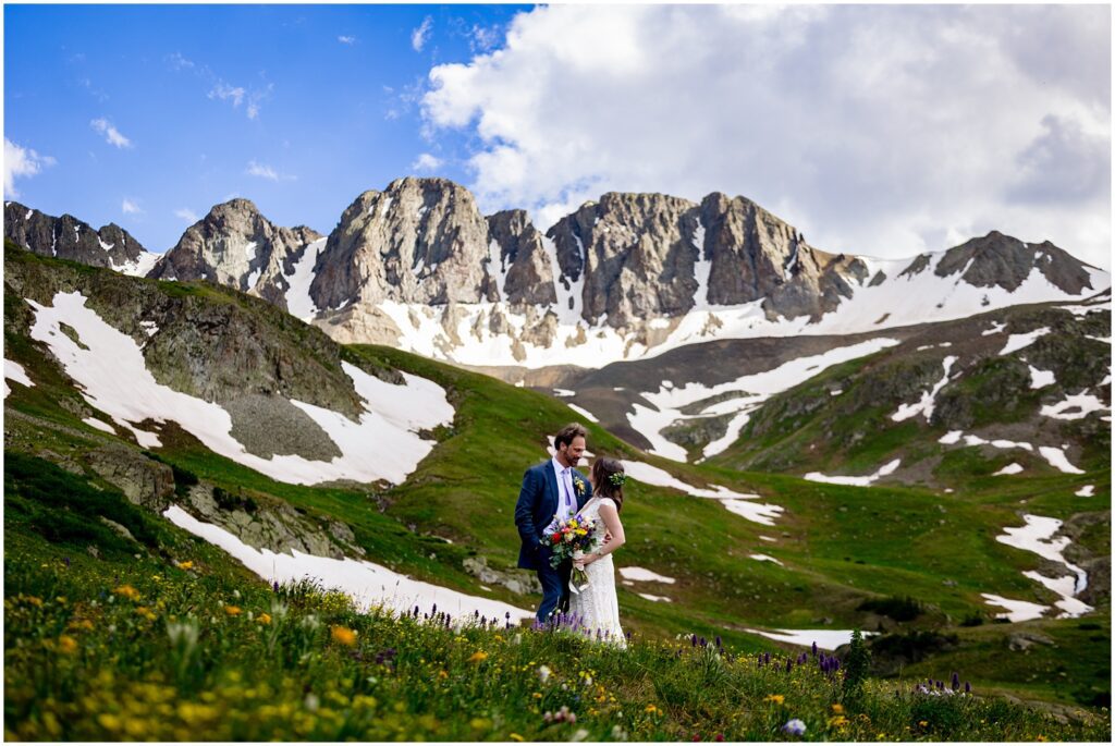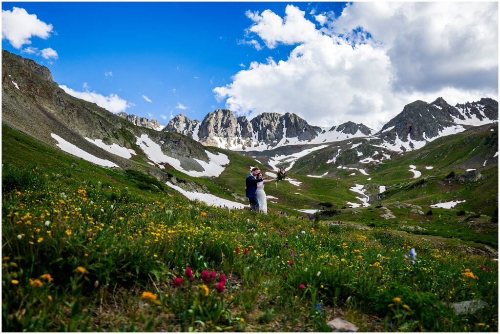 Upon arriving at American Basin, Kelly and Michael found themselves surrounded by a sea of wildflowers in full bloom. The vibrant colors of nature provided a picturesque setting for their intimate ceremony. As a Colorado elopement photographer, I was in awe of the natural beauty that enveloped us, making every shot a work of art.