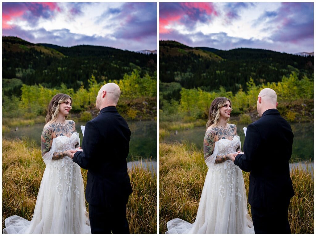 After an emotional ceremony, we watched the skies behind turn stunning shades of purples and pinks. For those wondering the difference between sunrise and sunset photos – I’ve found that sunrises tend to be on the Cooler-tones side (pinks and purples) while sunsets tend to be on the warmer end of the color spectrum (oranges and cyans).