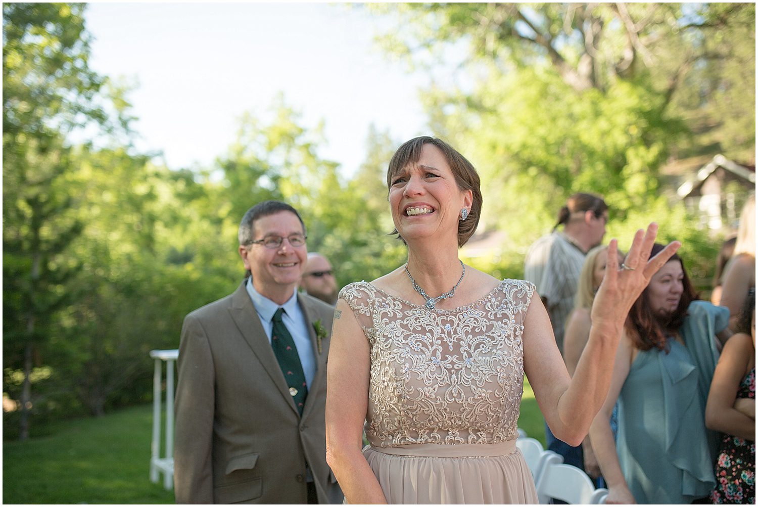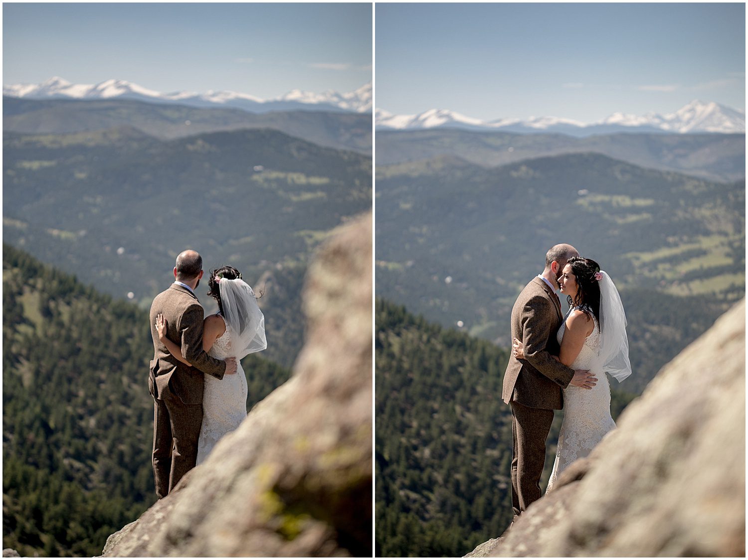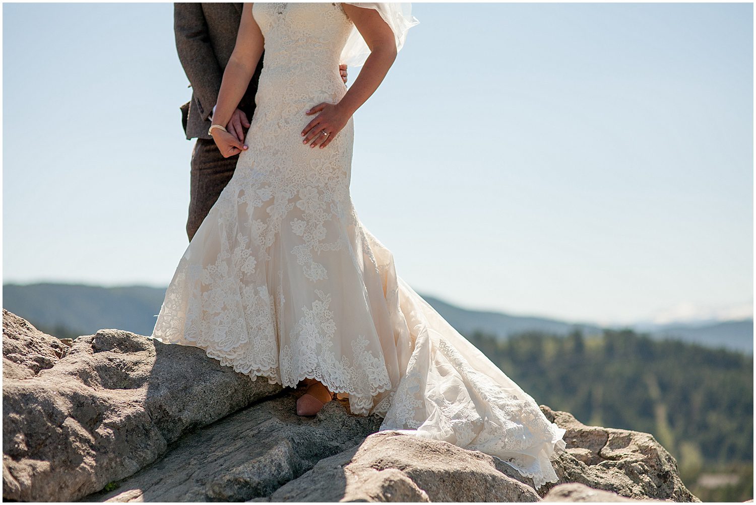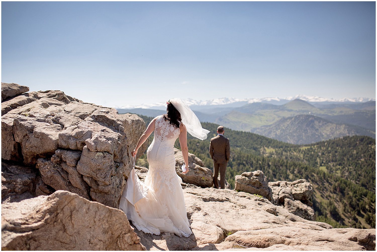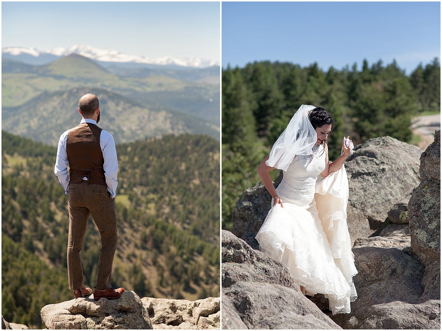 Once June finally got here – I was so excited to meet up with Jio and Kevin again to celebrate their wedding day. I just knew it was going to be a fun day all around. When my second photographer (the very talented Ashley Kidder) and I arrived, the first thing I obsessed about was her hankie. “Keep Your Shit Together”. My new favorite wedding detail to date. Once Jio was ready to go see her groom, we headed up Flagstaff Mountain to just over 8,000 feet at Lost Gulch Overlook. If you’ve never been, it’s a lovely lookout area, overlooking the Indian Peaks Wilderness and Longs Peak. For their first look, we made our way out onto the stunning rocky overlook (flats were DEFINITELY a good choice here. After spending a few minutes up at Lost Gulch, we headed back to the cars to head down the mountain towards their venue and stopping at Chautauqua Park for a few photo ops – Where I NEARLY STEPPED ON A SNAKE. I watched it wriggle away from my foot and got the willies – but there was no rattle on the tail so at least it was only a Bull snake. #NoThanks