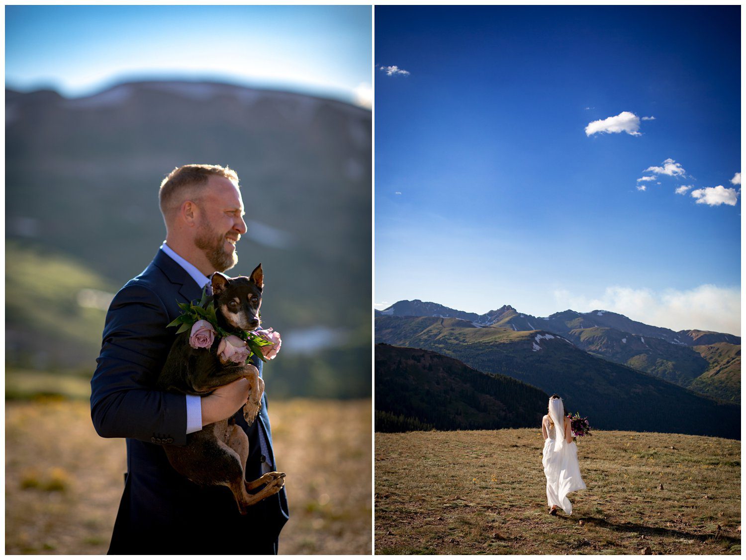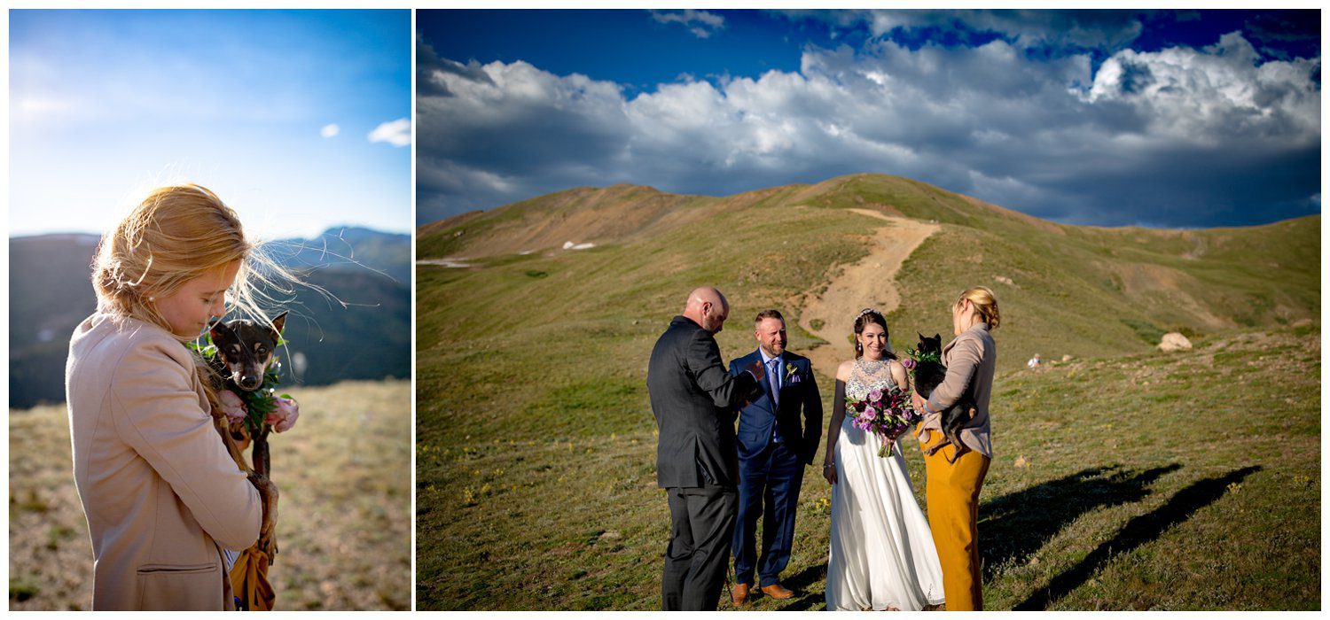 I met Esslie, Kendra (the amazing planner who worked with us on the day of), and Scott (the officiant) up at the Pass to prepare for the couple’s first look. We decided to ascent up the ridge a little bit to get a better view of the East wall of Arapahoe Basin – where Nathan would see his bride for the first time. We had a super special guest with us for their first look – Tyson the doggie, adorned with the cutest flower collar ever.