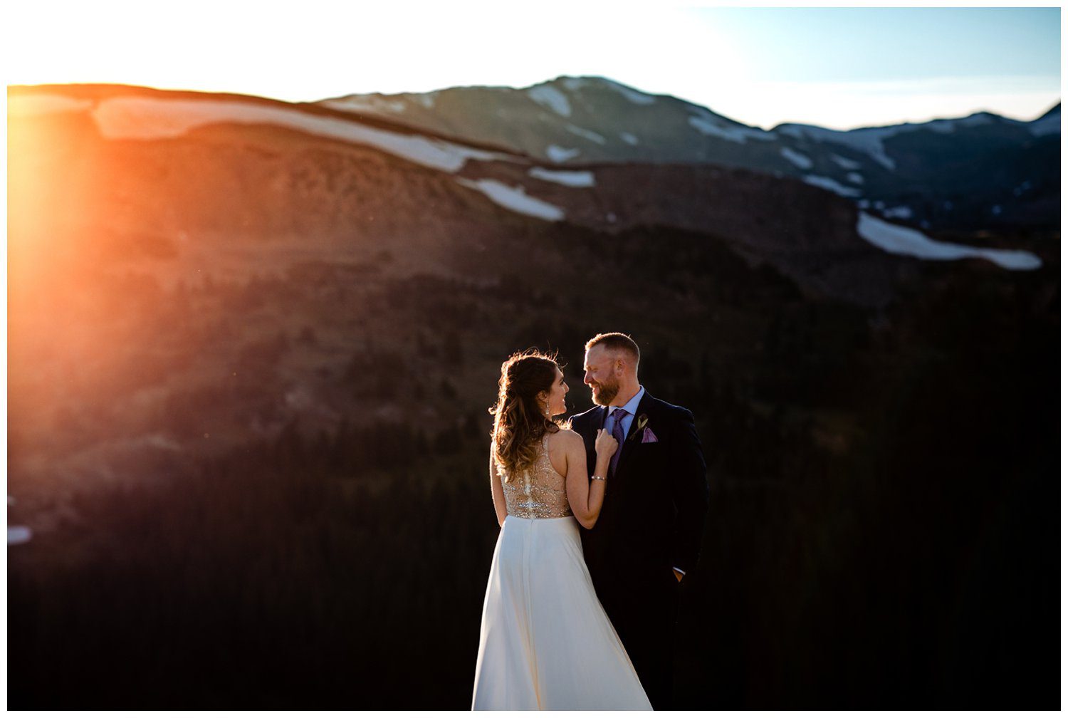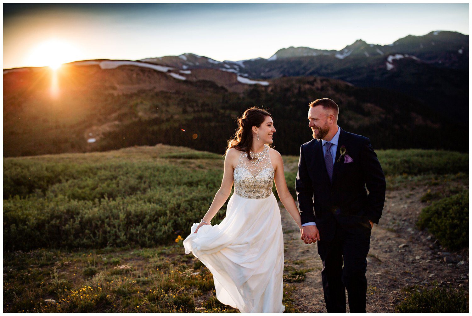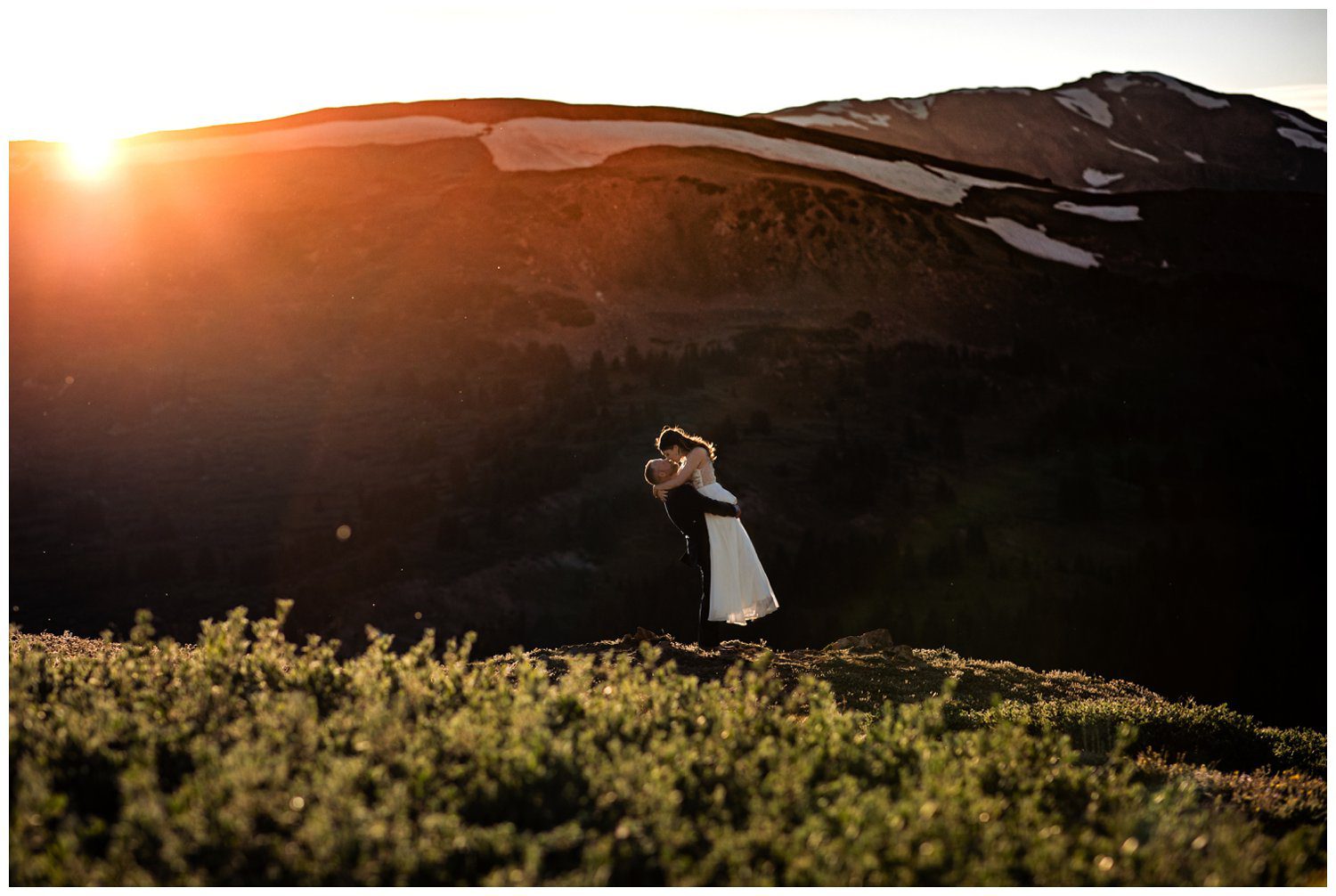 We began on the Southfacing ridge, and made our way across to the Northwest side of the ridge as the sun began to crest over Hagar Mountain. The look of light falling behind a mountain and giving off a glow as it crests is one of my absolutely favorite things to photograph. I think the light is so dramatic and beautifully bold. On the night of Esslie and Nathan’s Colorado elopement, we sure caught a light show. The sun would hit behind the ridge, and we’d slightly ascend up the trail to catch the light from a slightly higher angle until daylight faded. Throughout our phone conversations, I had told Esslie and Nathan about Alpenglow, and that Loveland Pass is unique in the fact that you can catch the pink colors at sunset due to the Eastern facing mountainsides. Colorado did not disappoint – the entire East Humboldt Mountain Range turned amazing colors of pink and red.