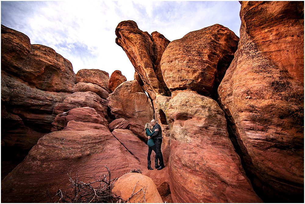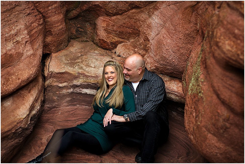 I had seen some images of a beautiful cave near the Red Rocks area, but after a few weeks of looking for where it might be I couldn’t find the exact spot I wanted to take them to. We decided to meet at their wedding venue, the Manor House in Littleton, and Dave had a neighborhood park in the area that he grew up going to and thought would be great to photograph at. We headed over there, and it was indeed a super cool place. As we were walking around, he let me know that there was a cave at the park, and we could go check it out. As we approached the cave, I recognized the light coming in – it was the area that I had been searching high and low for! Anyone who’s photographed with me knows that I don’t have a “poker face”, my excitement was quite apparent. WE FOUND IT, and all by chance. Lindy and Dave let me know that this park was one of the places that they went when they first began dating – they would walk around the park together.