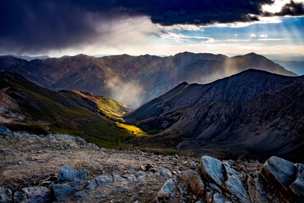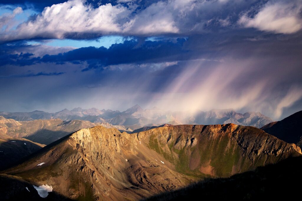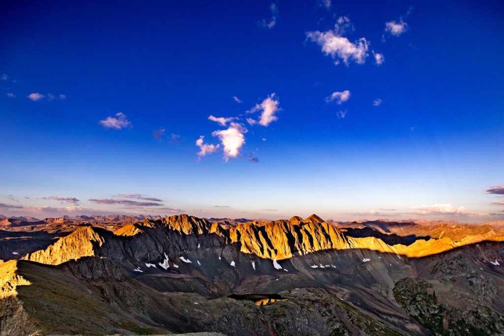 We hiked up by the light of our headlamps, to just below the technical summit. We started our morning at this stunning outcrop, as the winds were picking up and it looked as if a storm was heading our way. As anyone who spends time in high altitude knows, Colorado weather be CRAZY (an not something to mess with). We took a few minutes to capture the Alpenglow shining back on the basin, then started our way back up to the true summit.