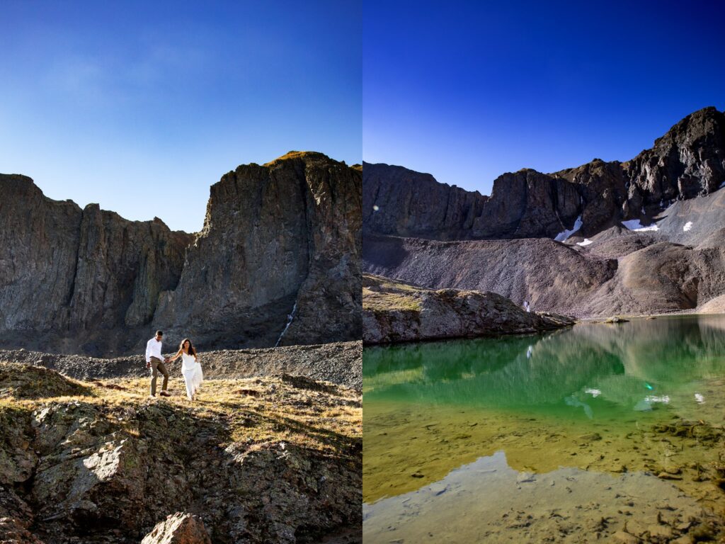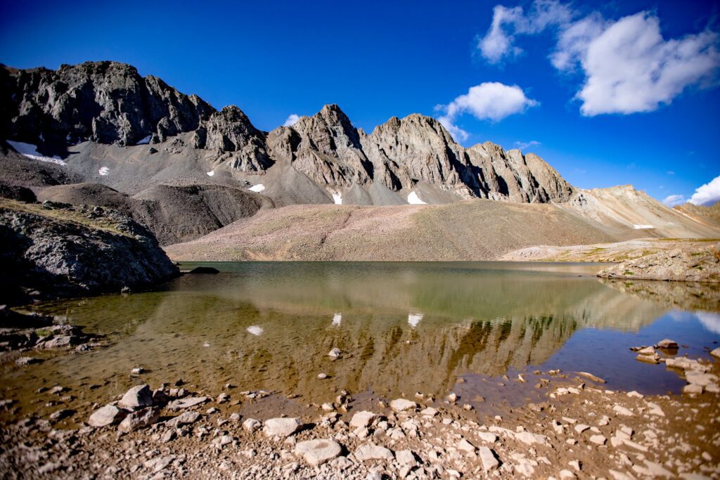As we made our way down the mountain back into the American Basin, we stopped by the teal blue waters of Sloan’s Lake for a breather and some photos. The lake sits right at the edge of the basin and the talus field of Handies. The water was SO teal with hints of green. Since we had passed the lake in the dark on our way up to the summit, it was a stunning surprise to see how beautiful the lake truly was.