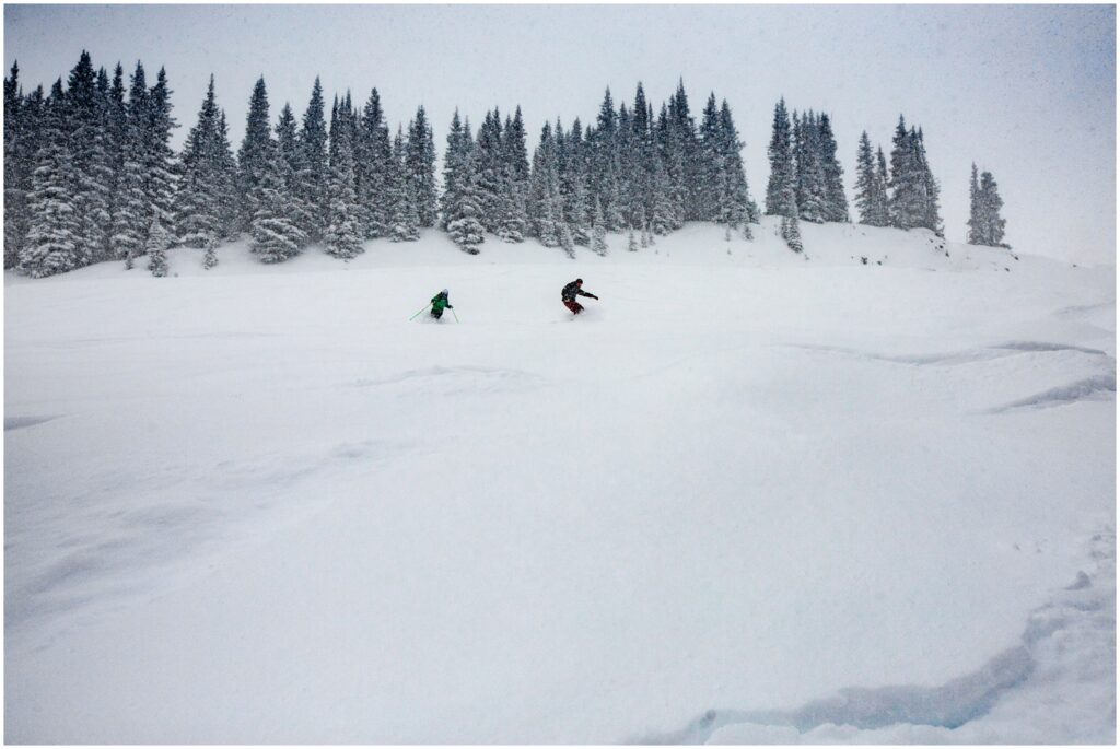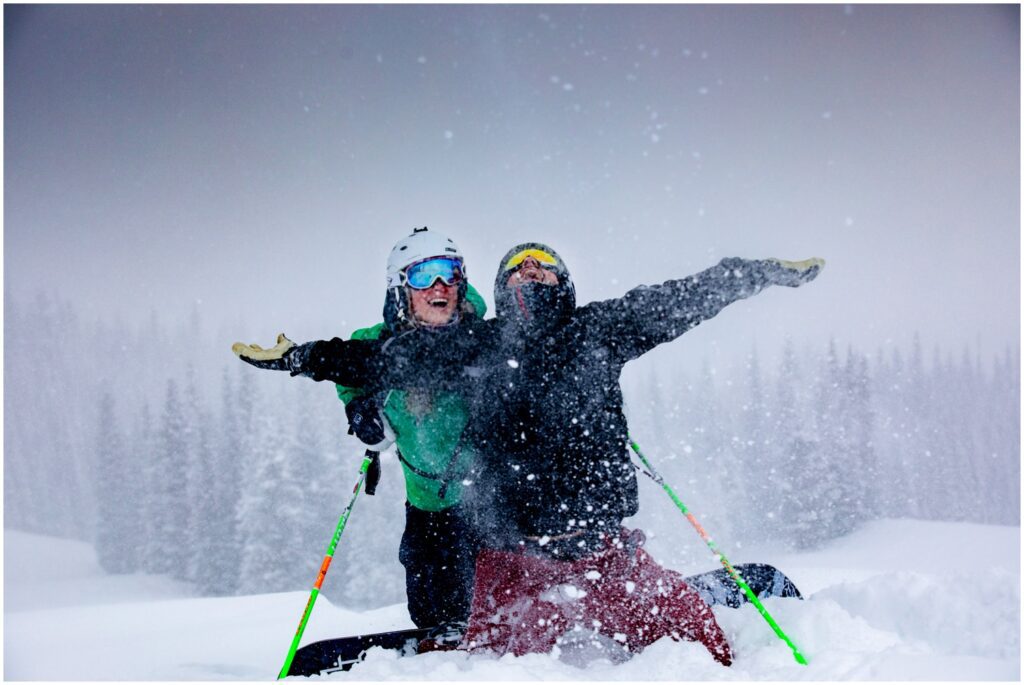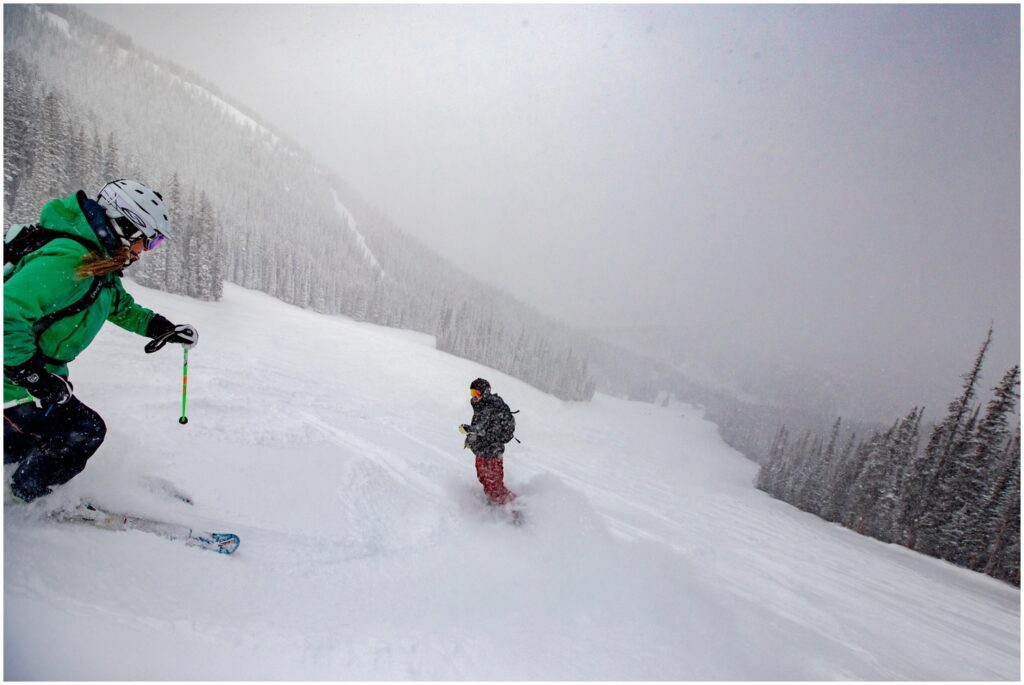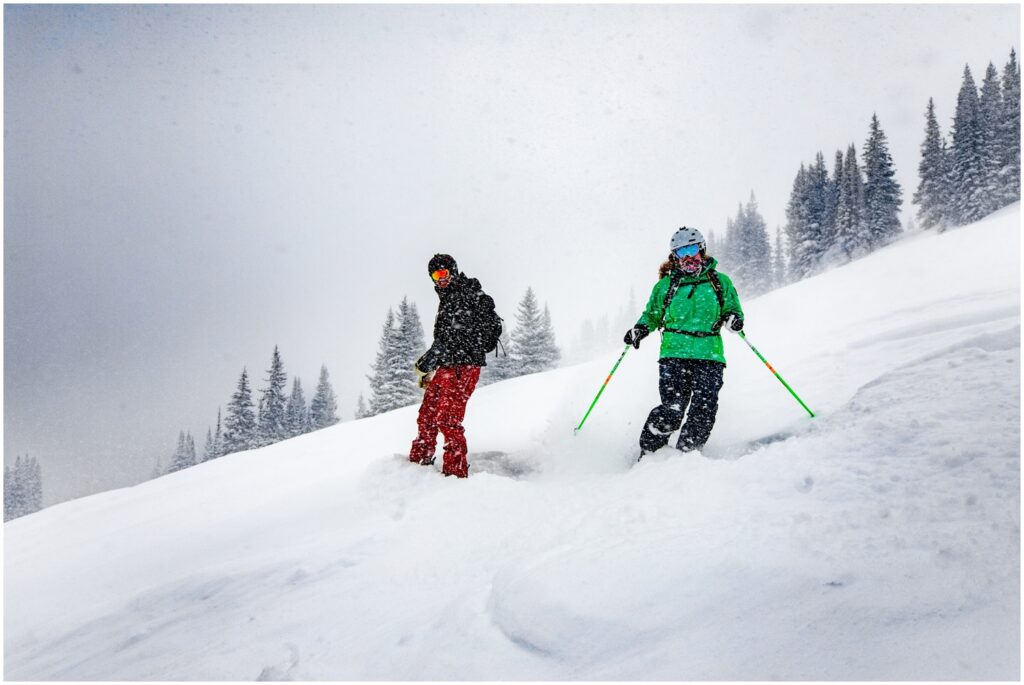 When Becky and Pete talked about having an adventure for their engagement session and brought up skiing – I was SOOO EXCITED to shred some pow-pow with them. We met at the base of Vail mountain, and headed up to the infamous Back Bowls. To say there was a bit of powder would be a severe understatement. We walked out into at least 18″ of fresh snow that had fallen the night before. SO MUCH AMAZING FLYING POWDER!!! After boarding through that much powder, I actually bought special lens caps to help keep my lenses clear of any snow – as I kept finding myself having to wipe off my cameras between shots.