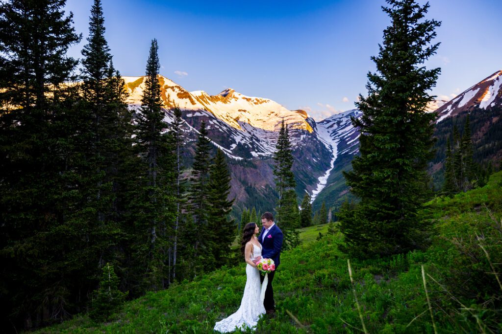 Just before the sun came up, I met A and Z at their AirBnB so we could all head up the 4×4 road in my vehicle to catch Alpenglow over the rolling green mountains near the West Elks. Coming with us for touch ups was Crystal with Wild Brides Backcountry, a hair and makeup artist who comes on all types of adventures. If you’re looking to have an adventure for your elopement, certainly check out her work.