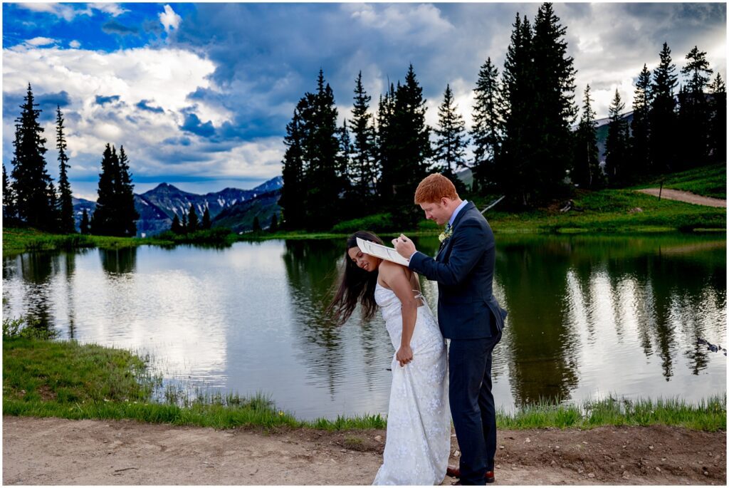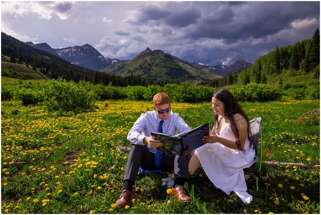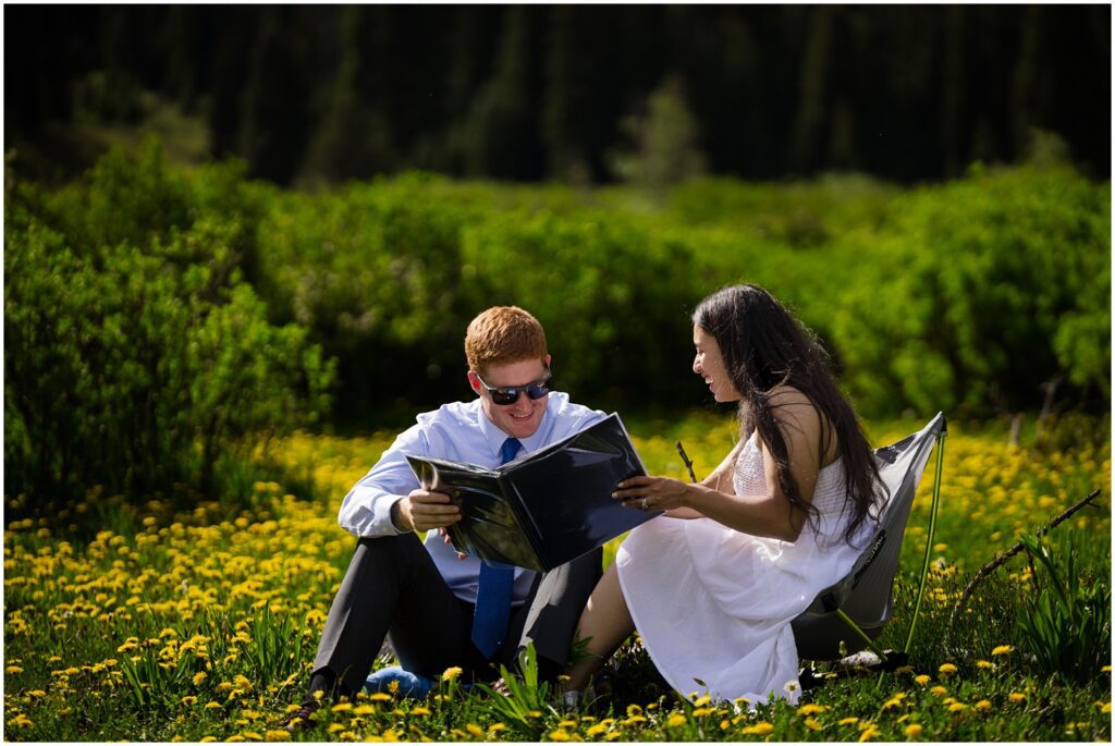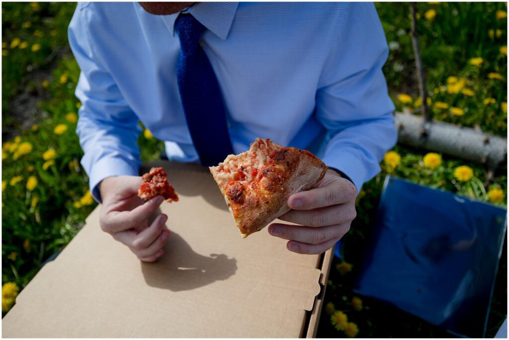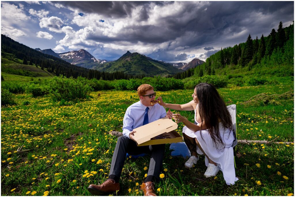 After our first location, we called in a to-go pizza and picked it up to have a picnic in a field next to one of the rivers that runs through the valley. I had a pillow and my backpacking camp chair in the car – which served for some great seating to eat a slice then read all the letters their loved ones had written for them. This is one of my favorite things to see couples do on elopements – ask family and friends to send them a note or Email to read together on their wedding day.