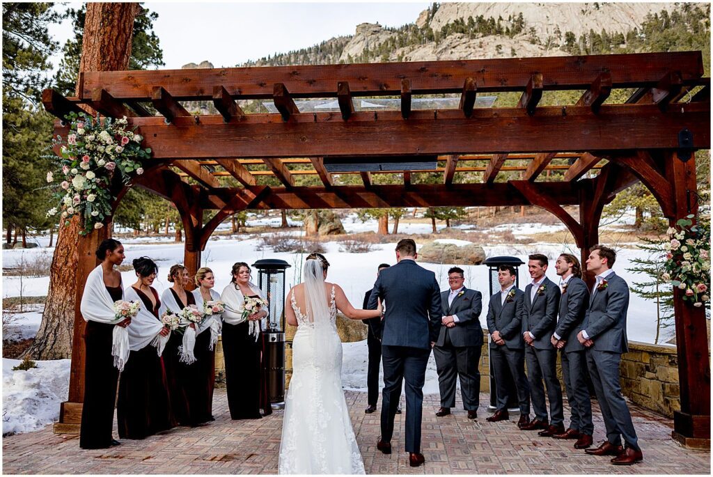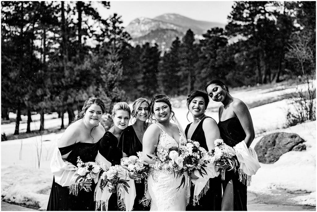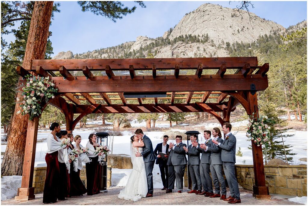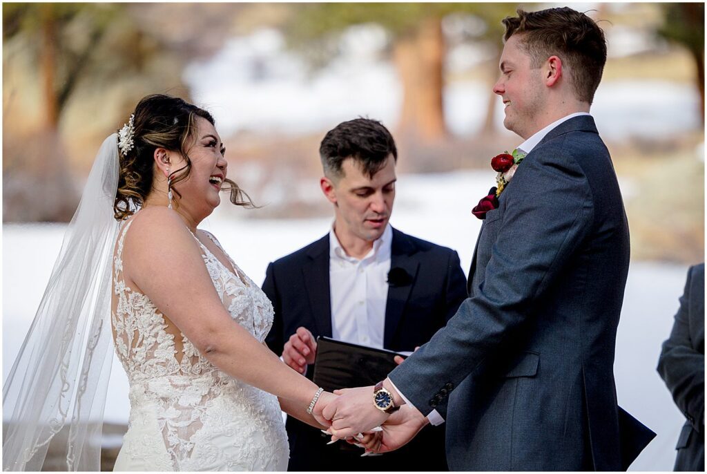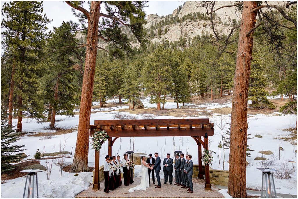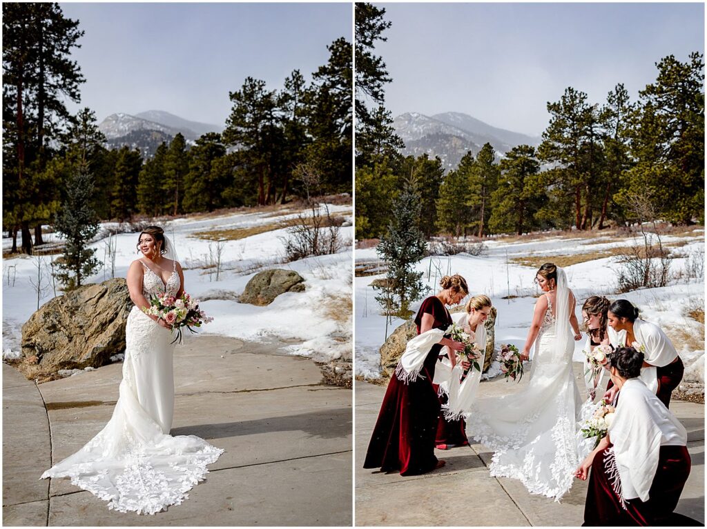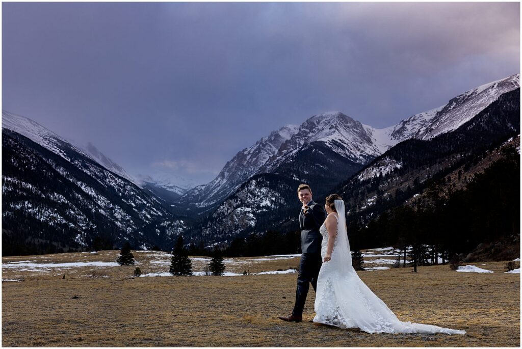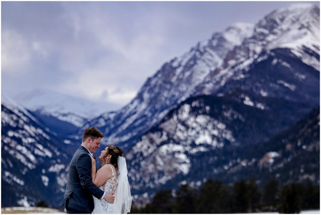 The beautiful landscapes of Rocky Mountain National Park are an amazing place for couple’s portraits, and the close proximity to Della Terra makes traveling there for photos incredibly accessible. However, the weather in the mountains can be unpredictable, particularly in the winter months. Prior to the ceremony, the skies were cloudy and the mountain views the Park is best known for were blocked by low-lying clouds.