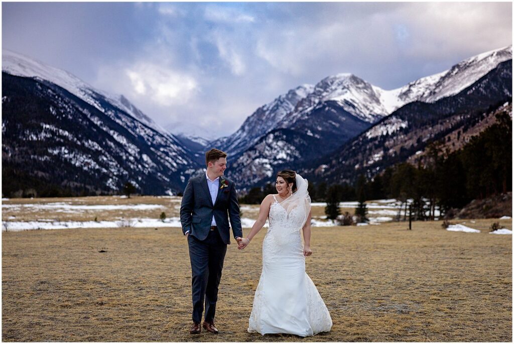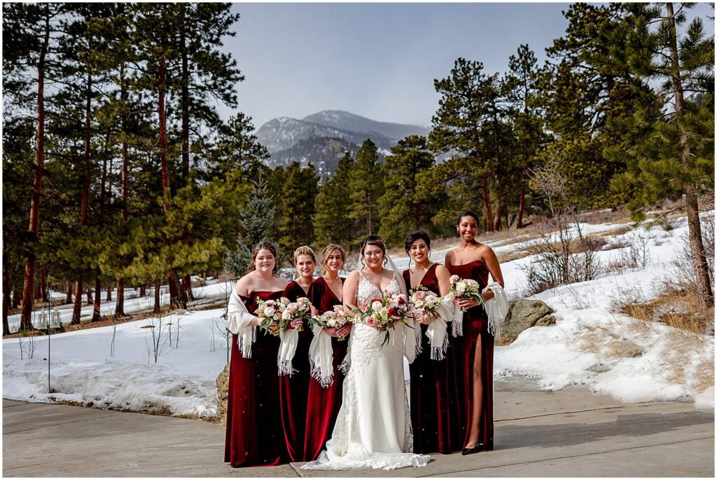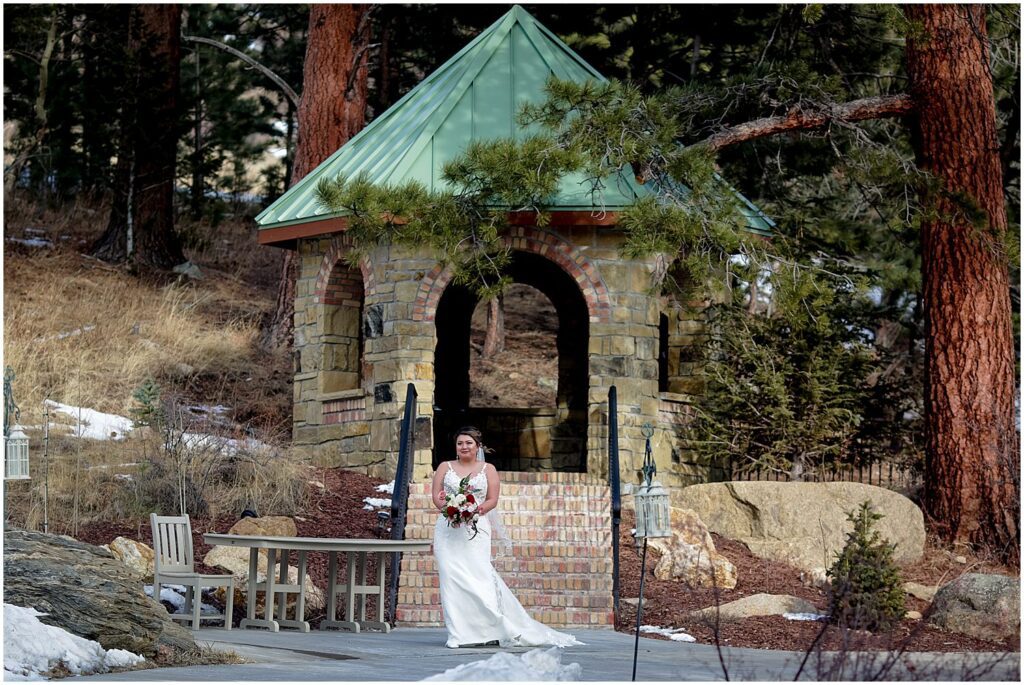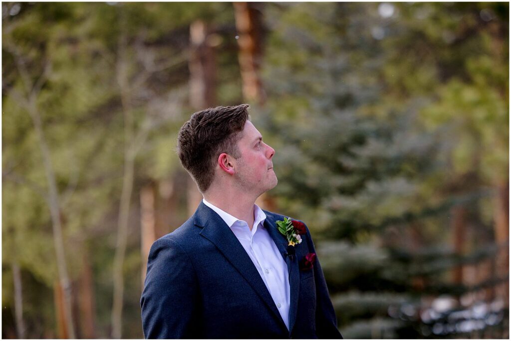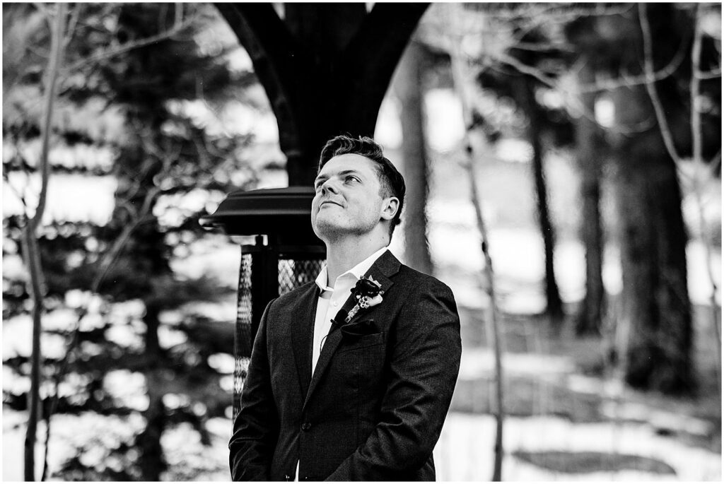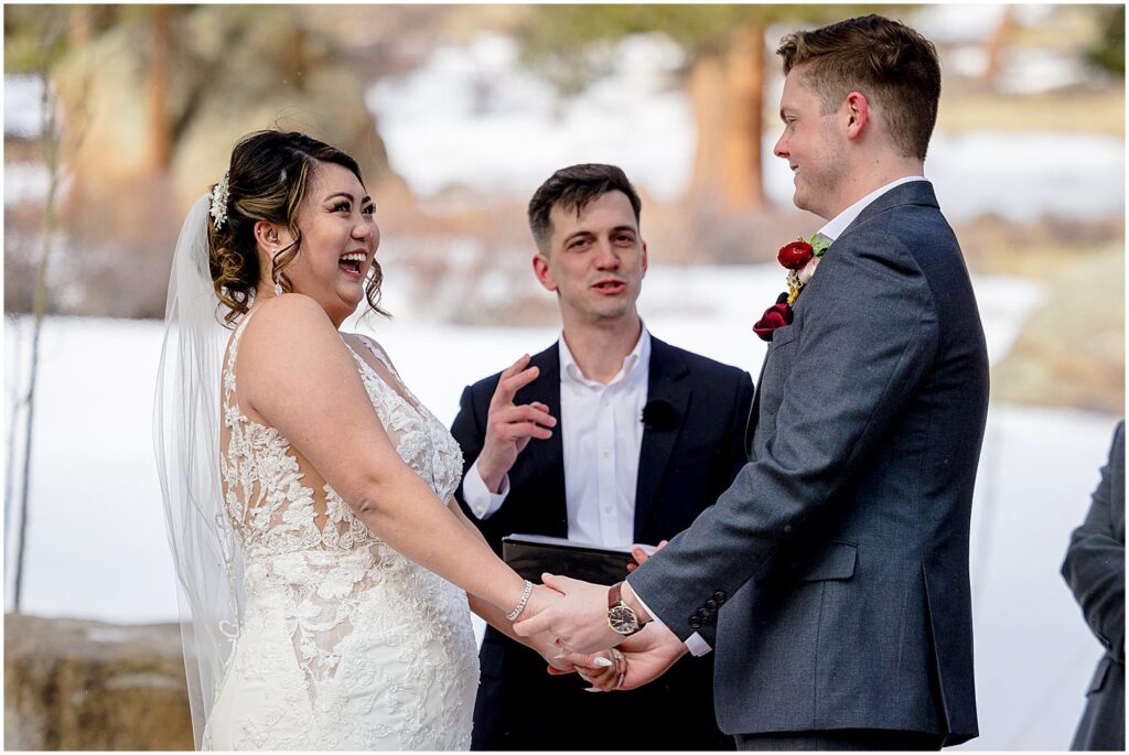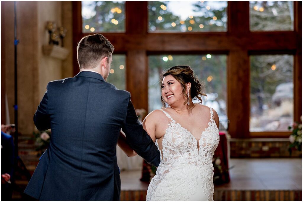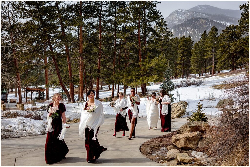 The beautiful landscapes of Rocky Mountain National Park are an amazing place for couple’s portraits, and the close proximity to Della Terra makes traveling there for photos incredibly accessible. However, the weather in the mountains can be unpredictable, particularly in the winter months. Prior to the ceremony, the skies were cloudy and the mountain views the Park is best known for were blocked by low-lying clouds.