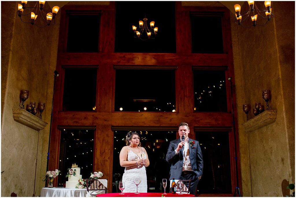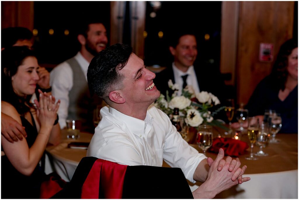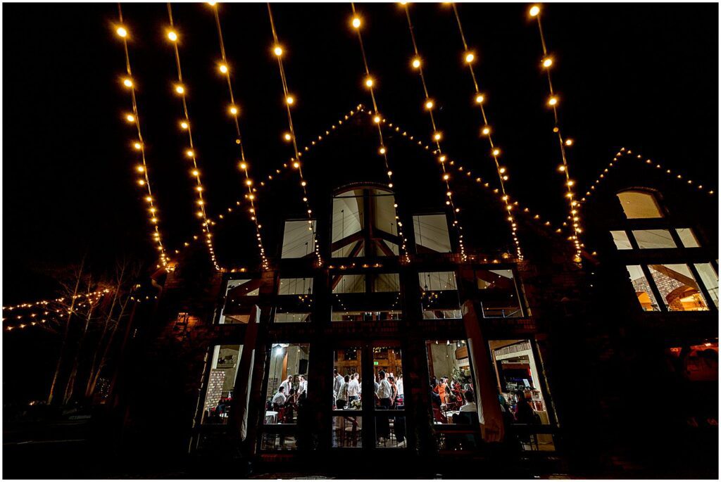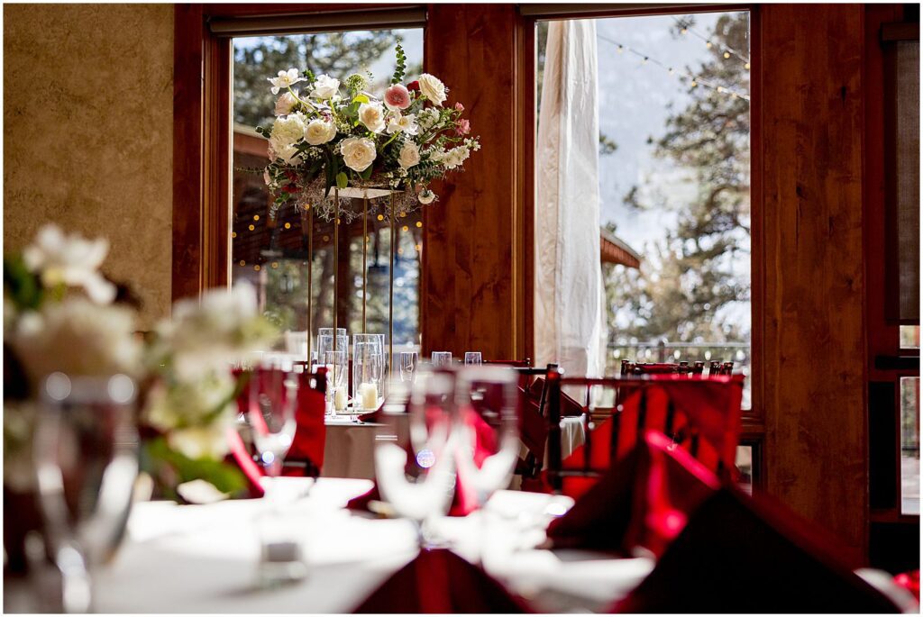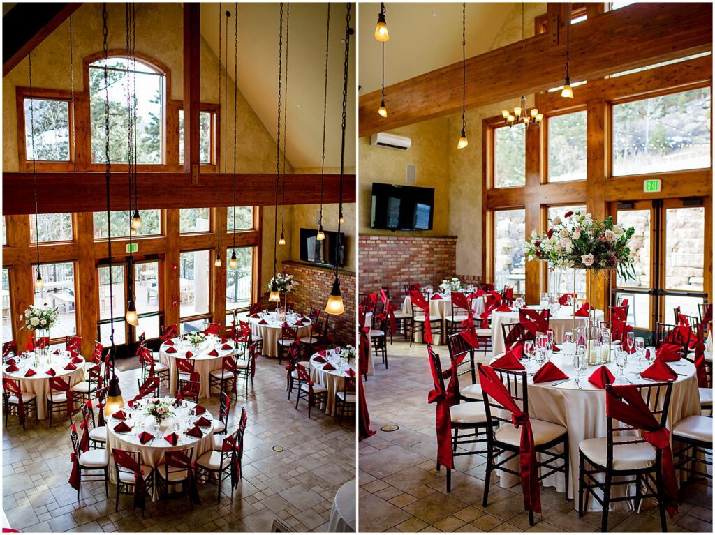 The reception began with a cocktail hour where guests were treated to hot coffee, or the naturally warming effects of an alcoholic beverage, along with a selection of hors d’oeuvres. The guests mingled and chatted on the upper floor, taking in the stunning views of the mountains and winter wonderland outside.