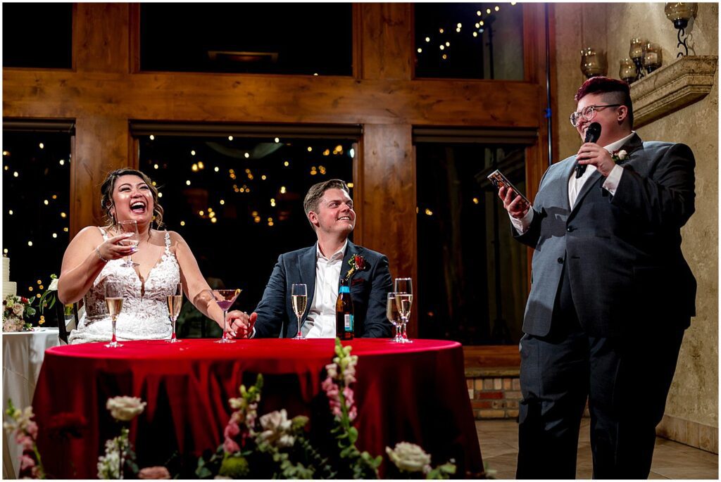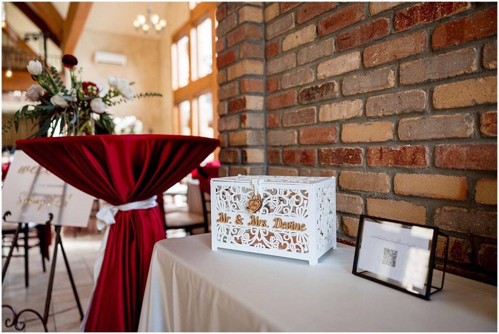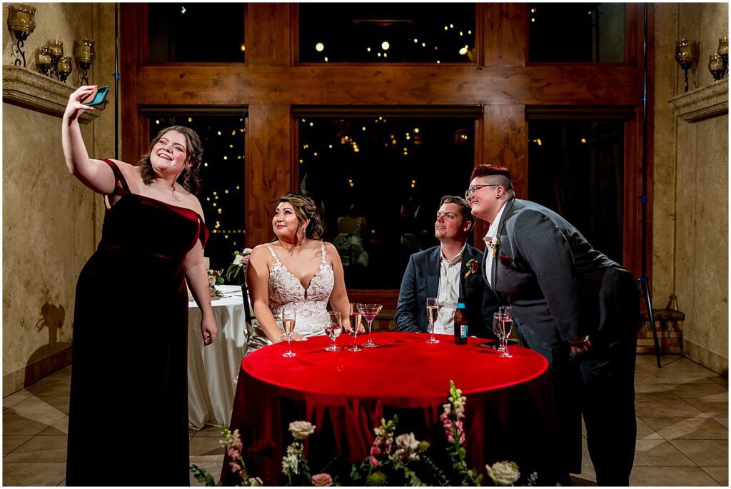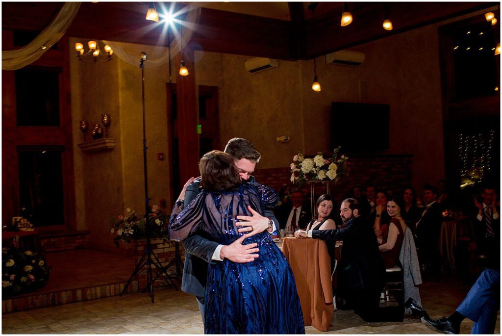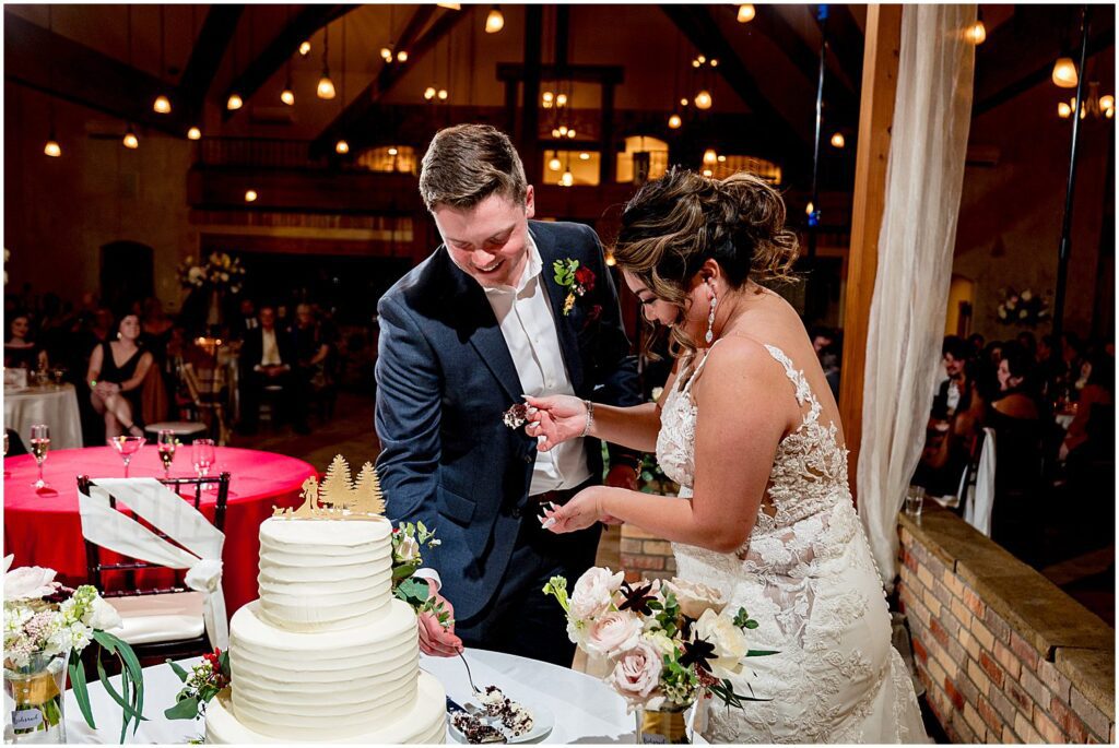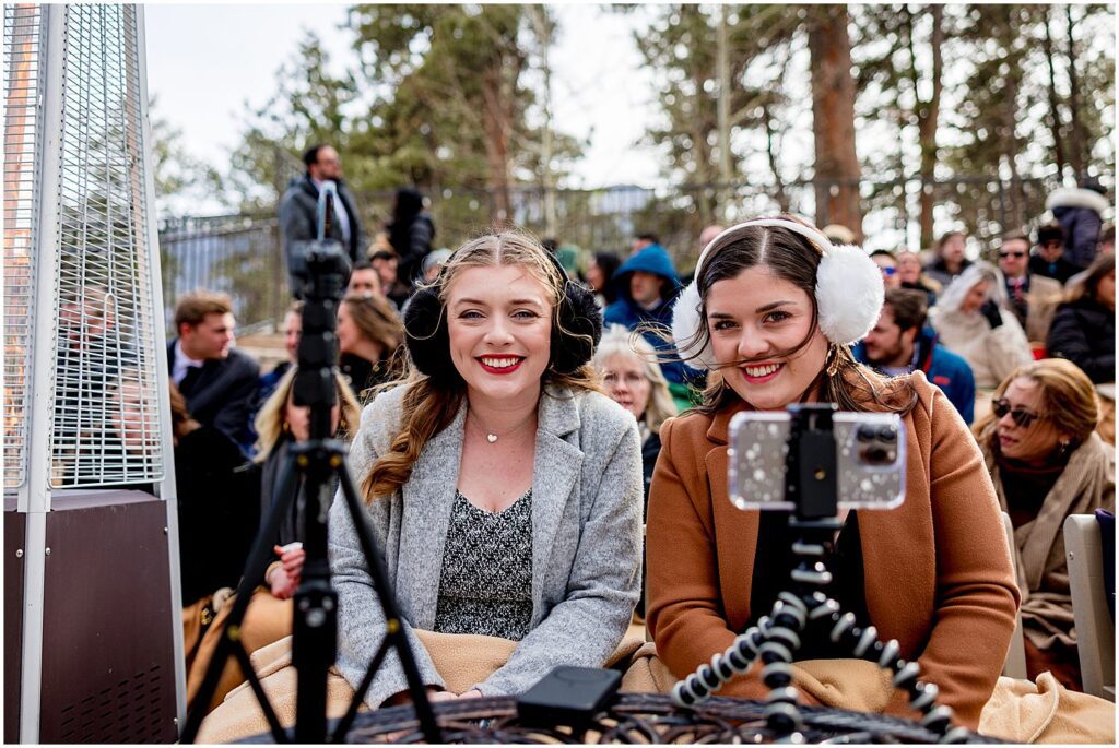 The reception began with a cocktail hour where guests were treated to hot coffee, or the naturally warming effects of an alcoholic beverage, along with a selection of hors d’oeuvres. The guests mingled and chatted on the upper floor, taking in the stunning views of the mountains and winter wonderland outside.