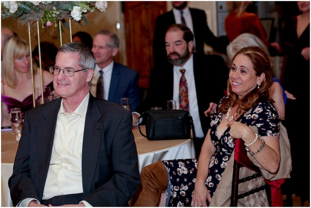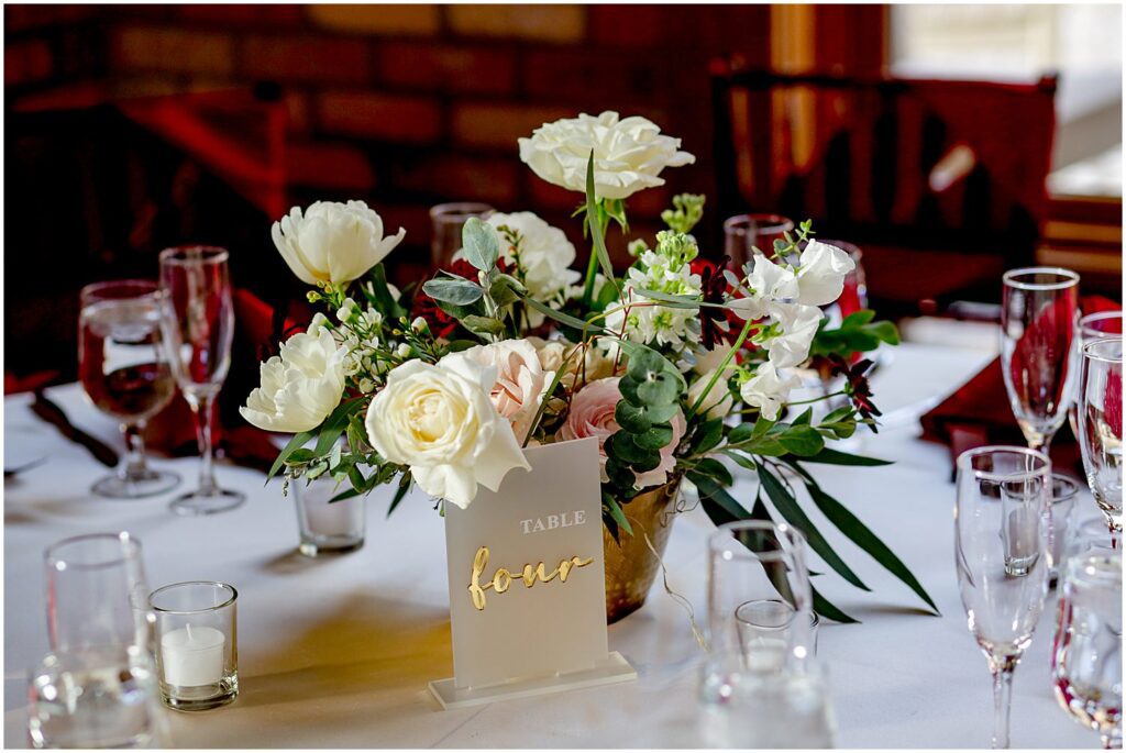 Once the bride and groom sealed their vows with a kiss, the wedding guests all moved inside the chateaux to continue the celebration. The warmth of the indoor setting was a welcome relief from the cold outside. The chateaux was beautifully decorated beautifully by Lace and Lilies – with large floral centerpieces and candles, creating a cozy and inviting atmosphere.