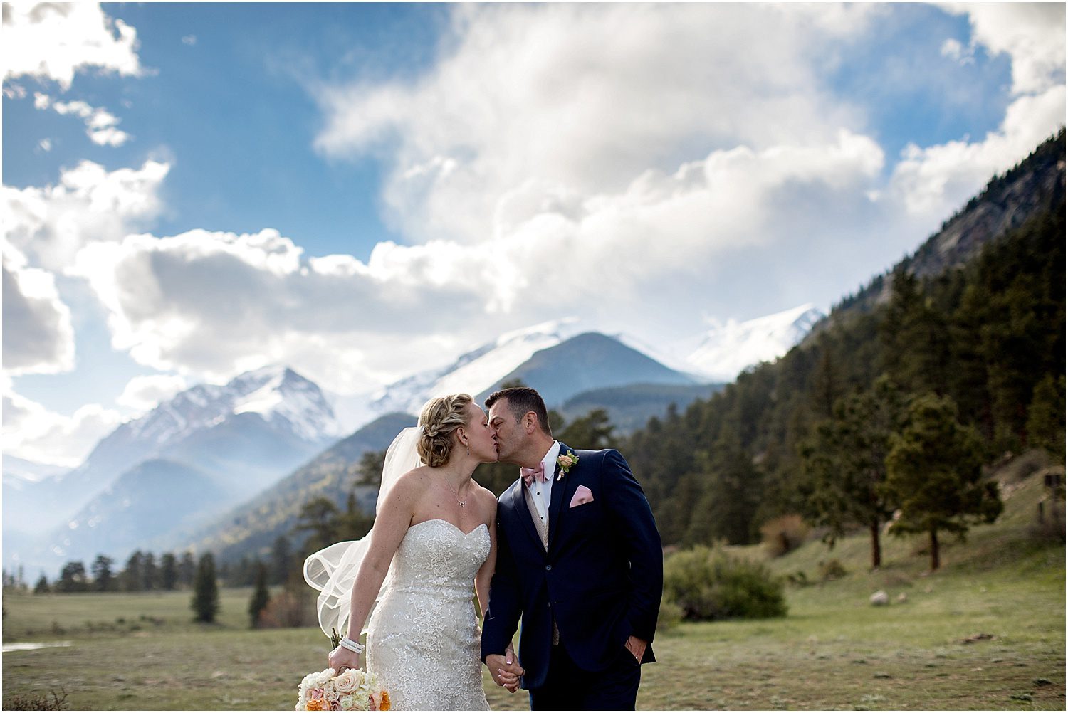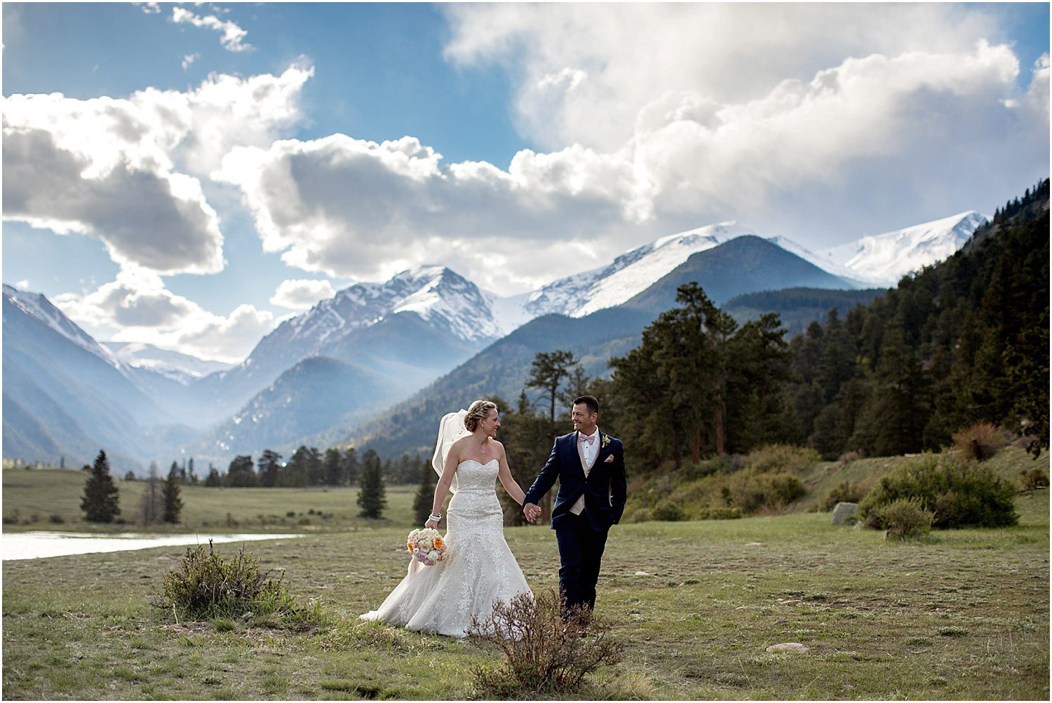 After their vows and the throwing of rose pedals to celebrate, we headed into my favorite place in the universe – Rocky Mountain National Park. With a commercial permit, which I ALWAYS carry on me, you can take portraits in this majestic place. Since Della Terra is on the 34 side of the park, we headed to Horseshoe Park and Sheep Lakes for a few epic pictures. One of my favorite things about the Rocky Mountains in spring is they’re still snow capped – the contrast of the snow on the peaks against the blue sky is one of the reasons I live here in Colorado. Needless to say, my good ole’ Colorado mountains did not disappoint.