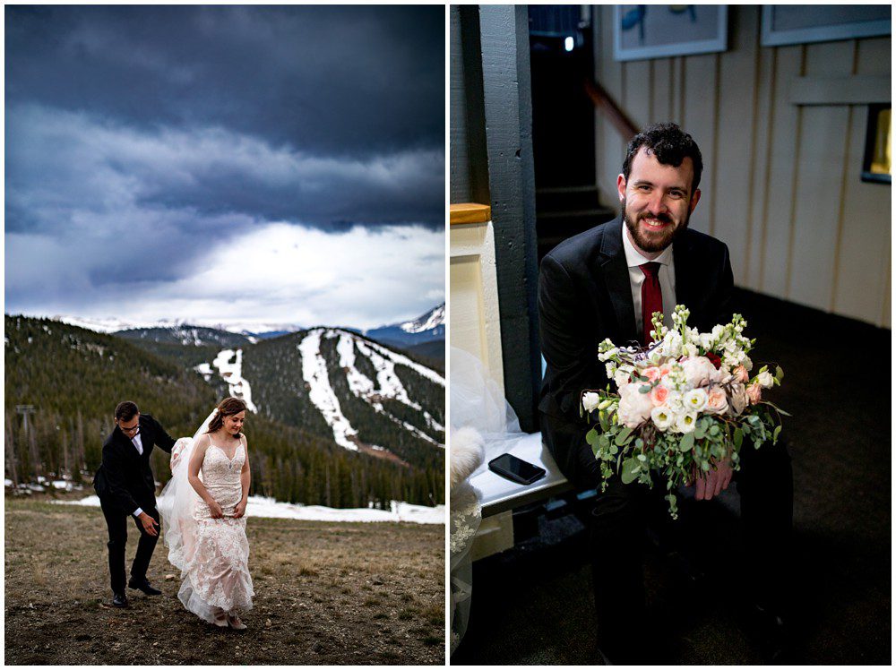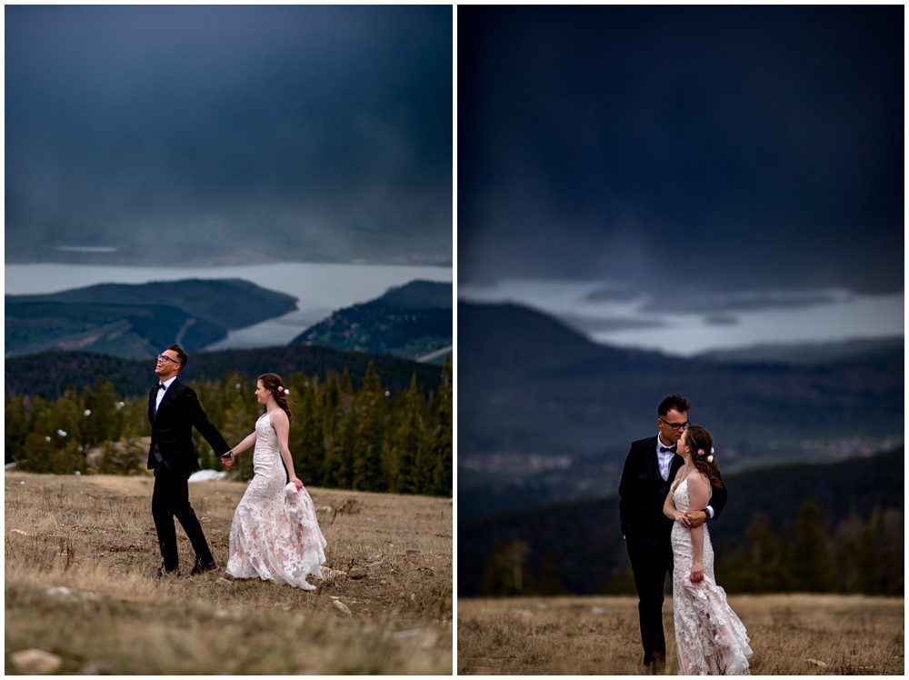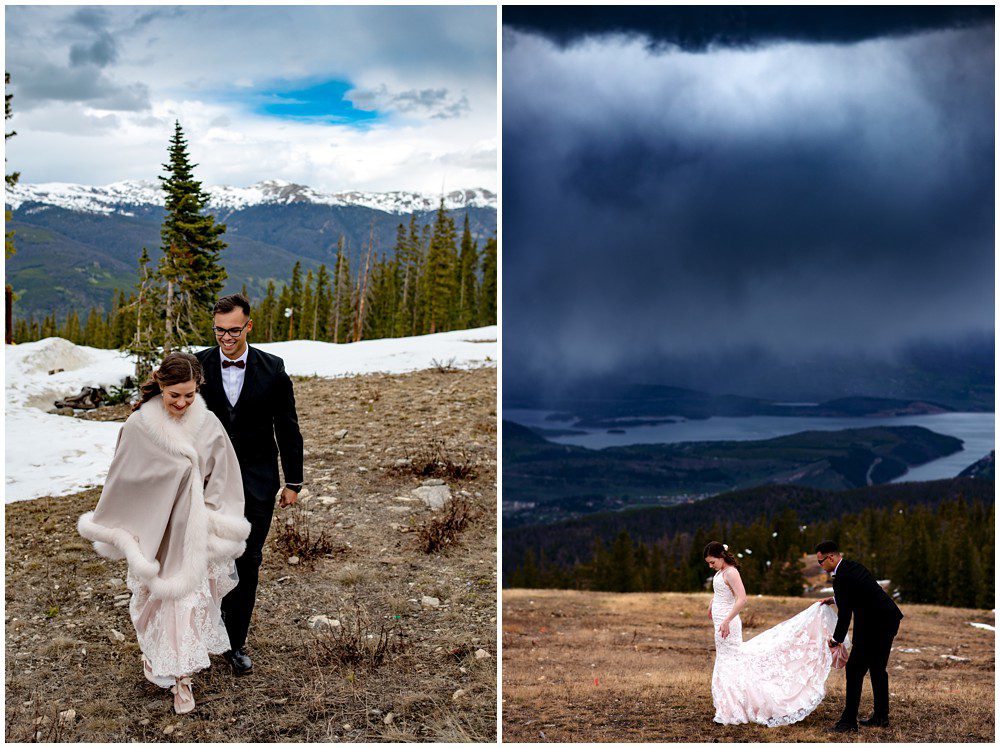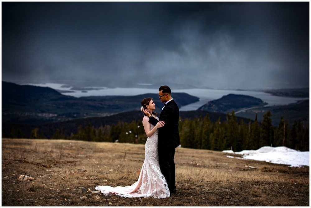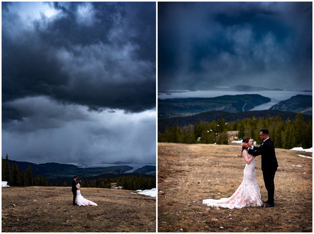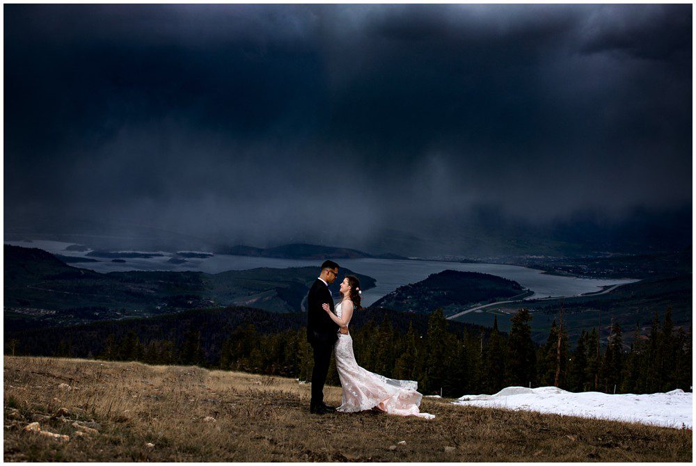 This year has been especially interesting for weather – as the summer had quite a cold start. The temperatures didn’t rise into the 90’s until July. On June 22, 2019 – Maddie and Braton were married on Keystone Mountain. Just following the summer solstice, they had their wedding on the first official day of summer. We had been watching the weather report the weeks leading up to the wedding day, and knew that we’d be heading up in the mountain with storms approaching. In true Colorado fashion, the clouds opened up and a massive storm approached the mountain. Starting with rain and a thunderstorm, the skies turned a deep blue. After a small clearing of nice weather, the snow came in. The forecast was for 8-12 inches, and I’m sure we ended up hitting at least 8″ by the end of the evening. A massive summer snow had hit for the first time in nearly a decade.