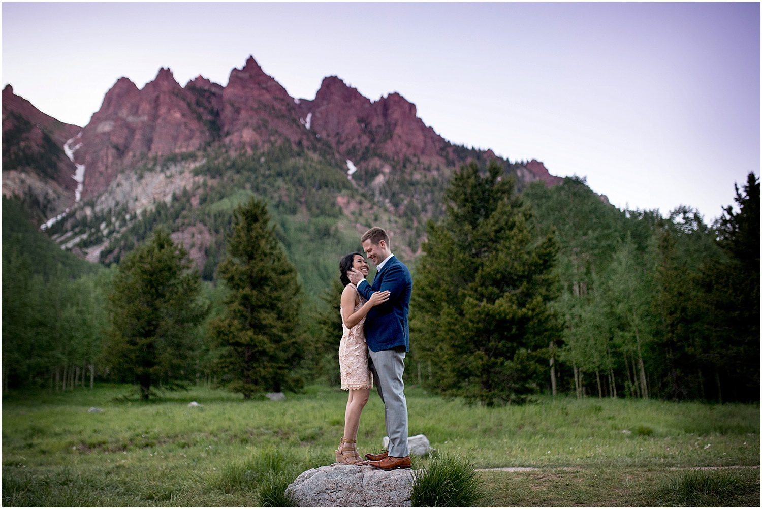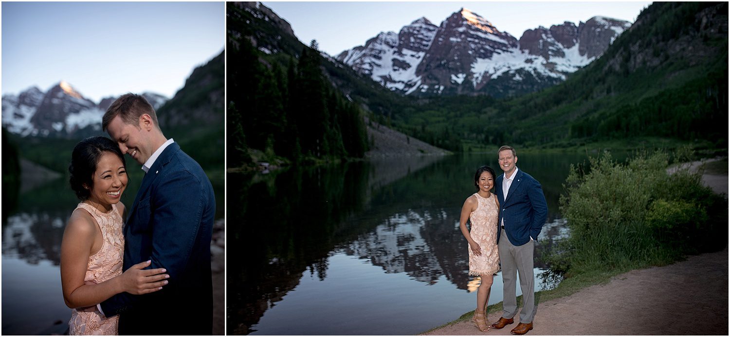 I met Jean and Nick up at the lake, where we took the Lake loop to get a few different areas of the surrounding wilderness for their Maroon bells engagement. As much as they would have loved to have done a full hiking session, Nick was recovering from a motorcycle accident that unfortunately made that not possible for this moment in time. (I would love to go hiking in that area at some point – hint hint 😉 ). We started taking the loop, getting the greenery as well as some stunning red rock formations in the background. As the sun started to hit the horizon off in the distance, we headed back to Maroon Lake for some images just as dusk approached. The mountains only alpenglow (that “bright red” look) at sunrise, but the dusk light was also quite magical and simply stunning.