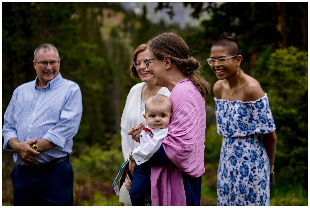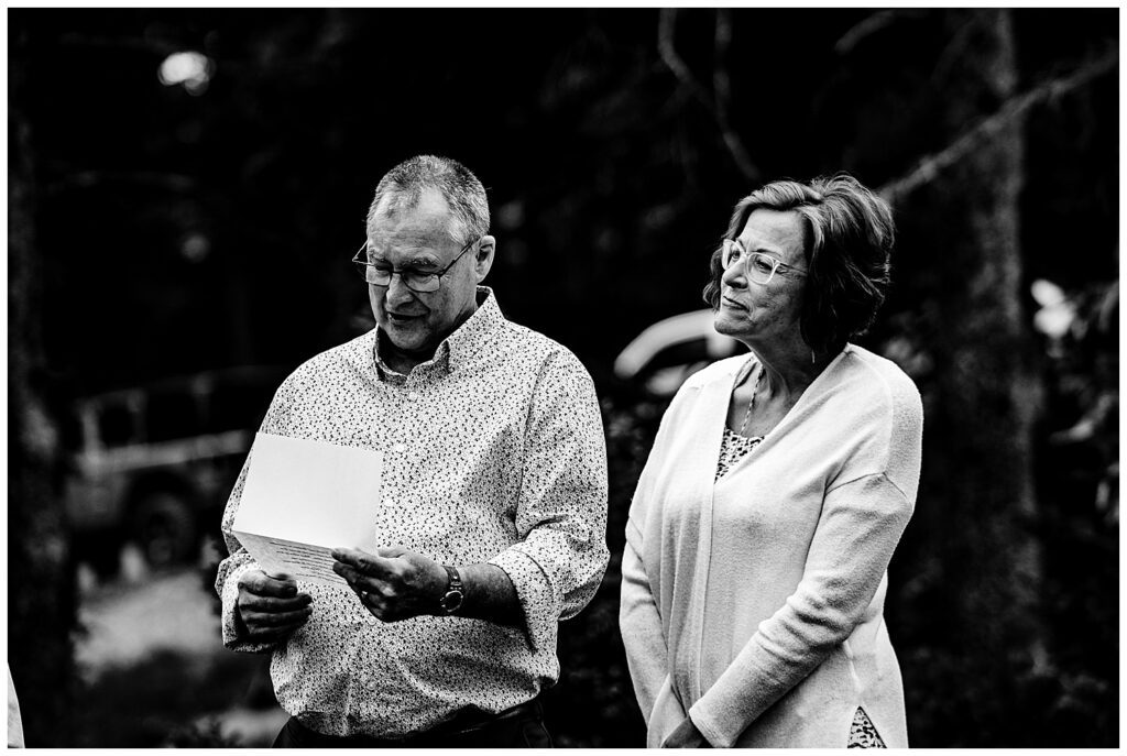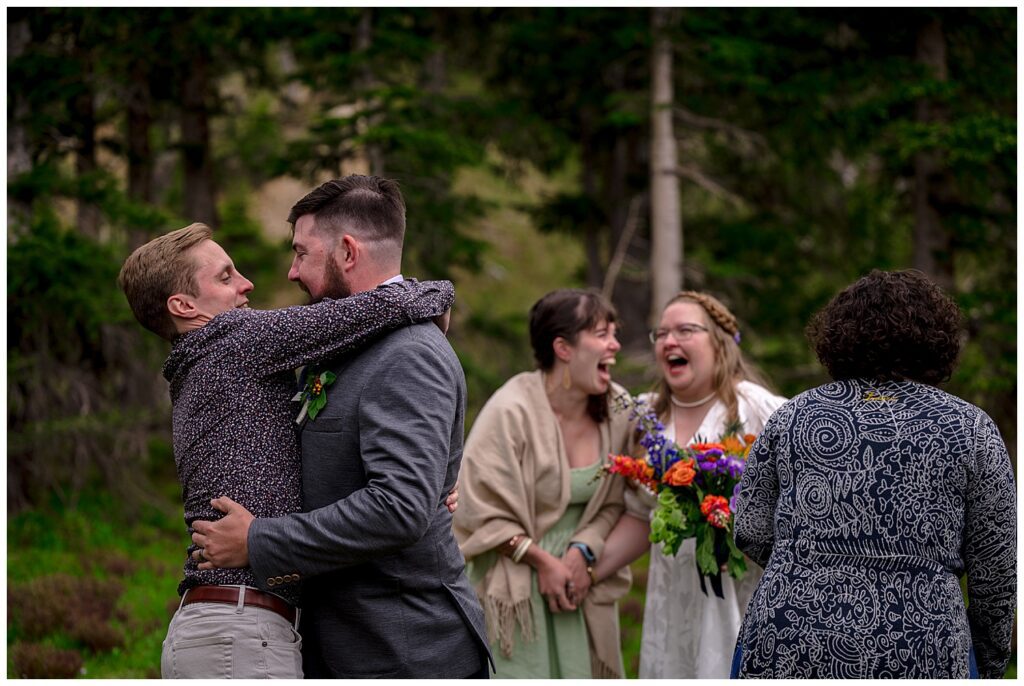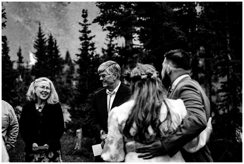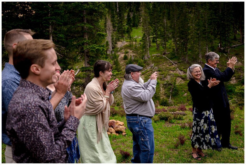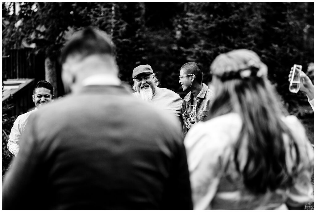 During their ceremony, all family and friends joined in a circle surrounding Linda and Shawn. They said their own written vows, and had a parent’s blessing from all their parents. To conclude the incredibly personal and heartfelt ceremony, everyone came in close to place their hands on Linda and Shawn – or place their hands on those in front of them to connect everyone. The energy brought forth by family and friends, as well as the forest and mountain, was enough to get lots of tears flowing. I know I had some goosebumps to say the least.