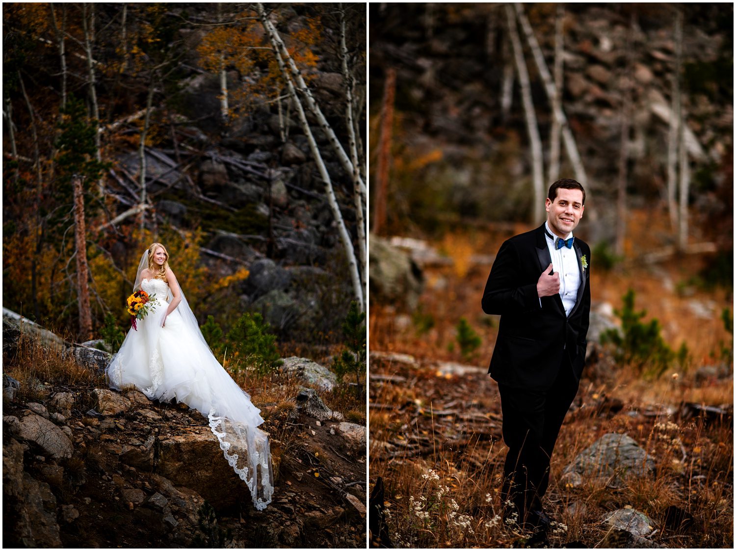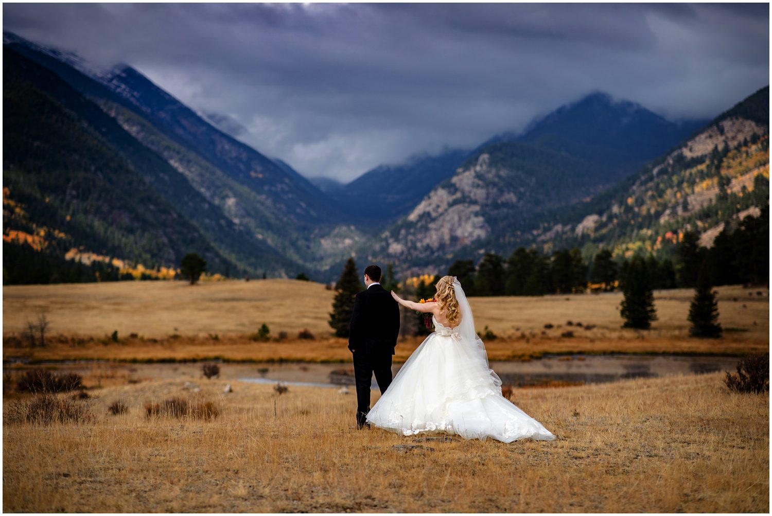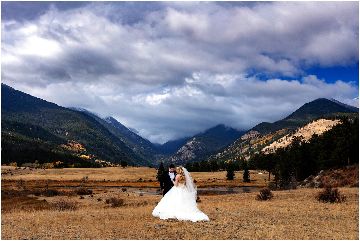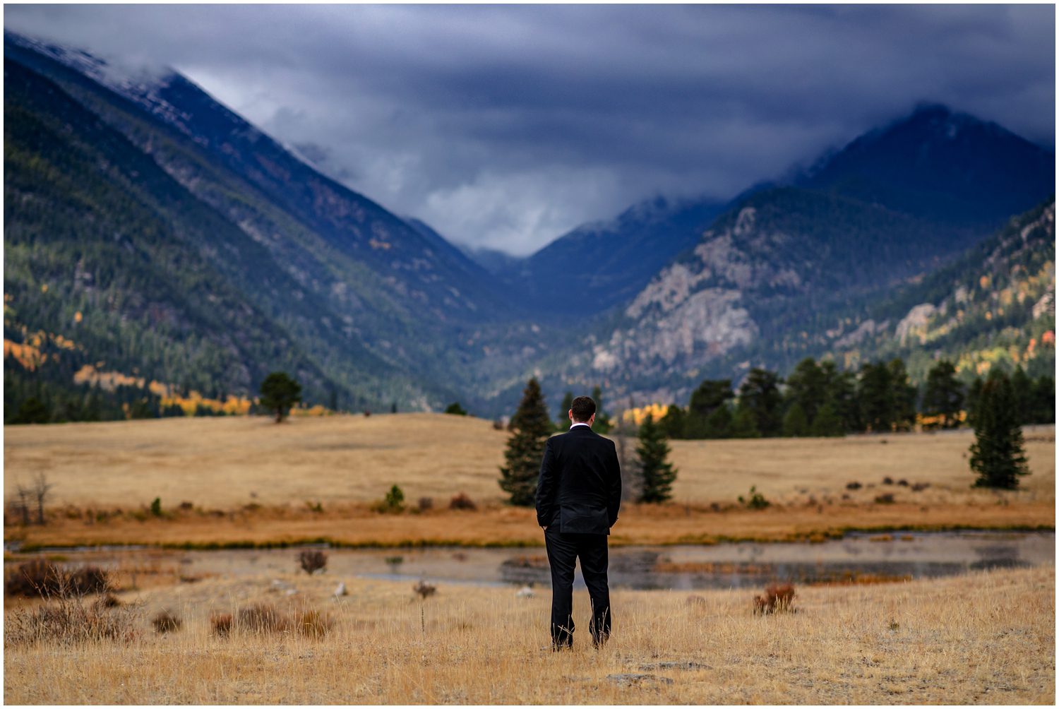 I’ve been to Fall River Village before, and was incredibly excited to see the new Sky View wedding venue that opened this past August. I met Cecily and Jimmy at Sky View to get ready, where Cecily was in the bridal suite and Jimmy was in their rental property just across the way. Coming out from Virginia for their Colorado destination wedding, the bride and groom decided to have their first look in the stunning Rocky Mountain National Park at Sheep’s Lakes. Cecily headed up with myself and we met Jimmy (along with my secondary photographer, Melissa) right along the roadside. Mountains and fall color were what we were in search for all afternoon – and we were able to get both despite the cold snap and fog descending over Estes Park the day of the wedding.
