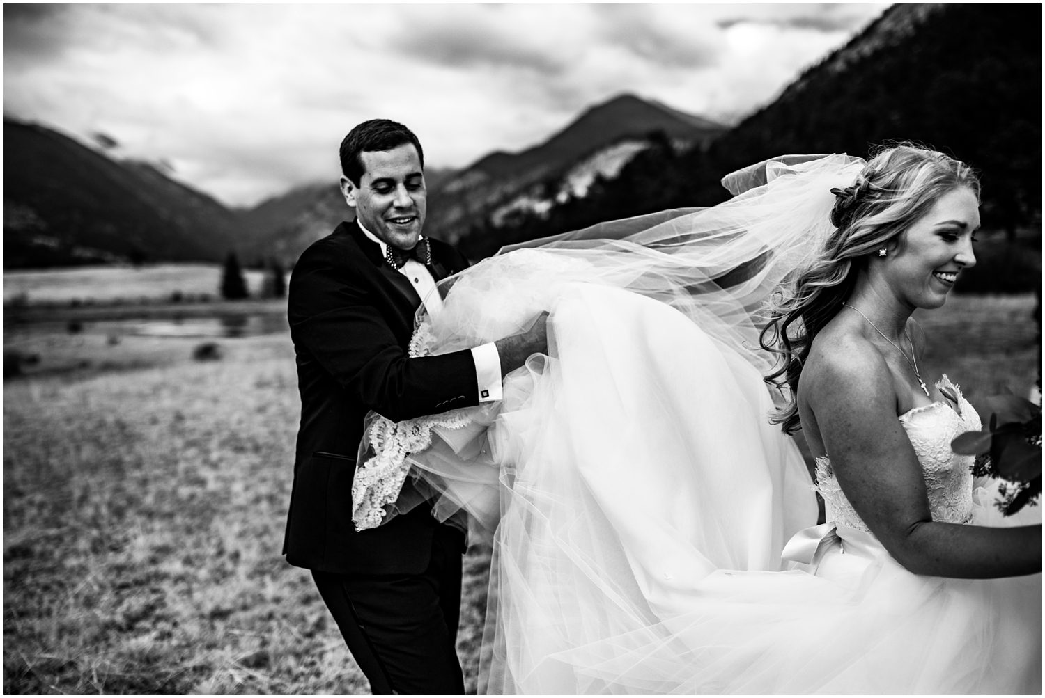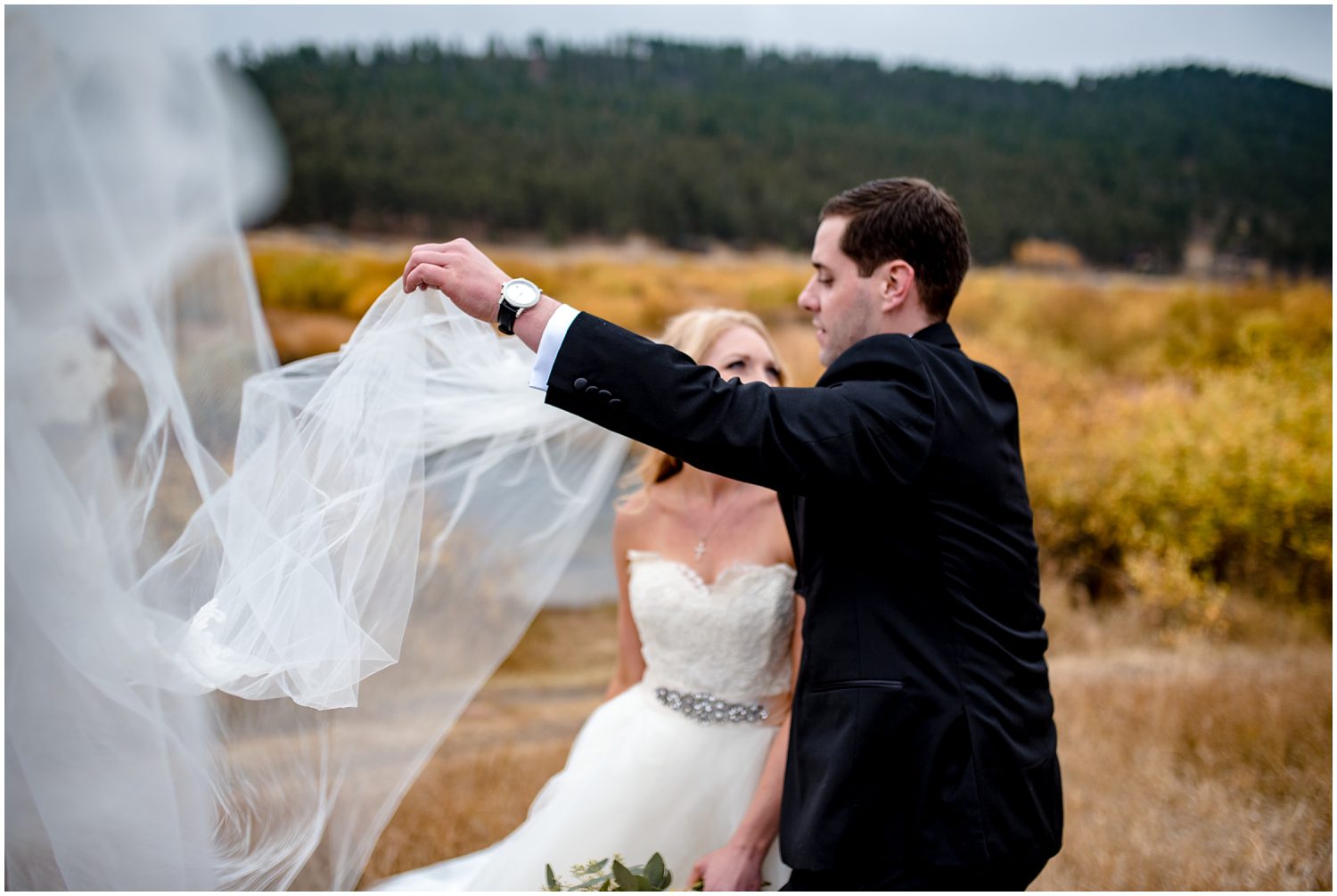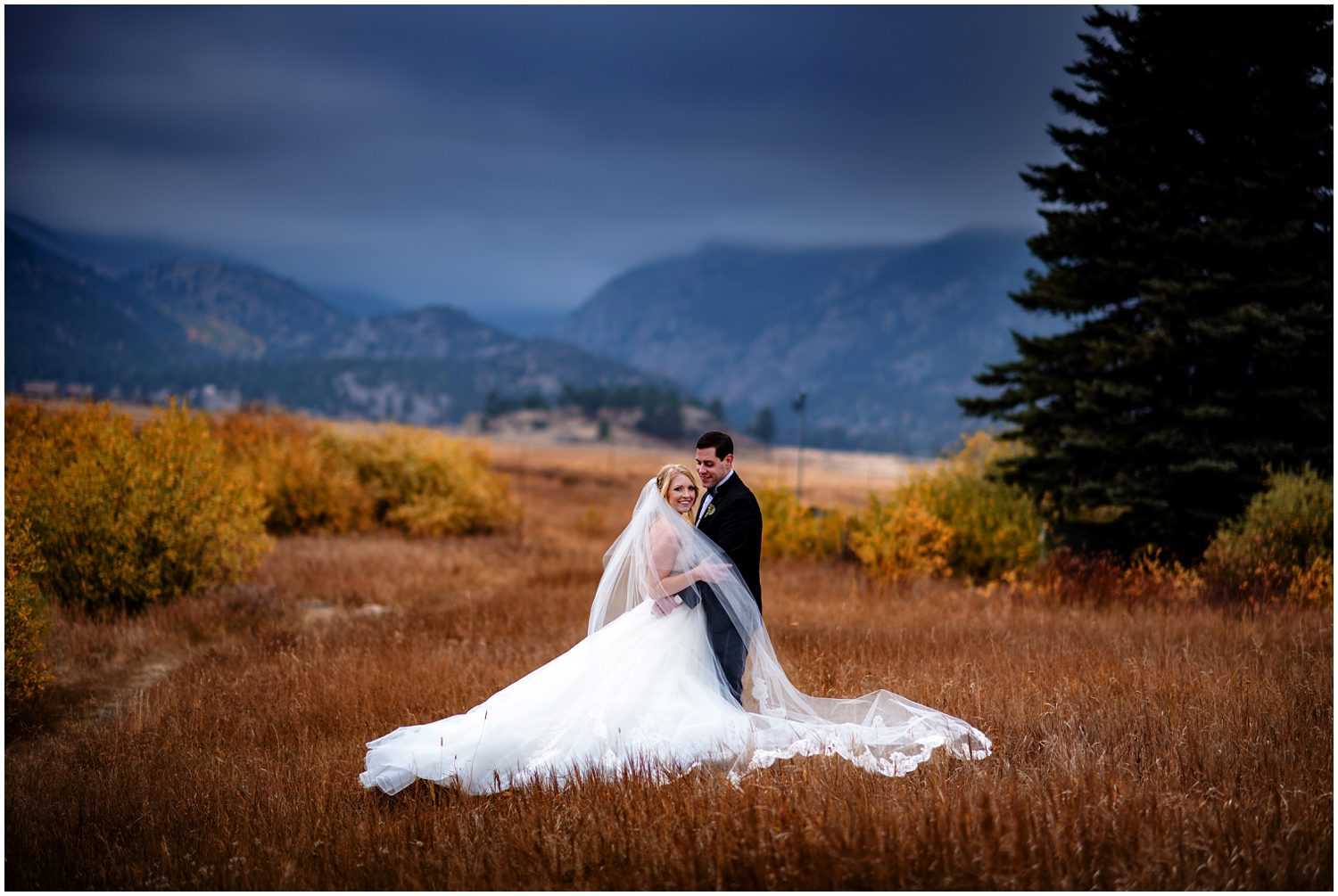 I’ve been to Fall River Village before, and was incredibly excited to see the new Sky View wedding venue that opened this past August. I met Cecily and Jimmy at Sky View to get ready, where Cecily was in the bridal suite and Jimmy was in their rental property just across the way. Coming out from Virginia for their Colorado destination wedding, the bride and groom decided to have their first look in the stunning Rocky Mountain National Park at Sheep’s Lakes. Cecily headed up with myself and we met Jimmy (along with my secondary photographer, Melissa) right along the roadside. Mountains and fall color were what we were in search for all afternoon – and we were able to get both despite the cold snap and fog descending over Estes Park the day of the wedding.