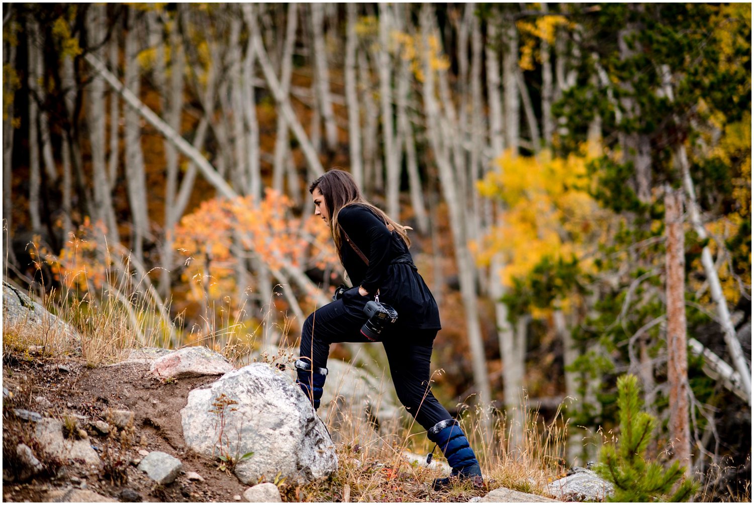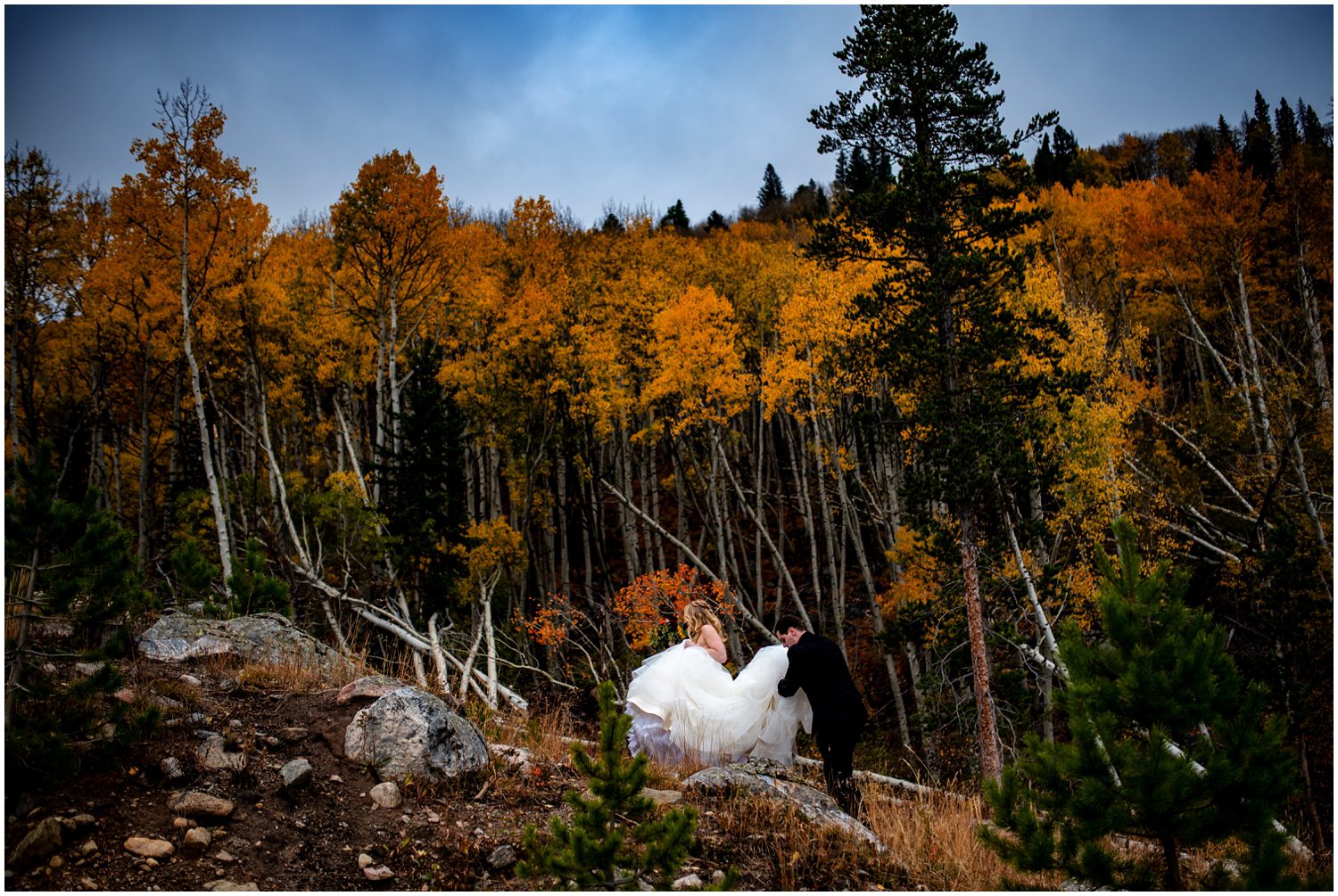 If you’re planning on having a first look and heading up into the mountains for couple’s portraits, I highly recommend leaving plenty of time and allowing for spontaneous decisions. We originally thought about heading up Trail Ridge Road, but the weather had other plans for us. The road closed for the day due to snow and wind – Colorado can have crazy weather and snow in Estes (even in September!). We snaked our way up towards Bear Lake, but decided against any of the upper lakes due to low visibility and fog. As we were heading back down the road, I found a small pull off with a dirt ledge and a stunning Aspen field behind that was in prime color. I may have made the 😬 face and asked how up for adventuring up the side of a muddy/slick sidewall they were. #BadAssBride
