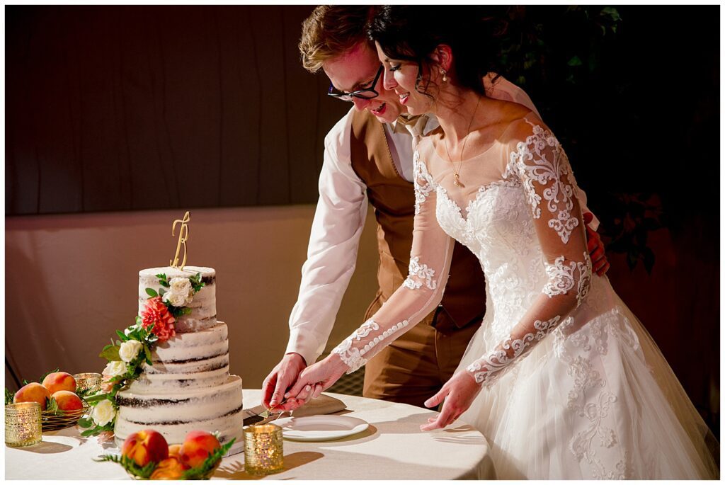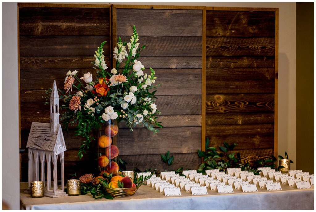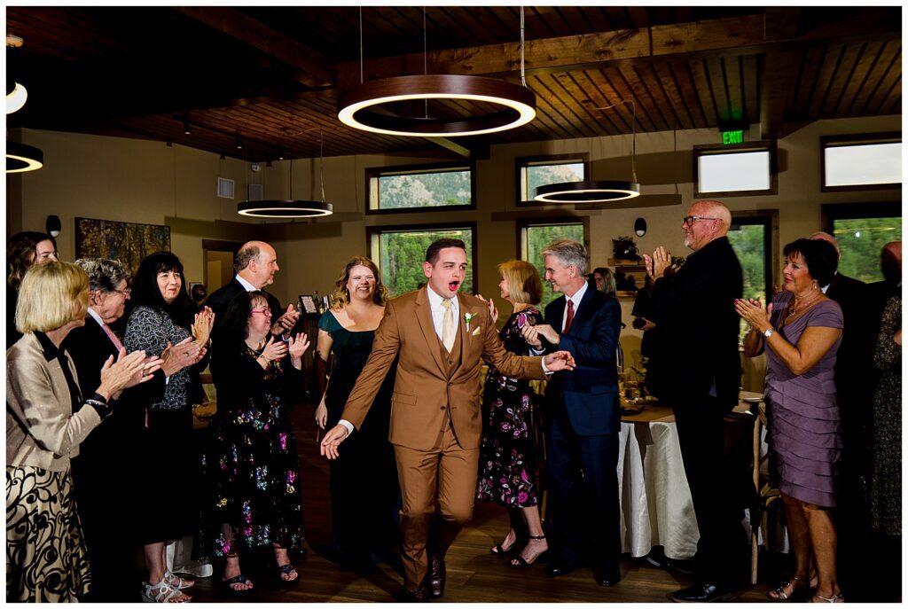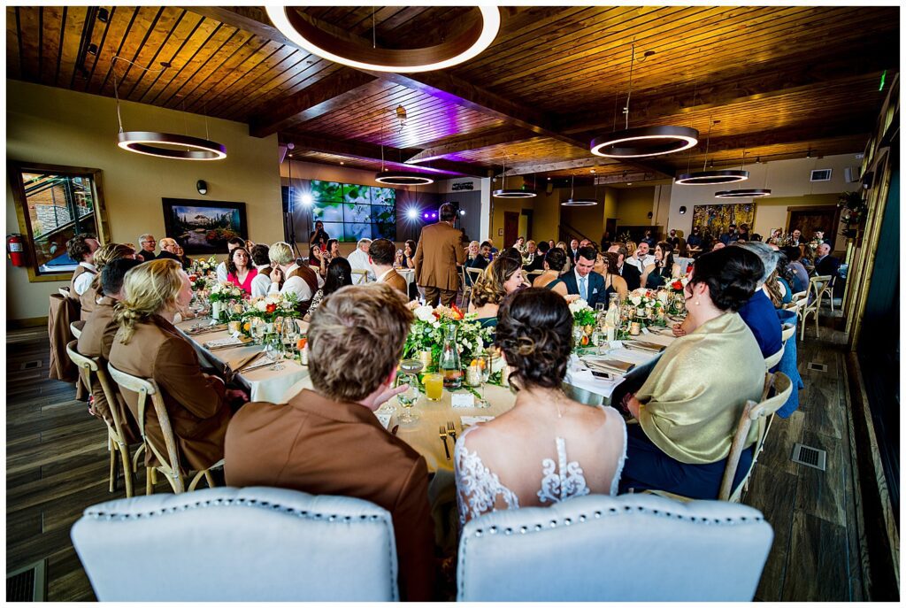 After running through a sea of Rose Pedals for their ceremony recession – we headed into the sun filled reception room. SkyView, as previously mentioned, has amazing bay windows lining the entire SouthWestern walls of the building – letting so much light into the room. Also, the views of Longs Peak booming behind the head table is simply a stunning backdrop.