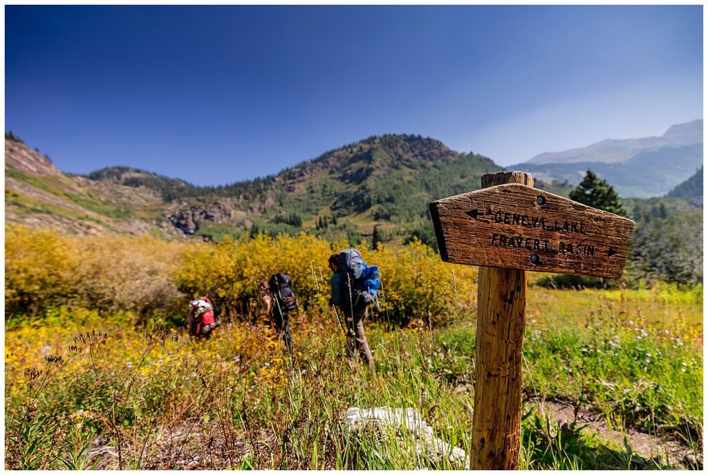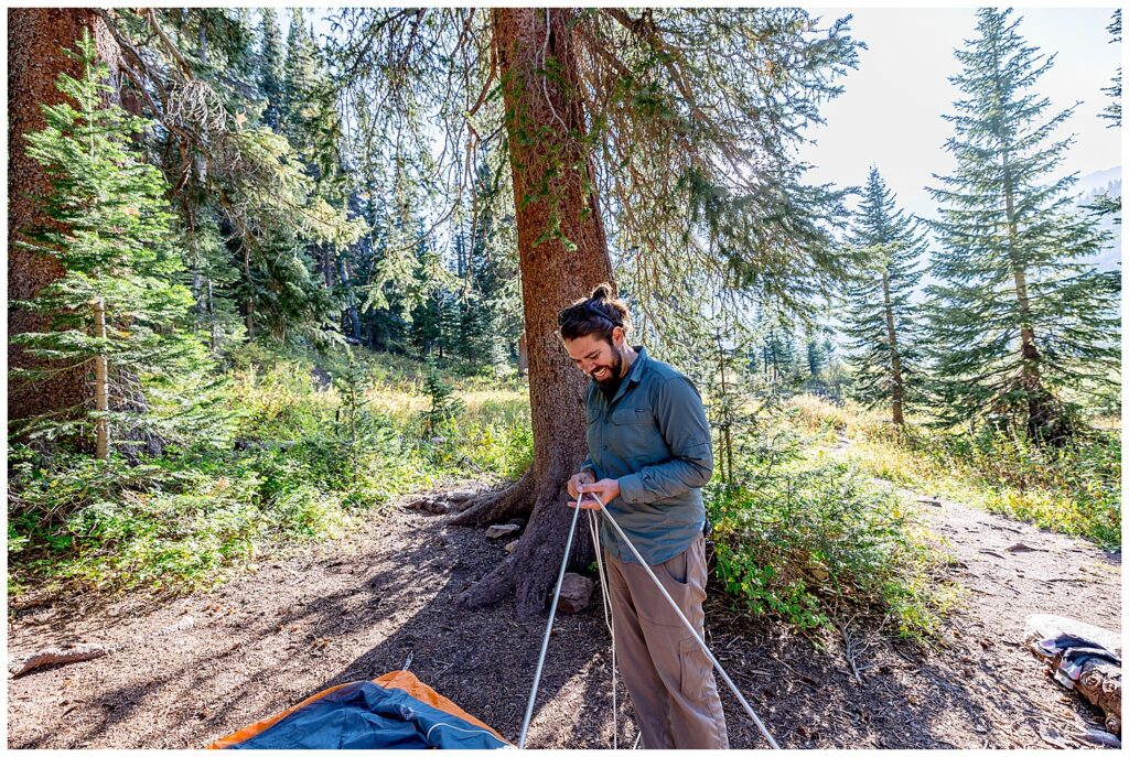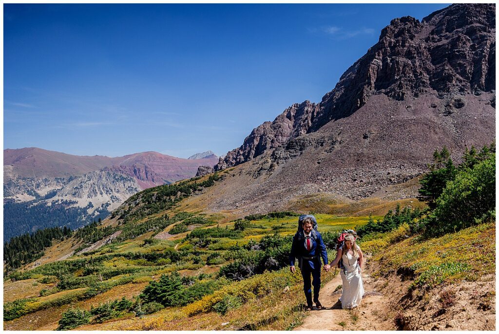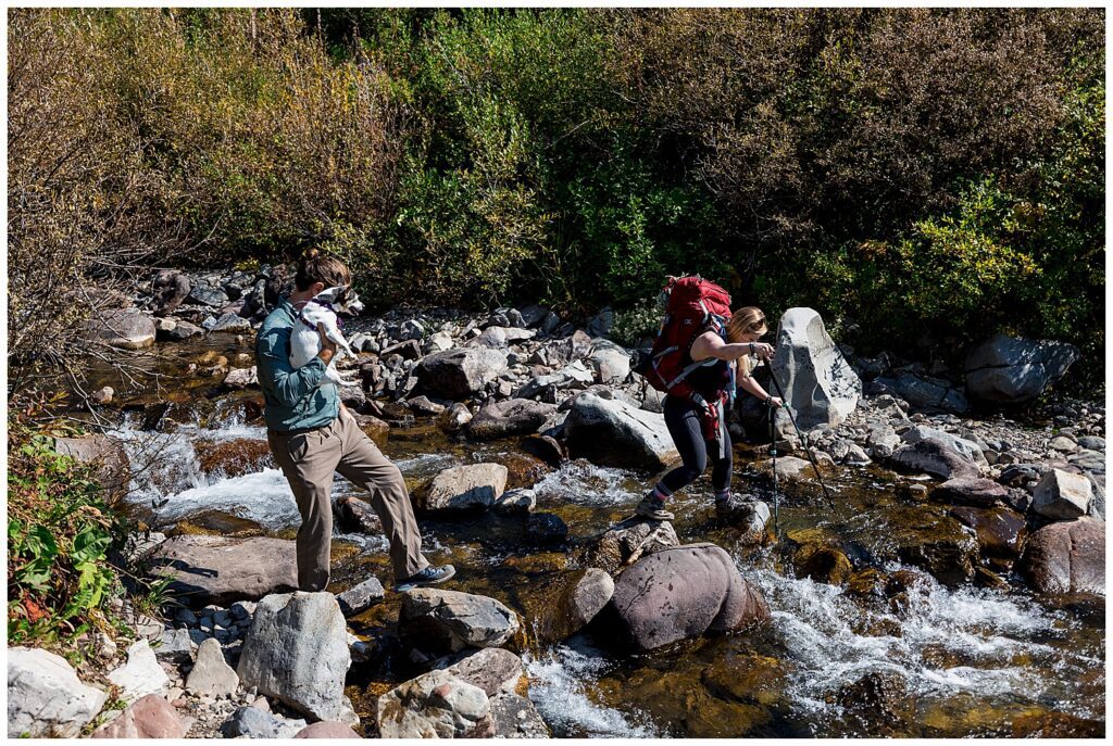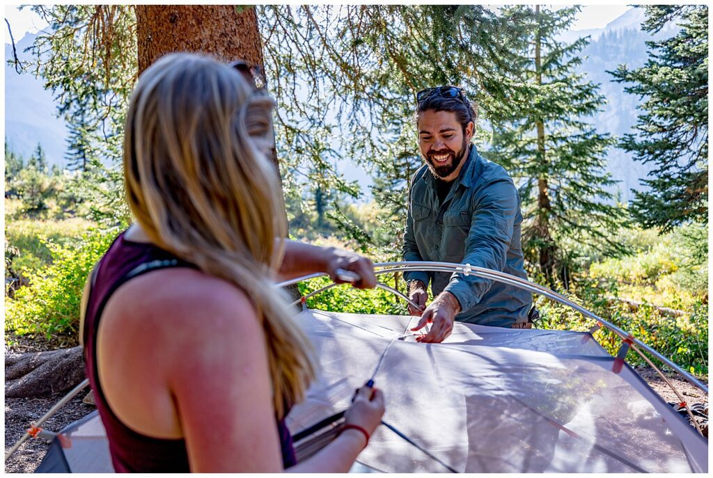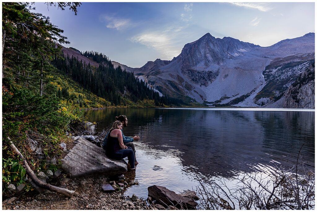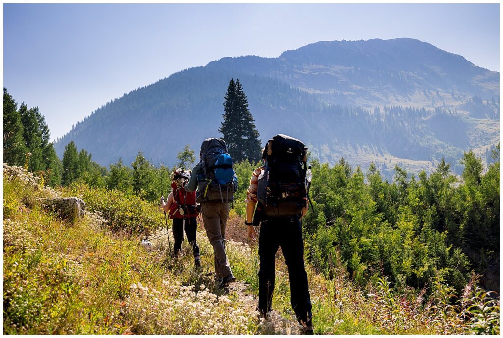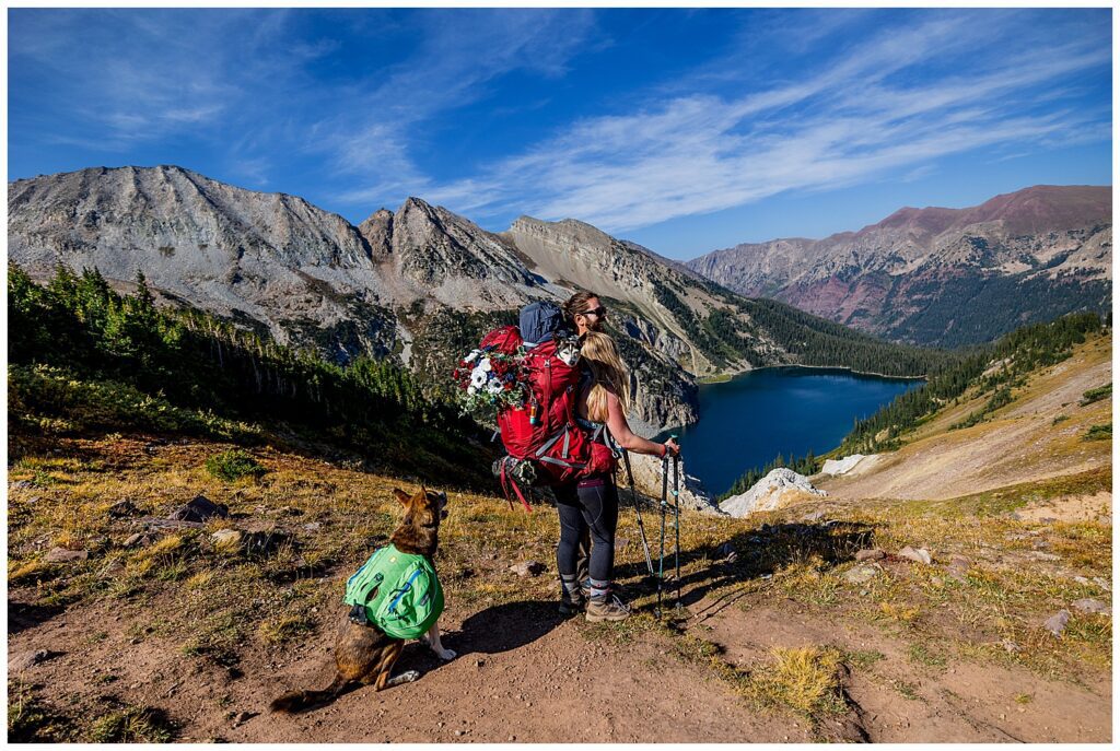 The route that we decided on took us up and over Trailrider Pass, and descended right into the camping area of Snowmass Lake. We packed our overnight gear- and along with their good friend James, and puppers Vegas and Maggie – we headed into the Maroon Bells wilderness to spend a night camping under the stars before their Sunrise elopement.