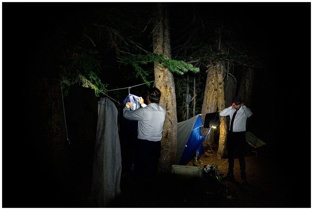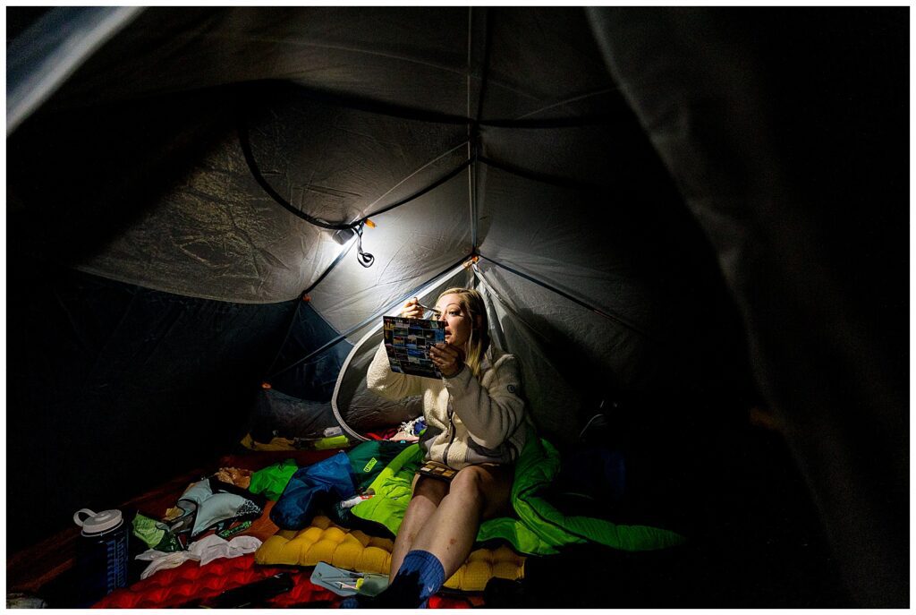 Getting ready by way of headlamp, Katrina got ready in the tent while Sean got ready in the space that spanned between all of our camps.