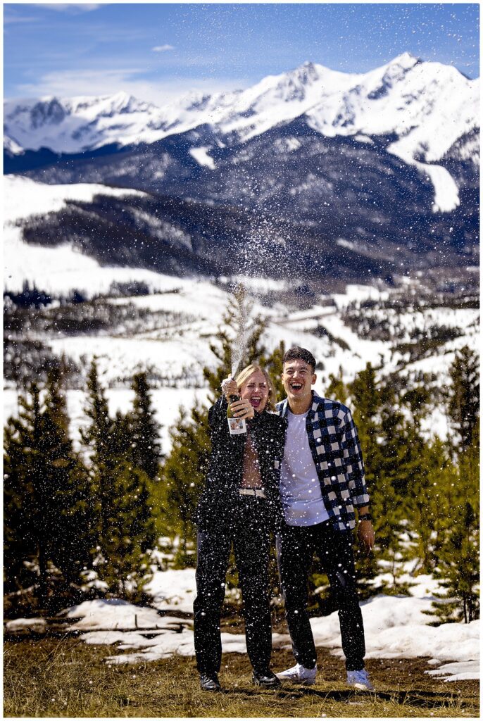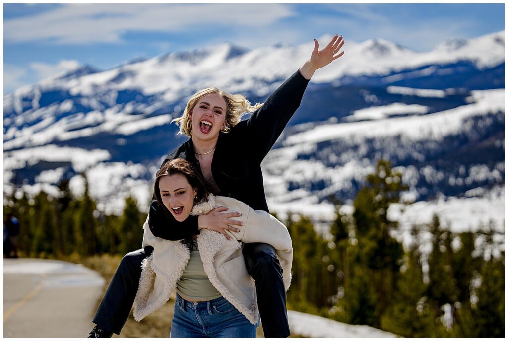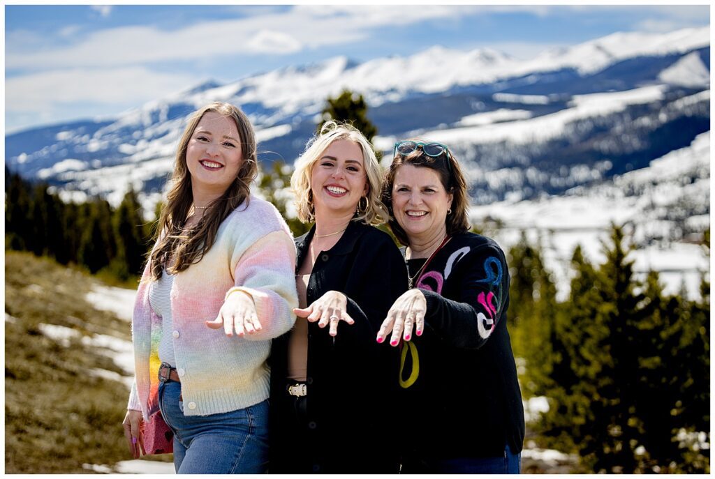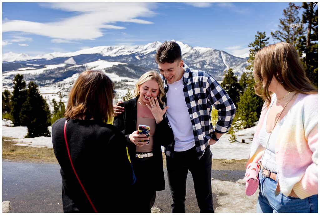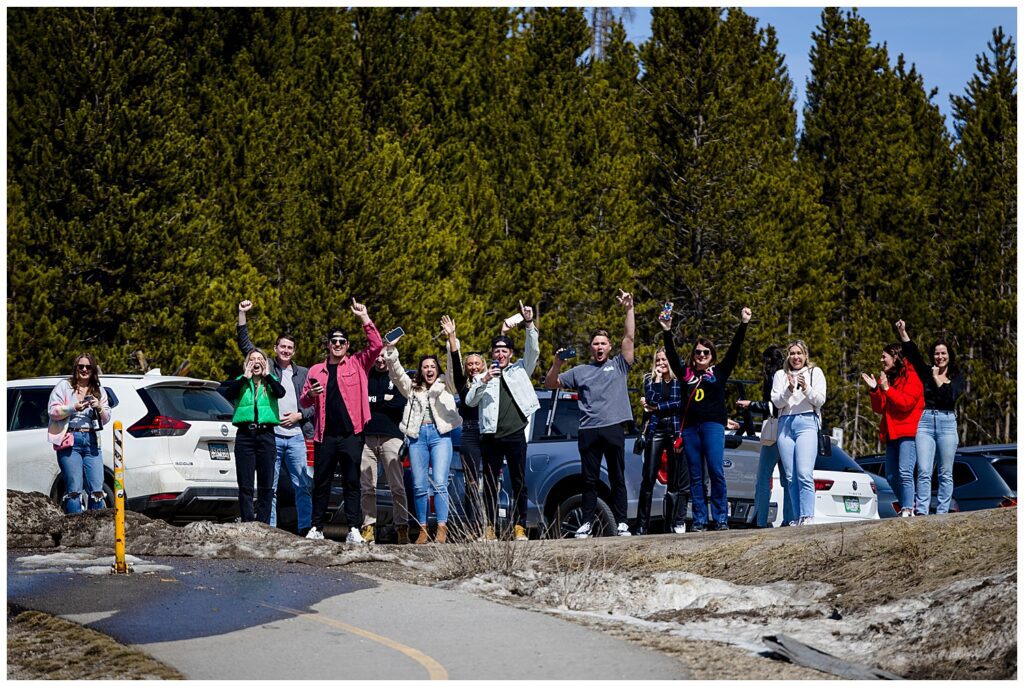 Looking out over the tenmile range and the town of Breckenridge, Grace said yes to GT’s proposal. She was so in the moment, that she didn’t notice that all of their friends and her family were at the top of the trail awaiting to congratulate the couple. You can see where her face changes and she notices all of her loved ones up in the parking area.