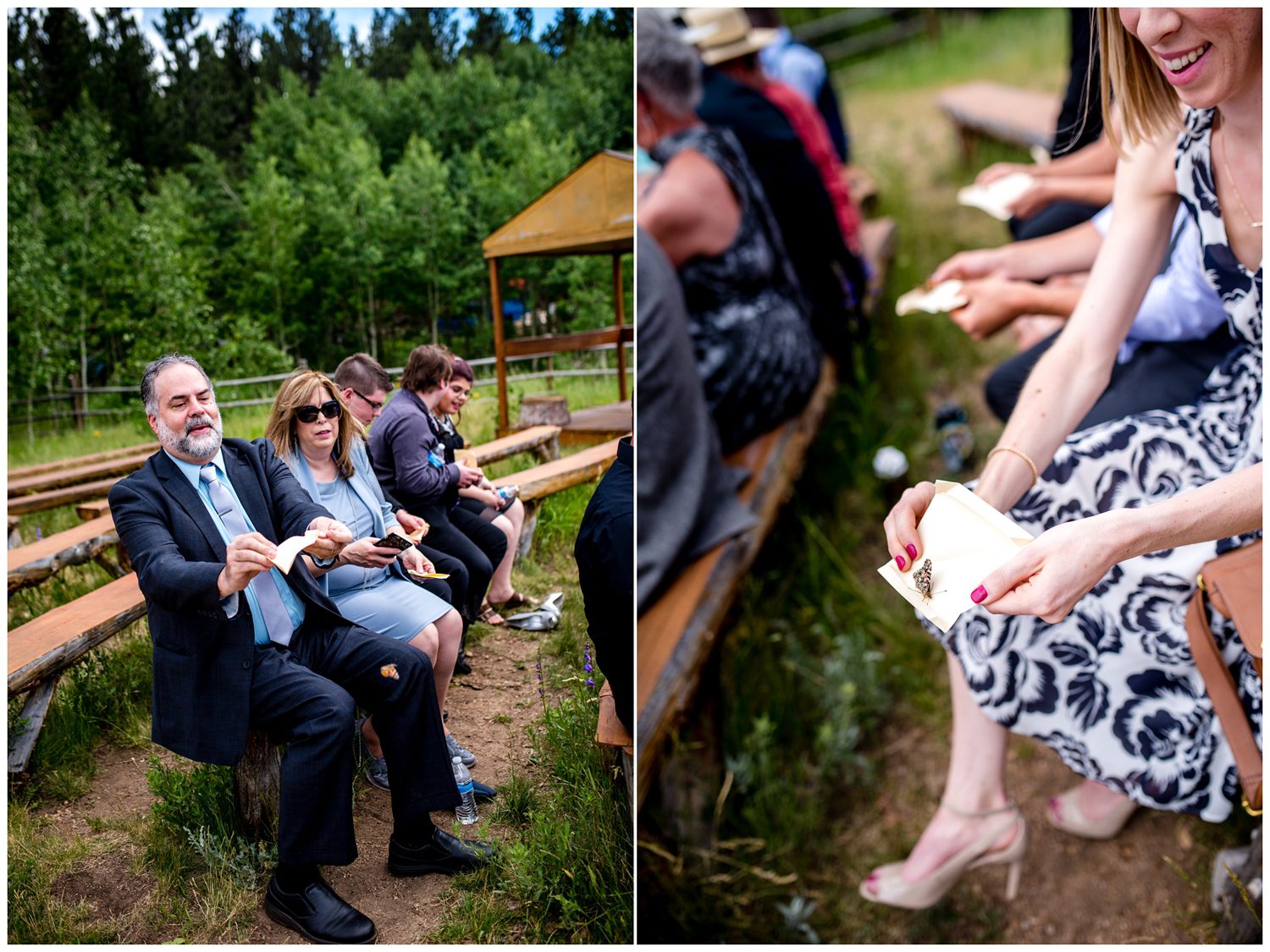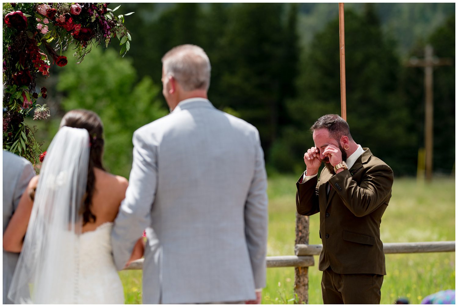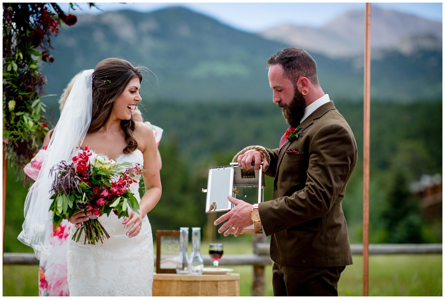 As we made the trek over to the ceremony site, the temperature began to slightly drop and the sun began to sink behind the clouds. Ashley walked down the aisle to greet her groom on the arms of both her dads. As someone who has seen many, many family dynamic situations, it makes my heart so happy to see families that have split love their children so much that they all function as one large, supportive family. Just as Ashley was approaching the “altar”, I turned to notice TC had the perfect one single tear falling down his cheek. This is the unicorn of photographing the groom seeing his bride for the first time – the single teardrop. It just about made me tear up to see the love in both their faces. One of my favorite things Ashley and TC did during their Wild Basin Lodge wedding was to take just a moment to look out at the view – a moment to have to themselves. It can be so hard to find time to have a moment of silent bliss on your wedding day, and this was the perfect time to just “be”. To conclude their ceremony, all the guests had butterflies to release into the sky.