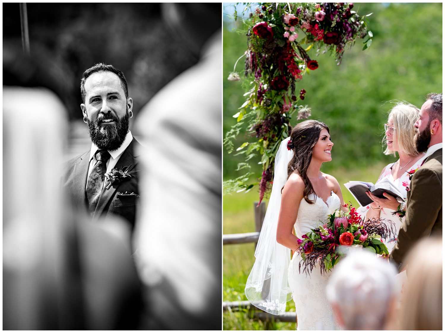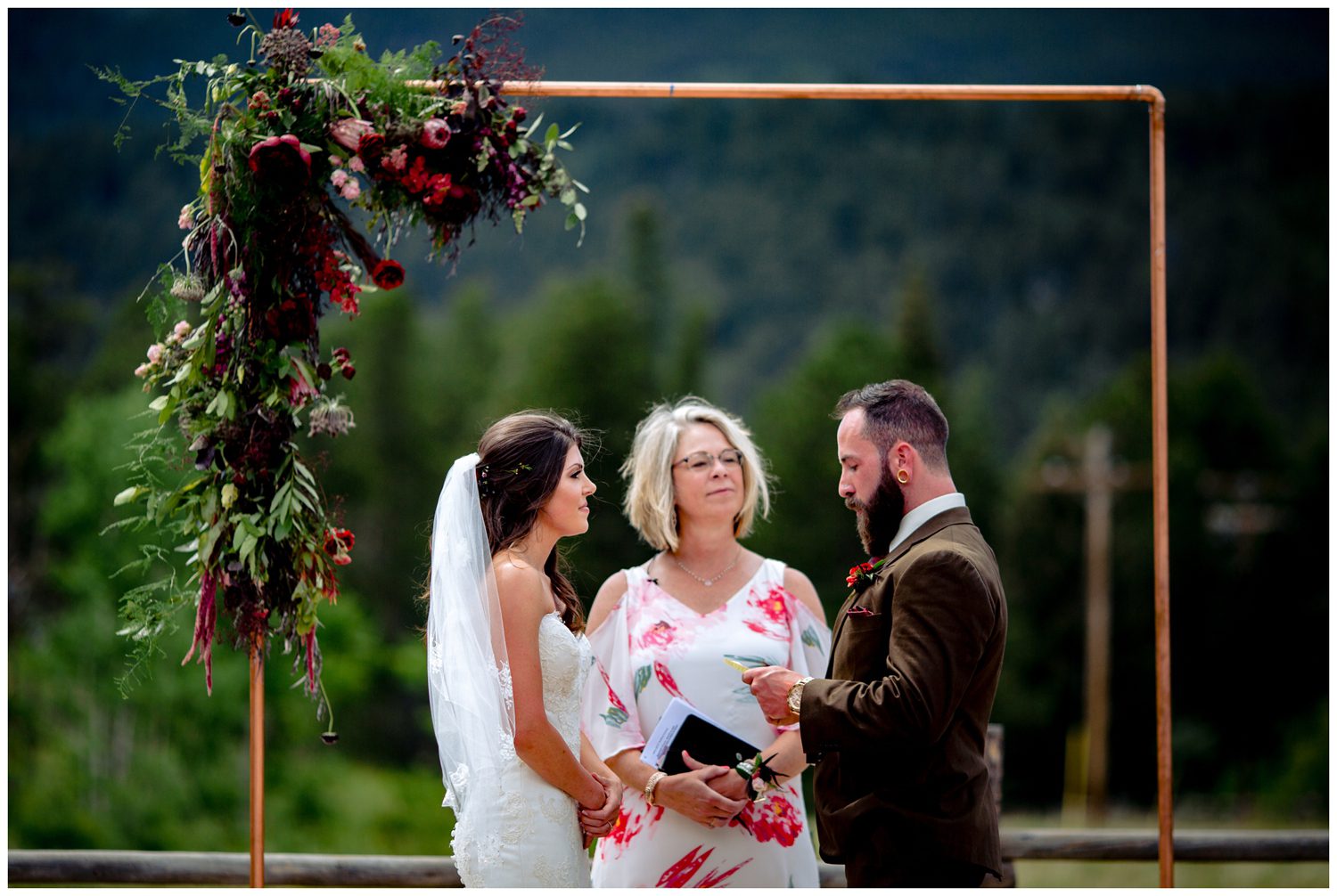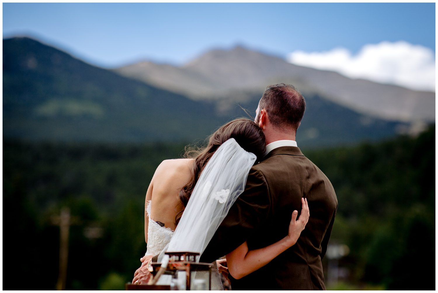 As we made the trek over to the ceremony site, the temperature began to slightly drop and the sun began to sink behind the clouds. Ashley walked down the aisle to greet her groom on the arms of both her dads. As someone who has seen many, many family dynamic situations, it makes my heart so happy to see families that have split love their children so much that they all function as one large, supportive family. Just as Ashley was approaching the “altar”, I turned to notice TC had the perfect one single tear falling down his cheek. This is the unicorn of photographing the groom seeing his bride for the first time – the single teardrop. It just about made me tear up to see the love in both their faces. One of my favorite things Ashley and TC did during their Wild Basin Lodge wedding was to take just a moment to look out at the view – a moment to have to themselves. It can be so hard to find time to have a moment of silent bliss on your wedding day, and this was the perfect time to just “be”. To conclude their ceremony, all the guests had butterflies to release into the sky.
