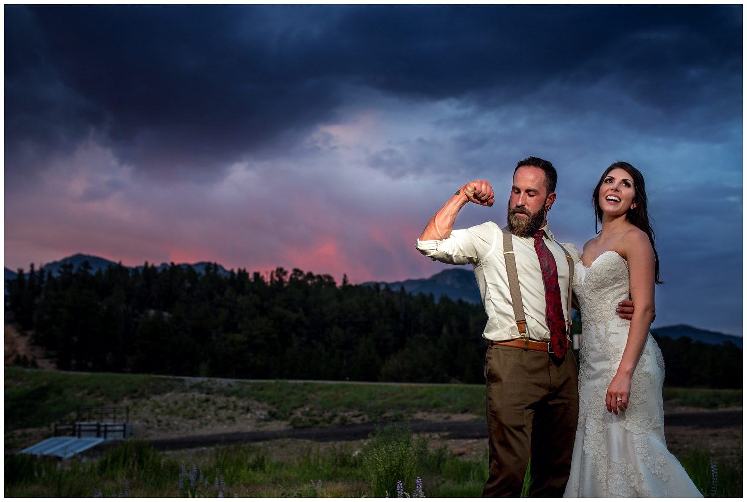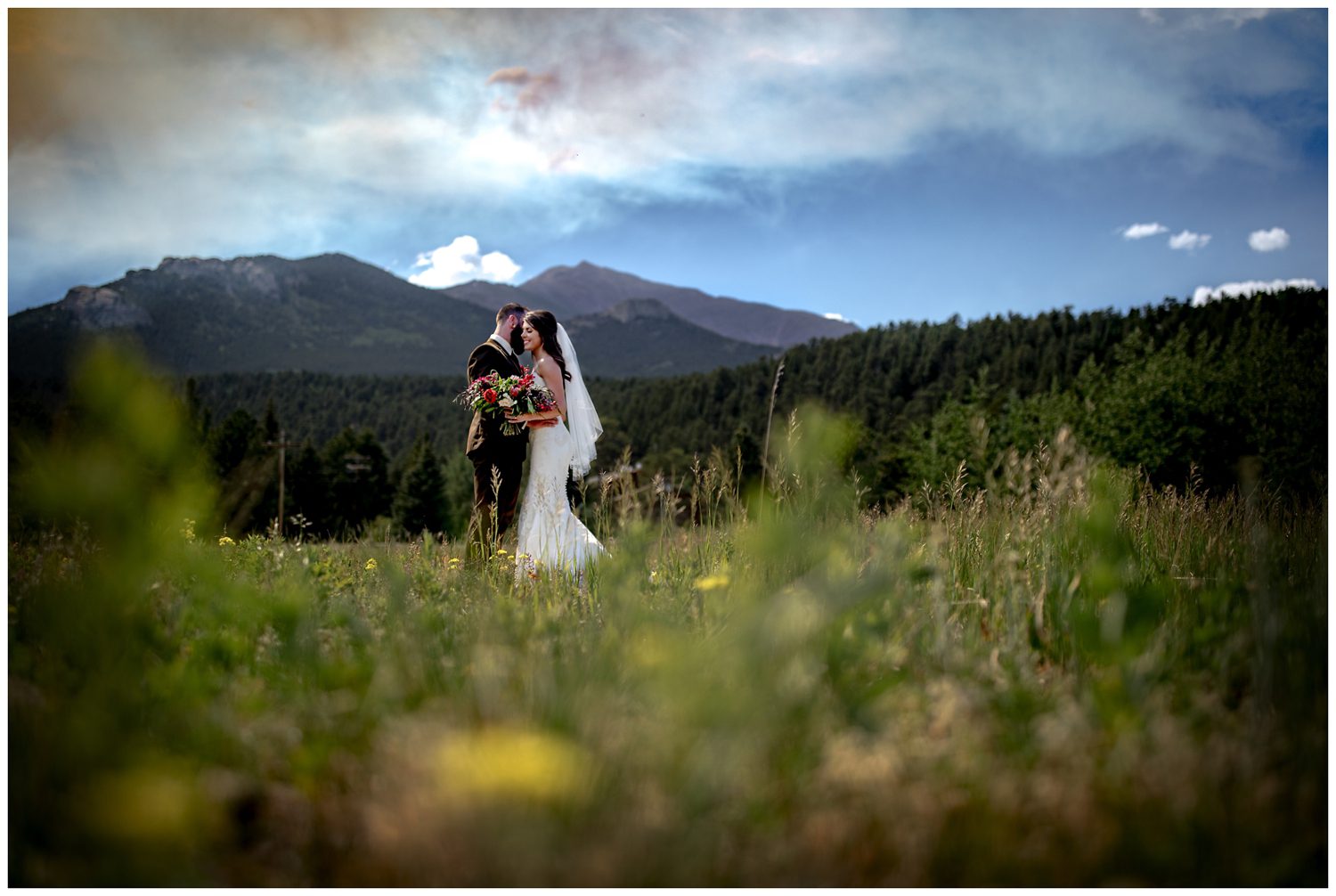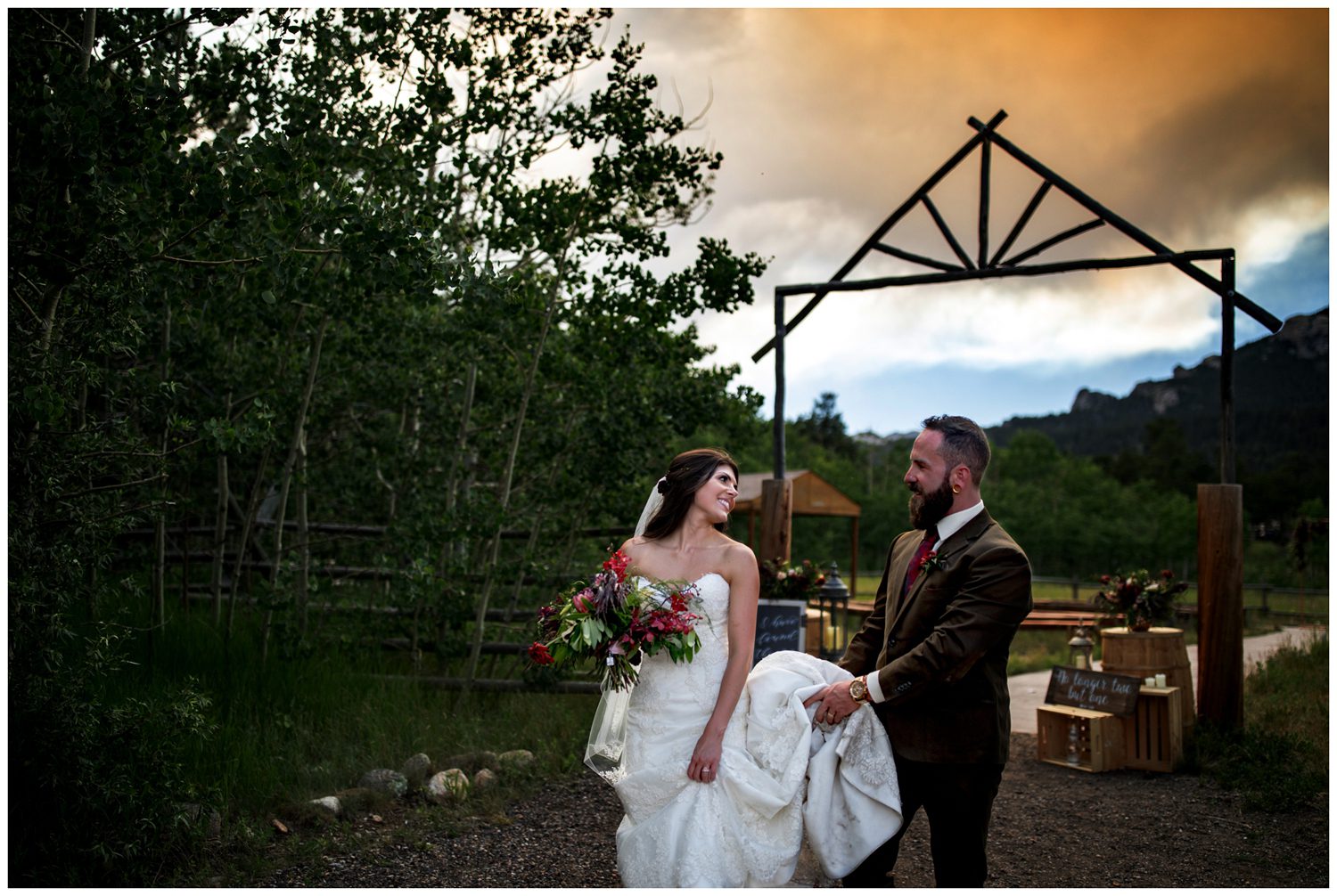 Once we began photographing their couple’s portraits, I looked down at my arm to notice it was incredibly orange. I’m all about light (and I have ZERO poker face when it comes to yelling out “OMG THAT LIGHT IS SO PRETTY”), so noticing the shift in color was somewhat odd for 3:00 in the afternoon. We looked up into the sky and noticed that a huge smoke plume had formed – it turns out that a large wildfire near Grand Lake (just on the other side of the Continental Divide) had started that day. It makes me incredibly sad to know that Colorado is on fire, but man oh man does smoke make for some amazing lighting.