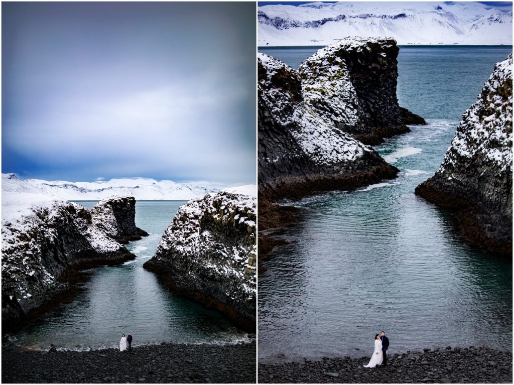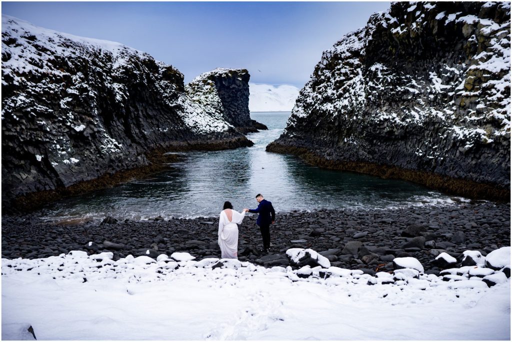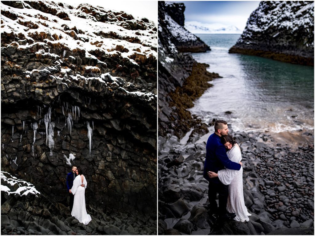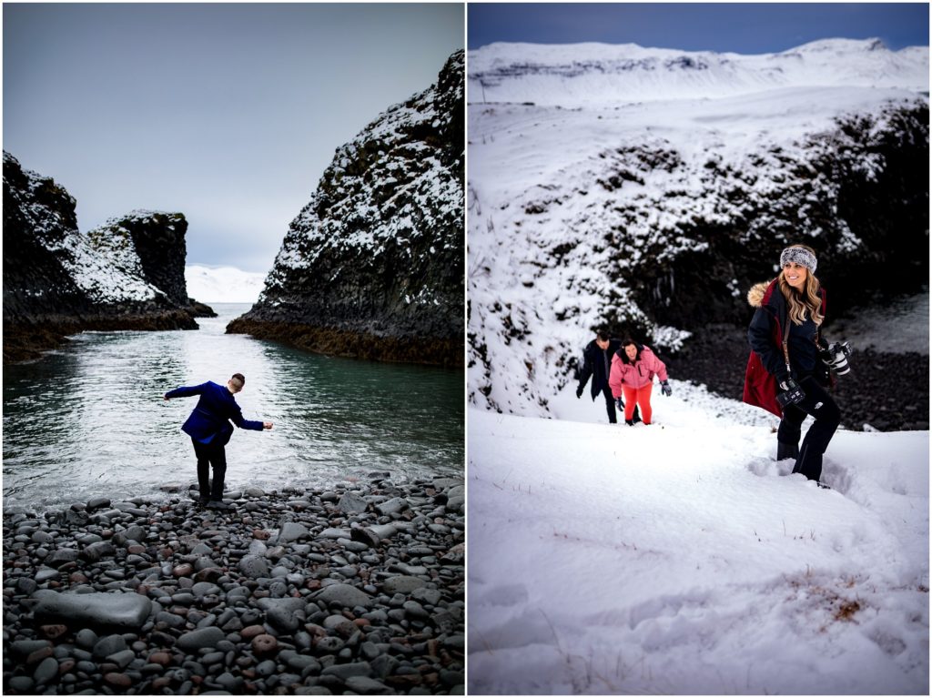 Another amazing thing about Iceland is that it has a draw to the adventurous souls. Candice and Robert are certainly in that category. We found an AMAZING cove along the coast, but the descent down towards the water was, well, not for the faint of heart. Candice and Robert, with microspikes in tow, headed down the steep hill in the name of adventure and photos. As I’m sure you’ll agree, it was WORTH IT!