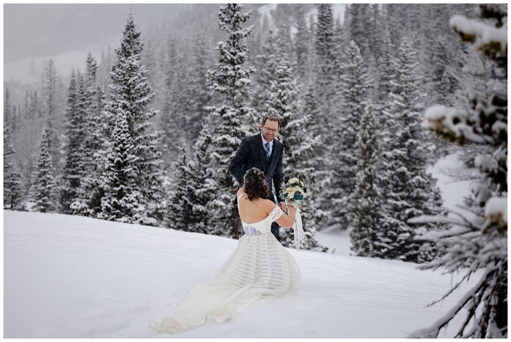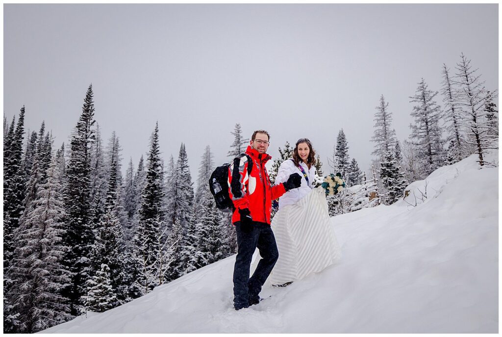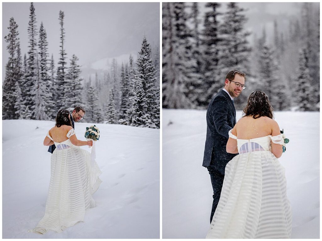 Michelle and Scott got married at SkyView Fall River Village this winter – you can check out that blog post HERE – and had decided to do a “Day After Wedding Portrait Session” in lieu of engagement photos. I LOVE that this idea of putting your wedding attire back on after the big day for Mountain photos is starting to take off.