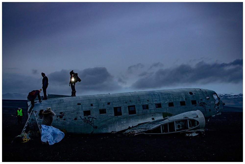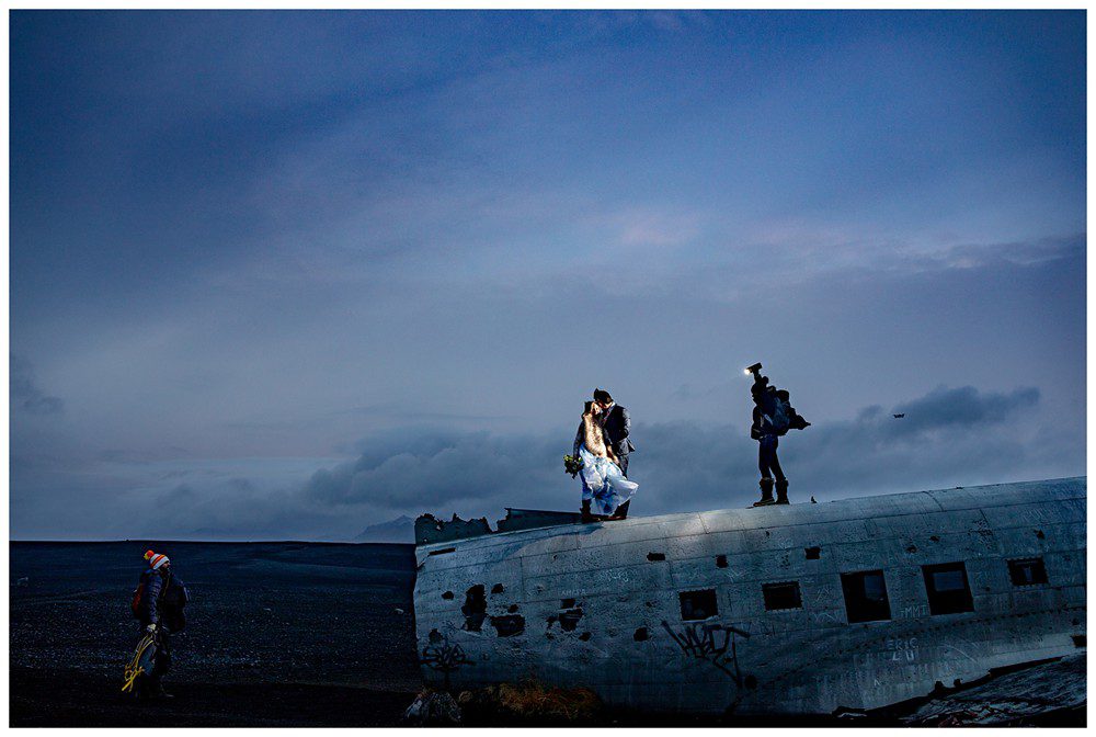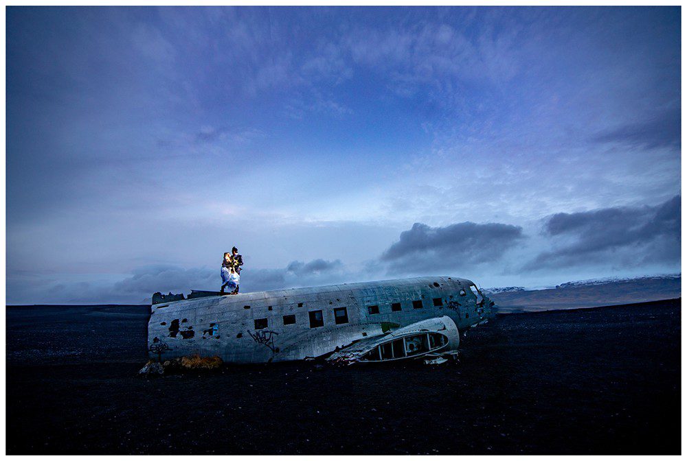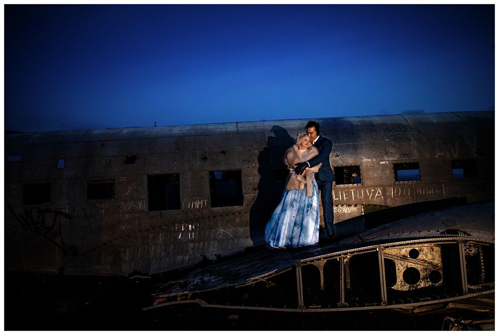 To cap our day off, we headed on the 5 mile hike out to the Sólheimasandur Plane Wreck. The hike out didn’t feel too bad at all. It’s flat, and very well marked. We arrived just as the night was about to fall upon Southern Iceland, the sky turning a deep blue. Kim was quite the adventurous bride – and climbed on top of the plane in what can only be described as a giant wind sail. As the land became dark, we headed back to our car to drive back to Reykjavik. The hike back was not as “lovely” feeling as before – it felt like a dark eternity 🤪