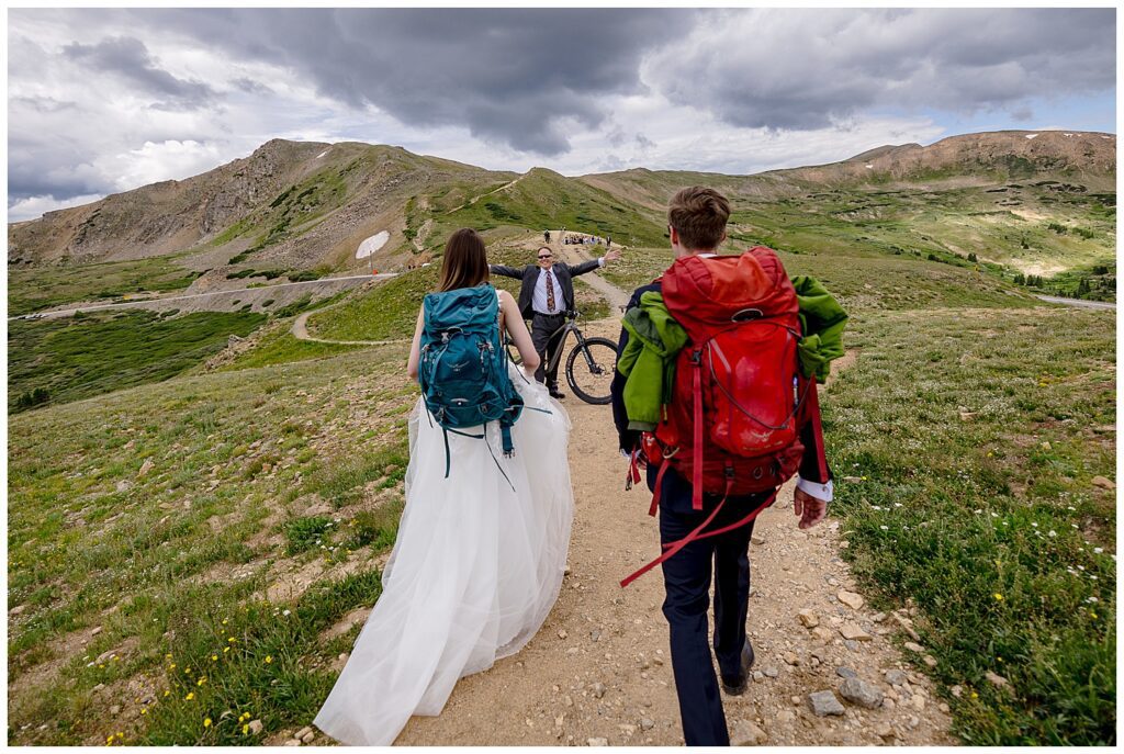 •Heading down the hill to see the Father of the Groom mountain biking up the trail in his suit