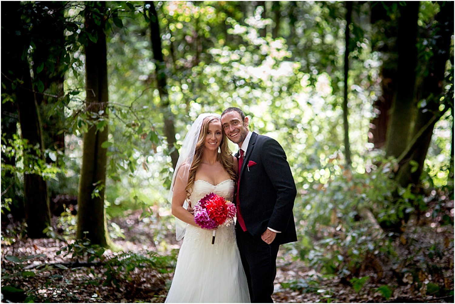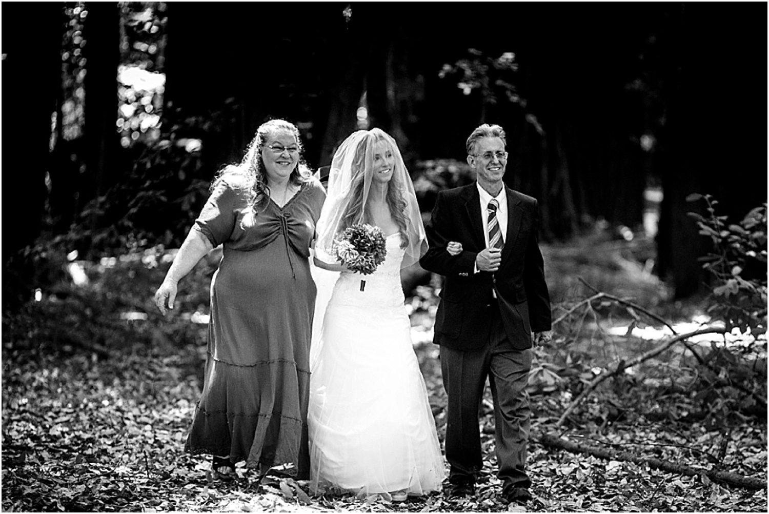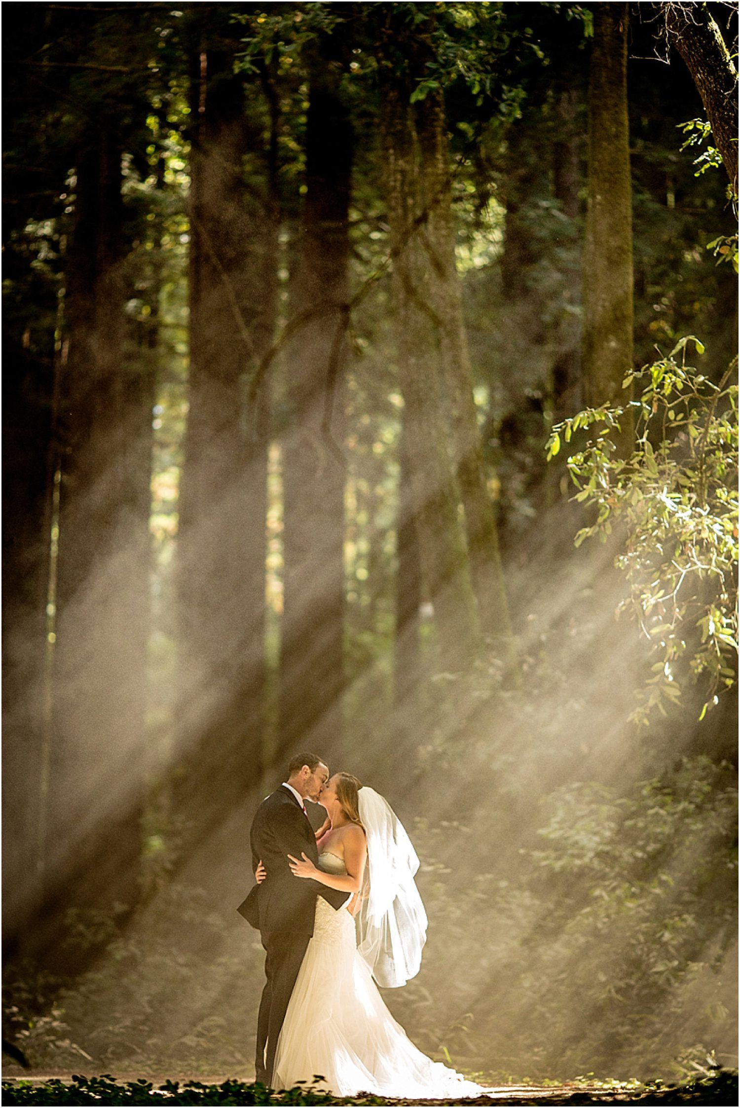 We originally were set to do all of their couple’s portraits before the ceremony, but as with many weddings, things were slightly behind, leaving us to finish our couple’s portraits after the family portraits. As we were finishing up our time in the forest and getting ready to head back to their reception, the sun fell lower into the horizon and began streaming through the trees. I saw the streams of light, and immediately knew this was why everything was pushed back – so we’d be able to catch this amazing, awe inspiring light. As we walked up onto the road, some dust caught the light and gave me the idea to have a car kick up some dust for us. The first attempt was a dud, and I thought my idea was bunk. But if at first you don’t succeed, try asking someone with a 4WD vehicle instead of the tiny Nissan to burnout on the dirt road. 😉 Once the truck passed and kicked up dirt – the amazing, beautiful dirt – Kat and Tim ran out (quite literally) into the road to get some of my very favorite images to date.