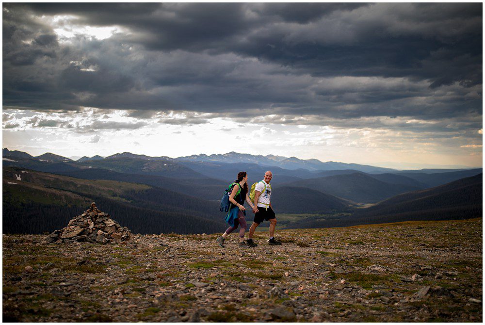 As we were making our way up to the summit, Amber and Adam told us some pretty crazy stories about their time in Colorado. In Amber’s words, they’re “Believers”. They had met a woman on the hike to Sky Pond the day prior, who randomly approached them. This woman let them know that she was expecting to see them, as she had a dream that the male would be carrying the female across a threshold during their time in Colorado. Mind you, this was before Amber and Adam let her know that they were here in Colorado to Elope. We knew, that at some point during their mountain top elopement, Adam would have to pick up his new wife.