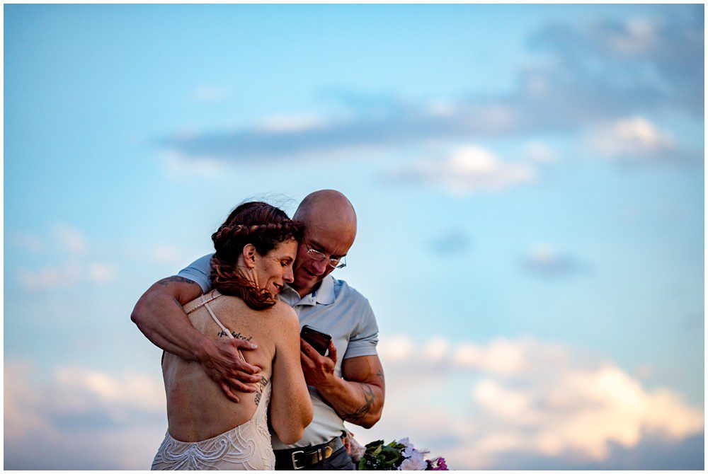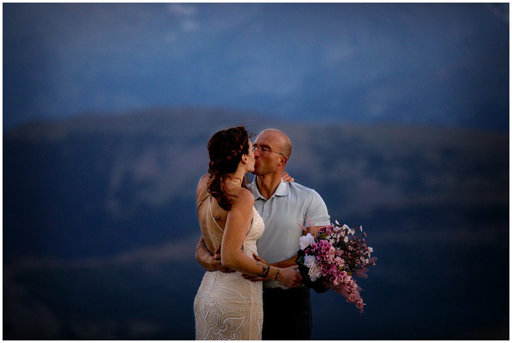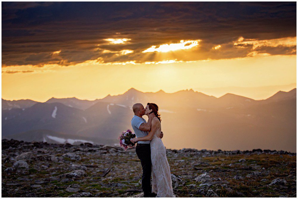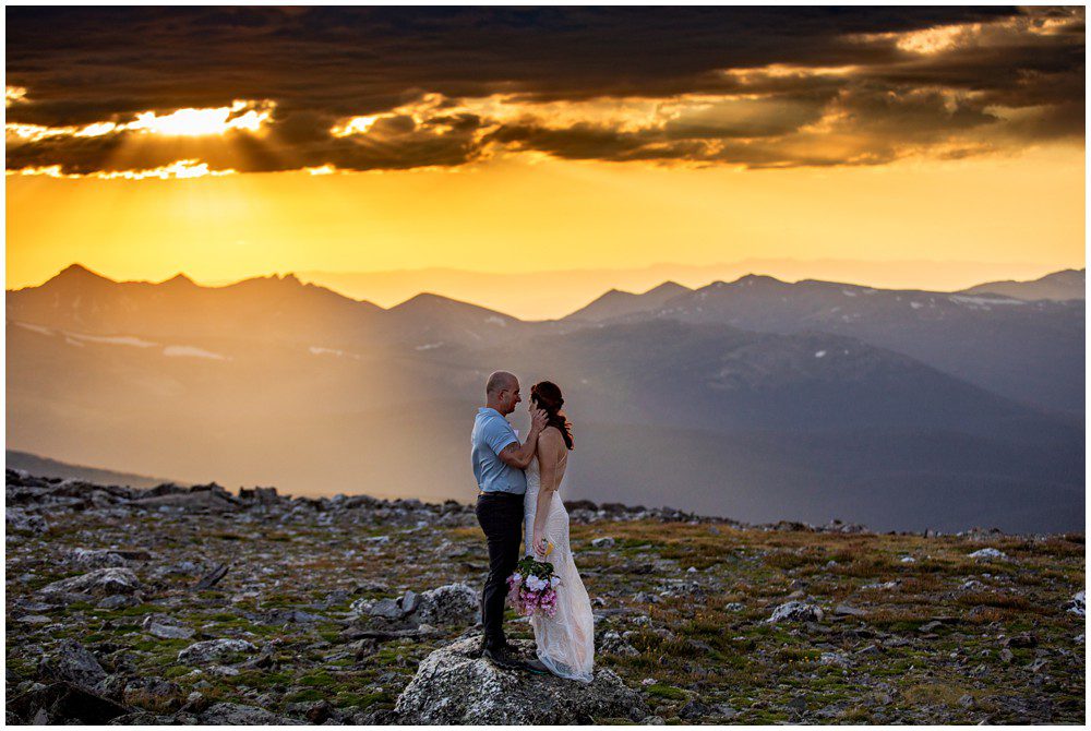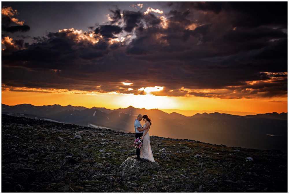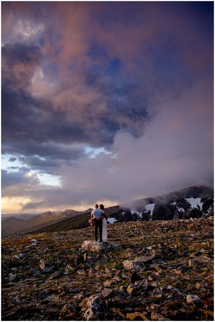 The approach to the summit was rather mild, and we made it to the storm shelters just as the sky was starting to turn magical colors. Amber headed in one direction to change into her attire, and Adam the other. Once they saw one another and were ready to say their vows above 13,000 feet, I told them to find a rock that sung to their souls – and that’s where we’d have their ceremony at. I personally am a huge proponent of finding a piece of Earth that speaks to you – you find the spot, and I’ll adjust myself accordingly.