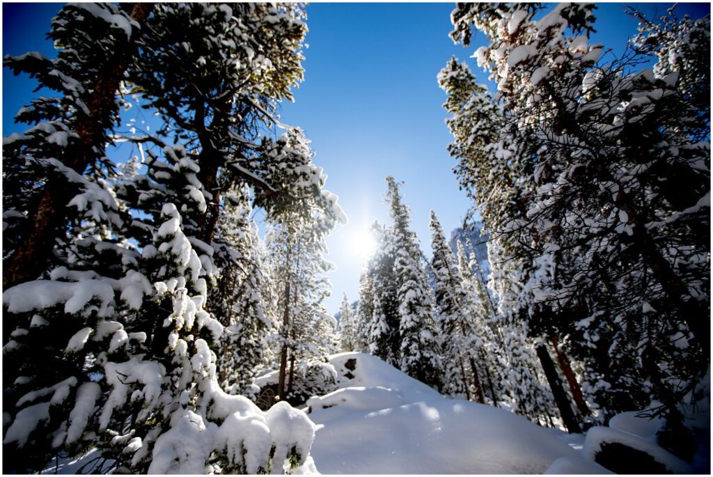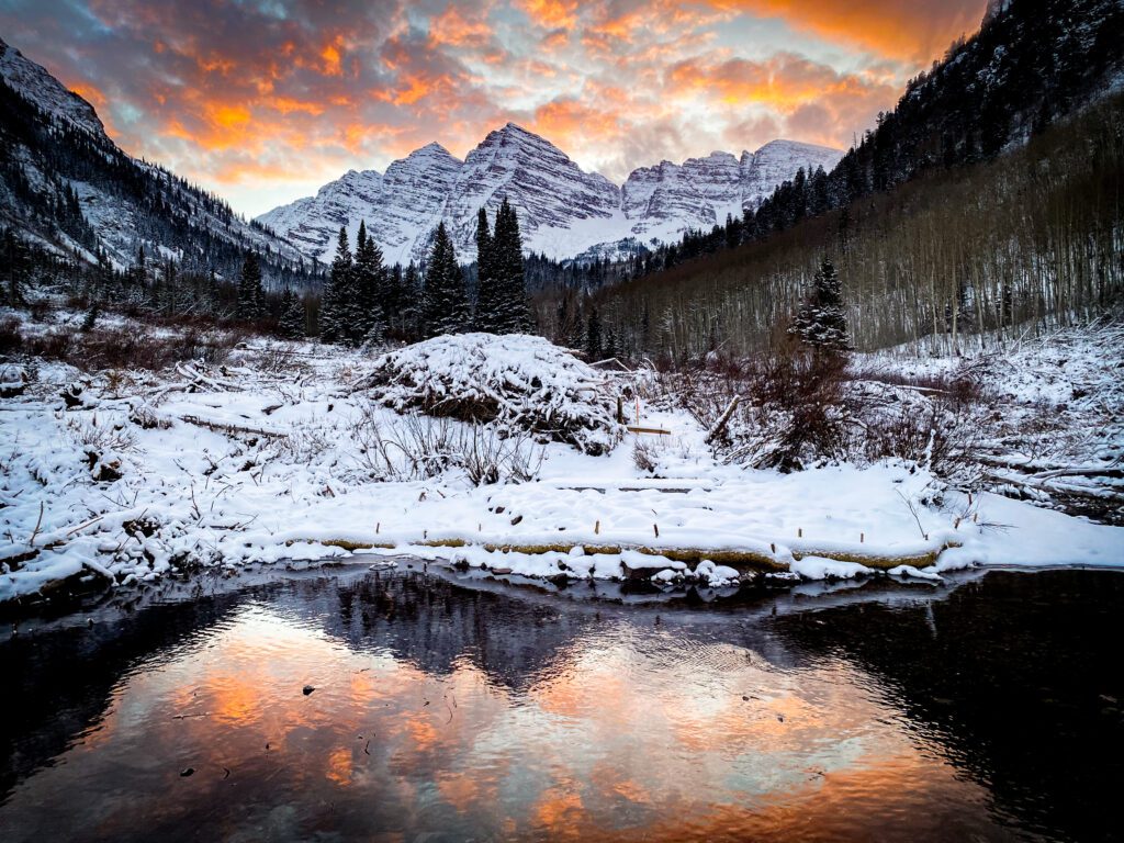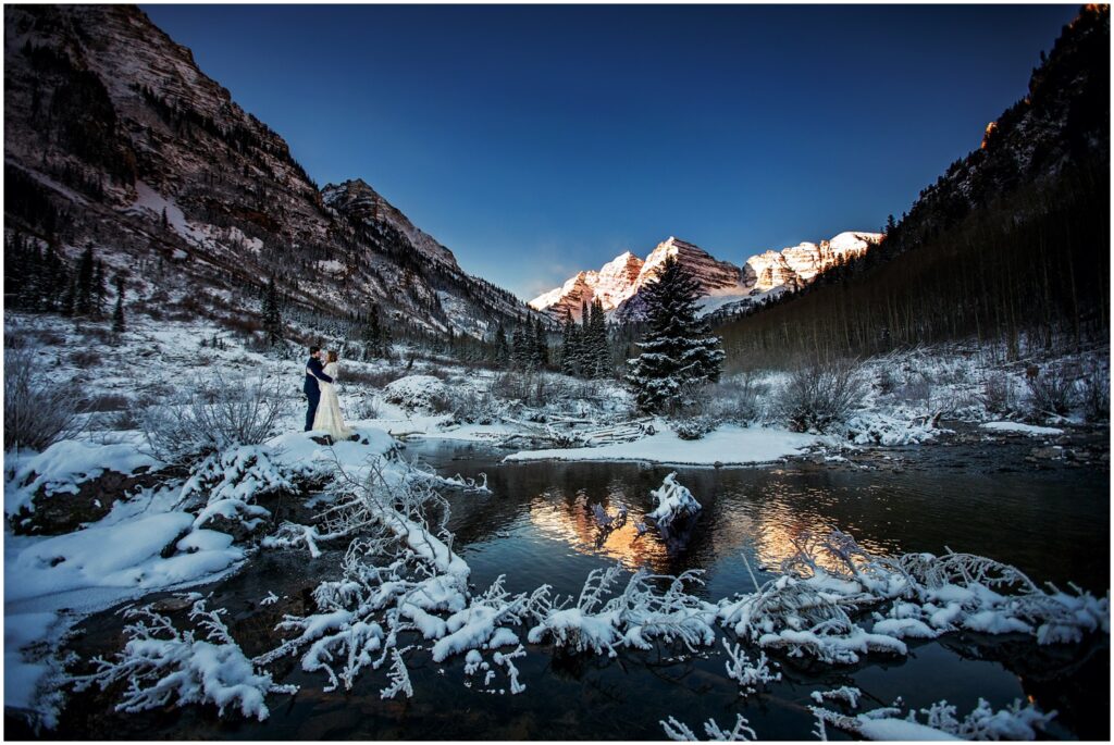 Sometimes, walking just a little further can lead to the most amazing locations. The Maroon Bells are known to reflect in Maroon Lake at sunrise – which is quite the sight to see. However, by Novermber the lake was totally frozen over and covered in a few inches of powder snow. Knowing my vision included a reflection, I walked back where I remembered seeing a small river running through earlier in the summer. We were greeted with a slow moving body of water surrounded by a dreamscape of snow and pines. I’ve said this to a few couples – but I absolutely love when Colroado looks like a Bob Ross Painting. Happy Little Trees equal a happy little photographer.