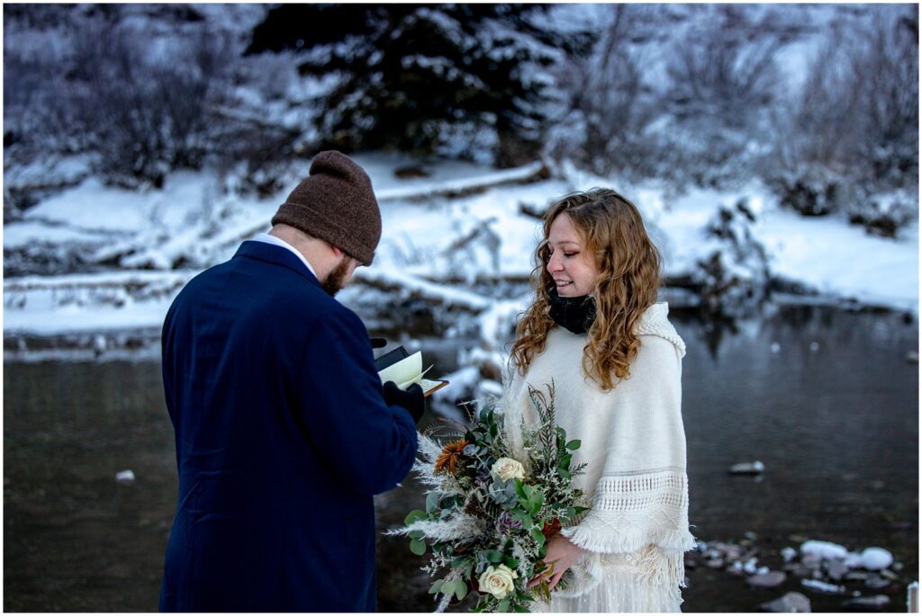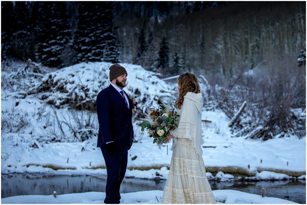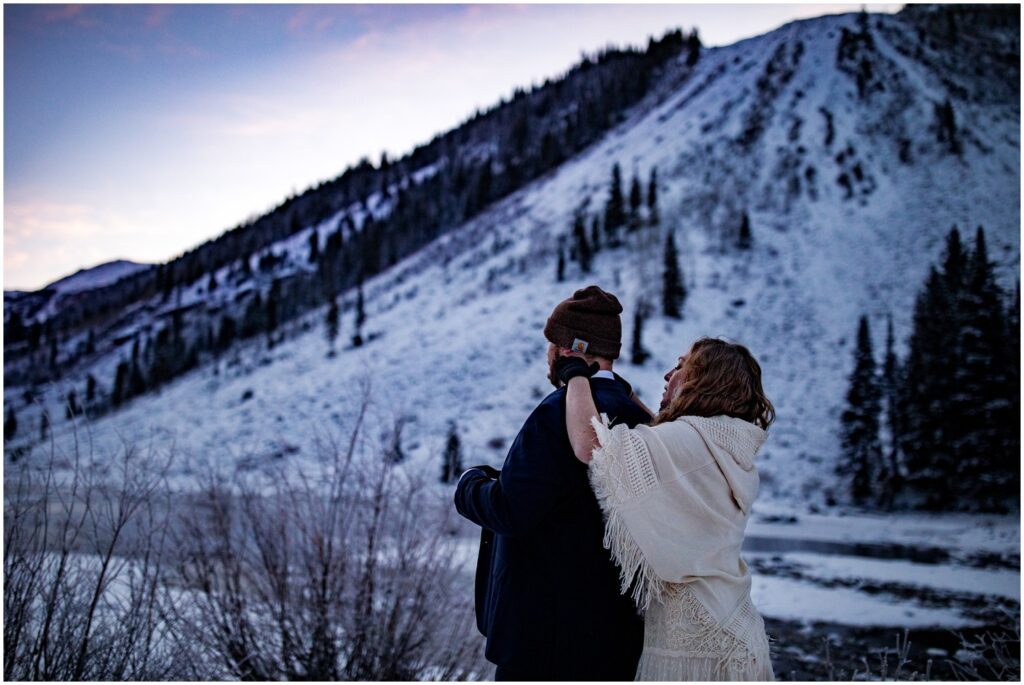 When I arrived in Aspen the night before Rachel and Charles’ elopement, I asked the desk clerk if the road was still accessible, to which I was given a shoulder shrug and a “maybeeeee?”. I decided to head out and see for myself – and I was very pleasantly surprised to see that the road was indeed still open and layered with fresh glittering snow. I’ll post a cell phone photo from my solo sunset trek at the bottom of this post – it was a stunning and peaceful evening running in the snow under a cotton candy sky.