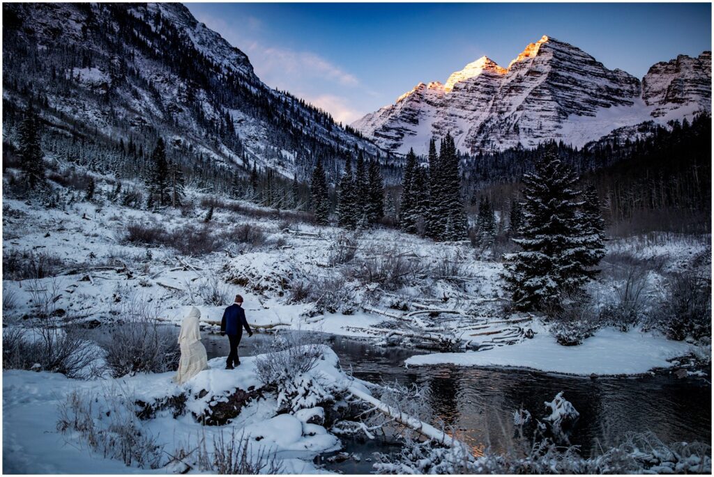 The next morning, I met with Rachel and Charles to walk out to the amazing spot I had seen the previous night for their Maroon Bells elopement. The air was a brisk 2ºF, but we were the only people (and animal… or none that we could see) the whole morning.