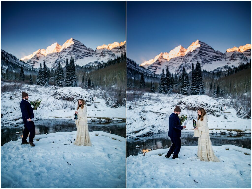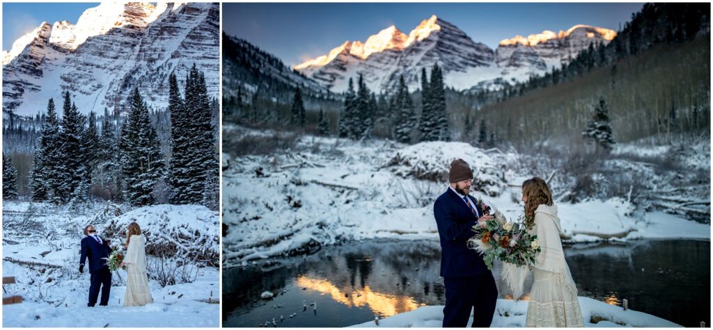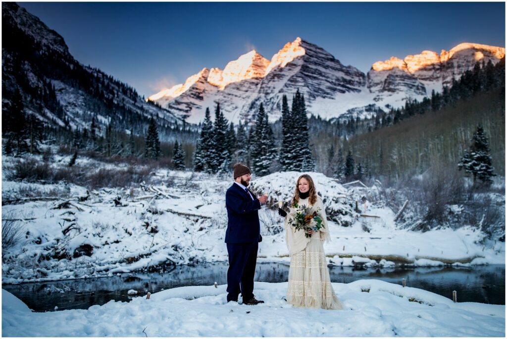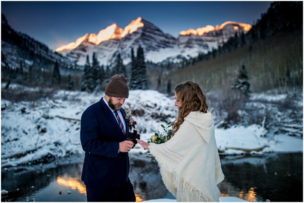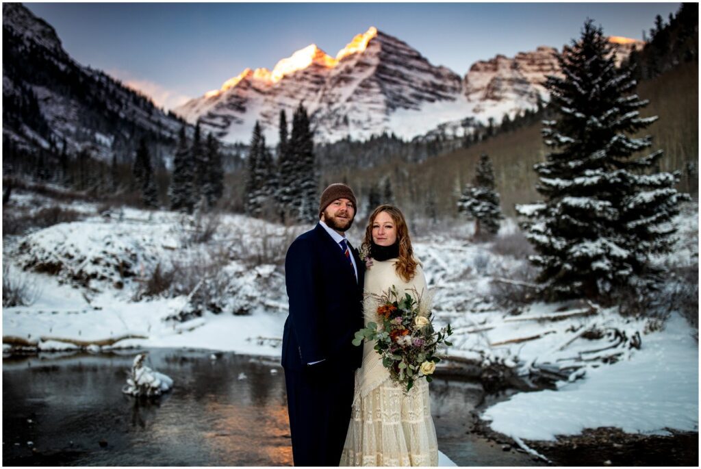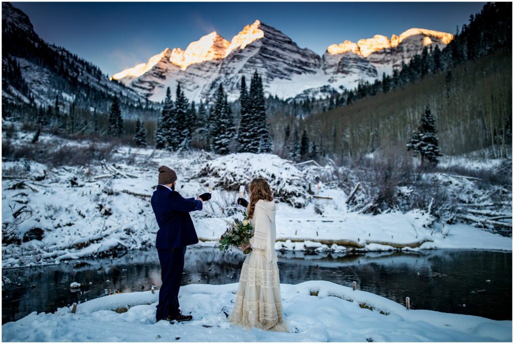 As the sun began to crest over the Eastern horizon, Rachel and Charles braved the near freezing temperatures to self solmemnize amongst a background of the glowing Maroon Bells. Colorado is one of only two states that allows for couples to declare themselves married without an officiant or wittness.