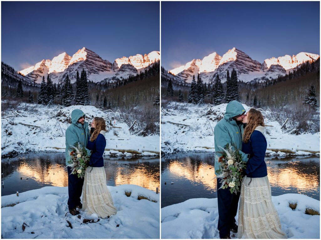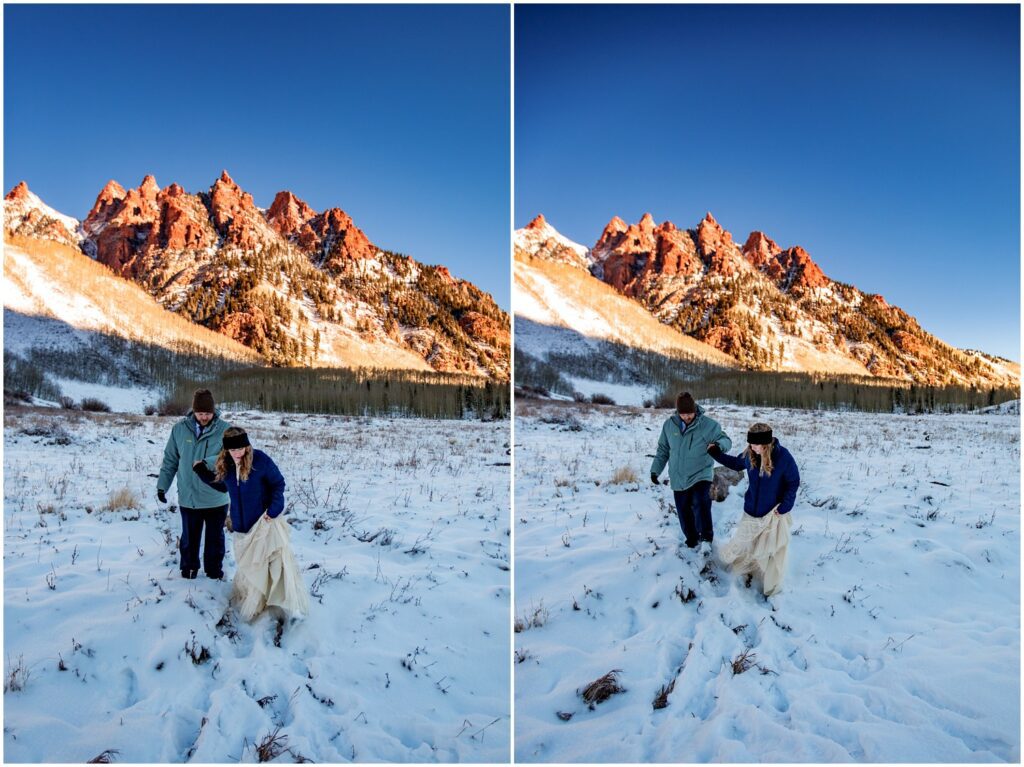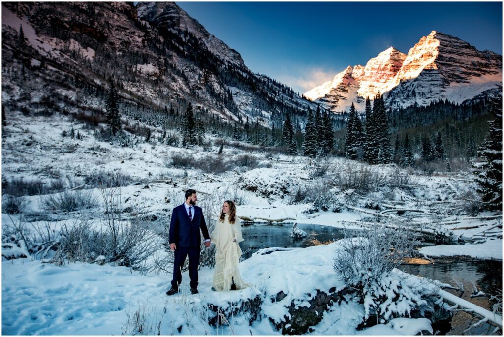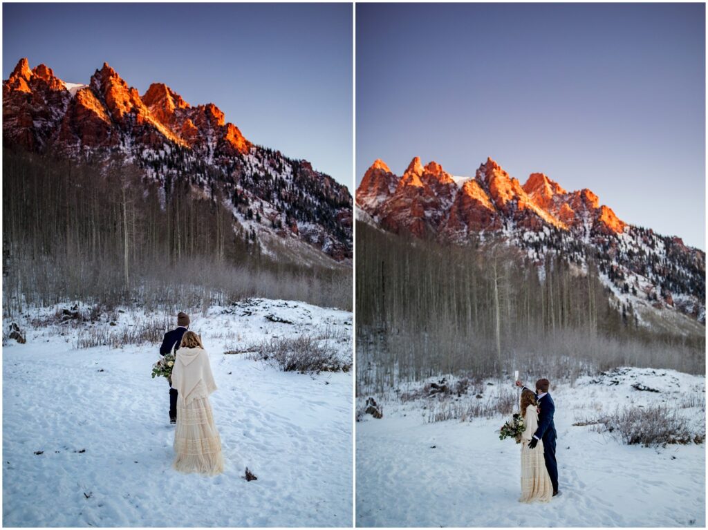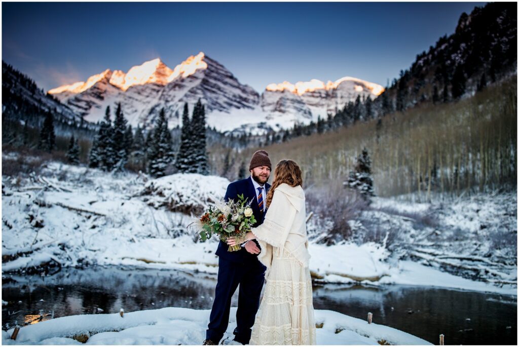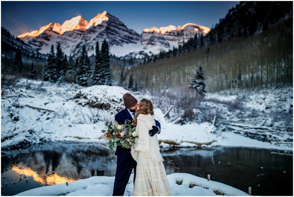 One of the trickiest parts of winter elopements is knowing if a road will be open or if snow will close it down. The road leading to Maroon Lake closes after there’s enough snow to need plowing – and the road becomes accessible by good ol’ foot power or a snowmobile. The road is 12 miles roundtrip – so it can be quite the undertaking.