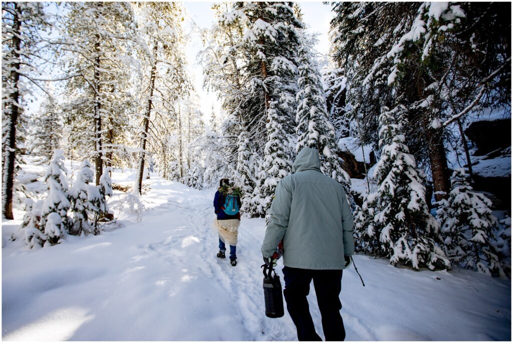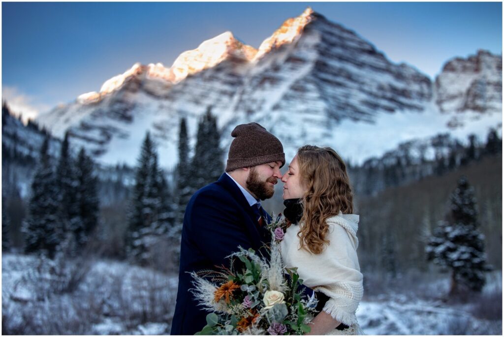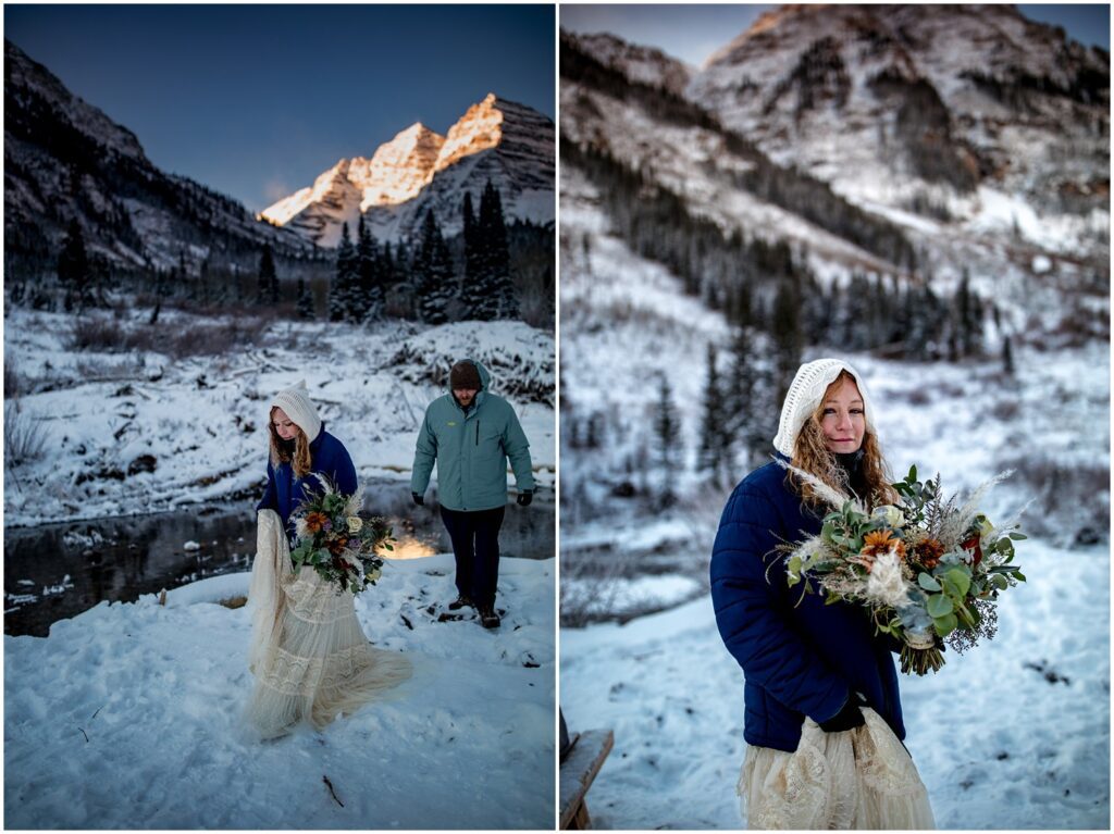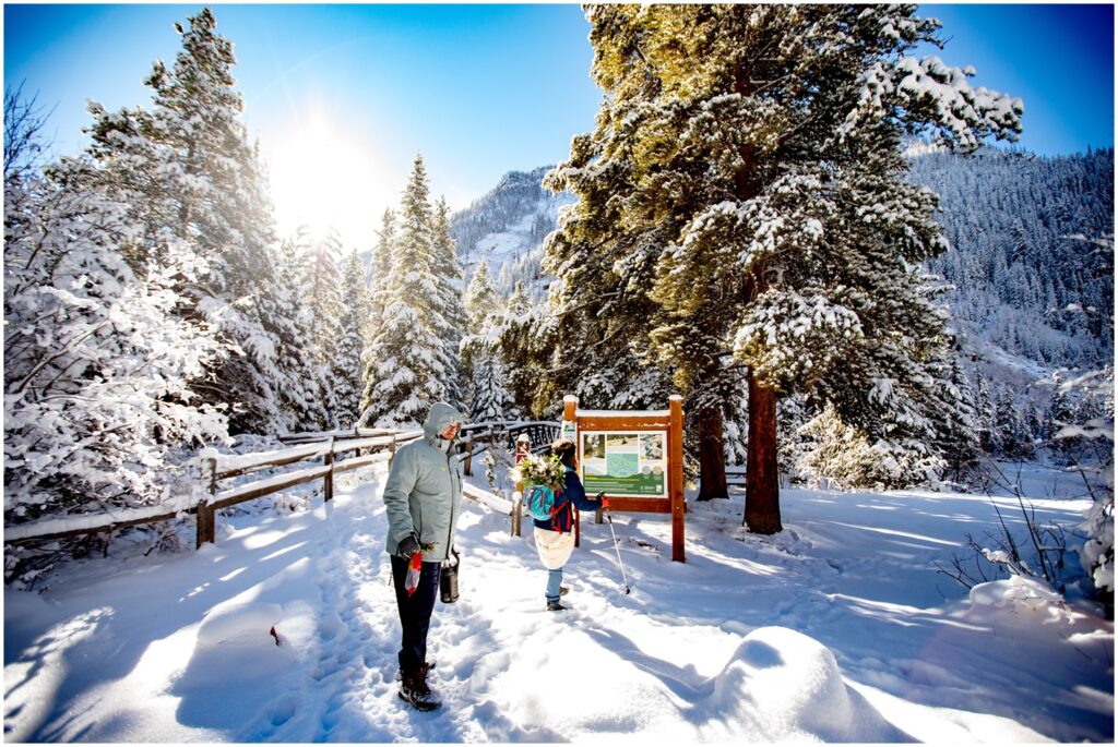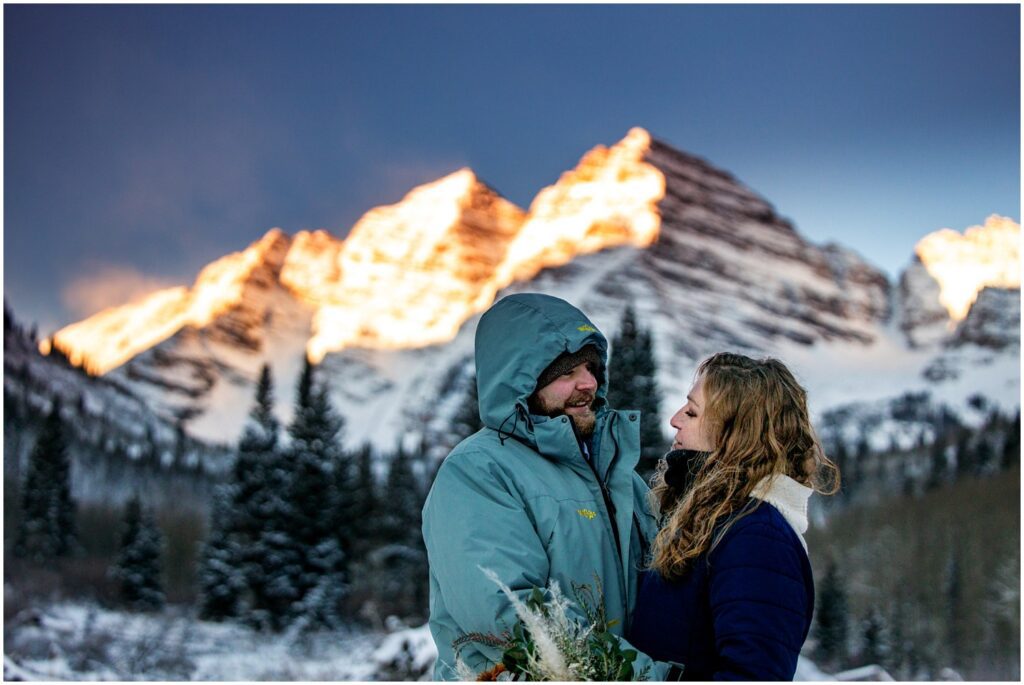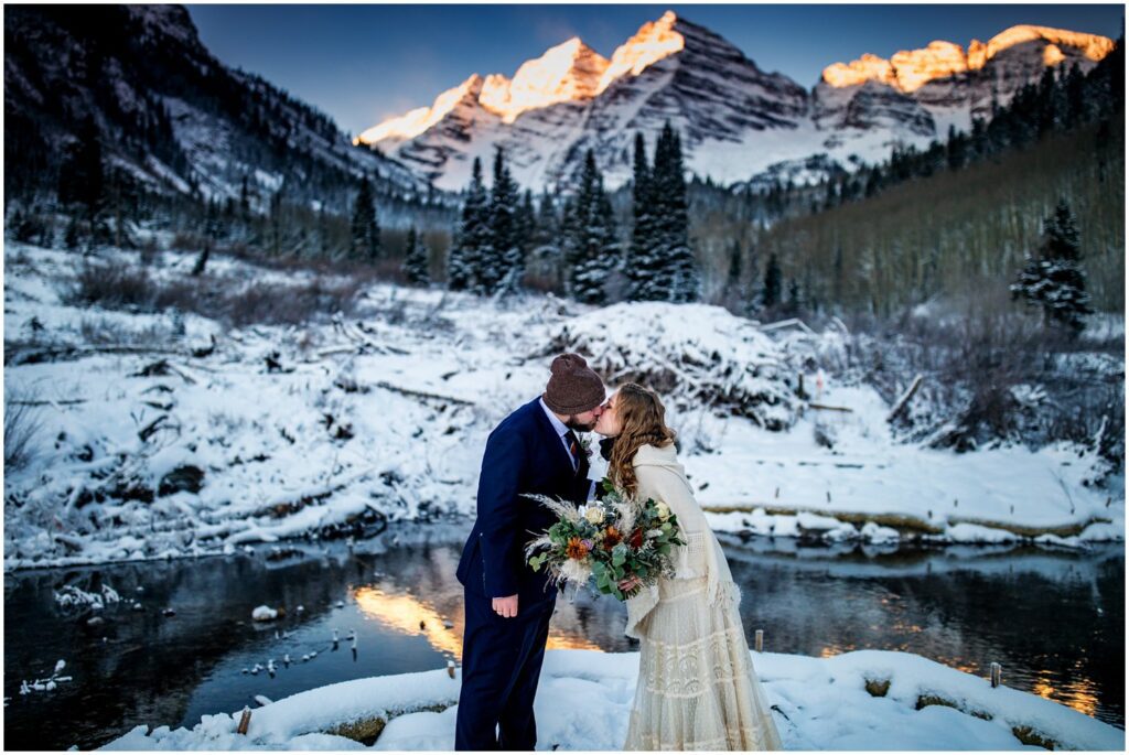 One of the trickiest parts of winter elopements is knowing if a road will be open or if snow will close it down. The road leading to Maroon Lake closes after there’s enough snow to need plowing – and the road becomes accessible by good ol’ foot power or a snowmobile. The road is 12 miles roundtrip – so it can be quite the undertaking.