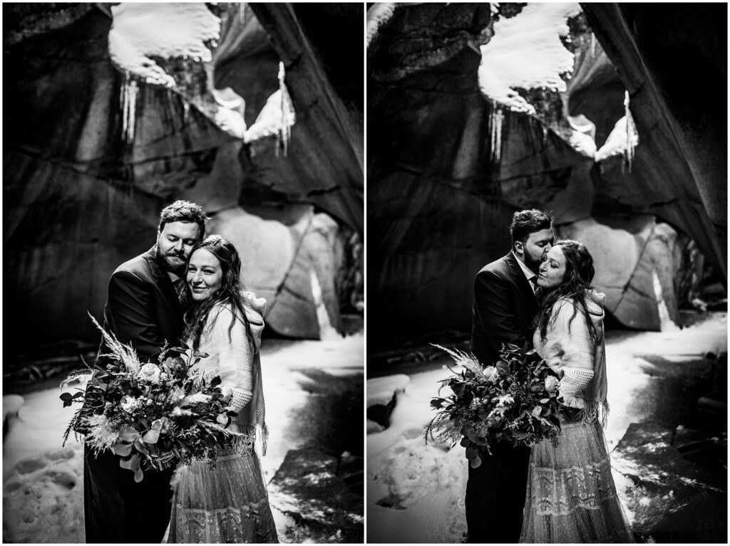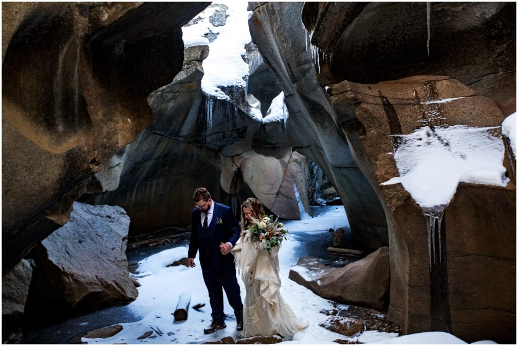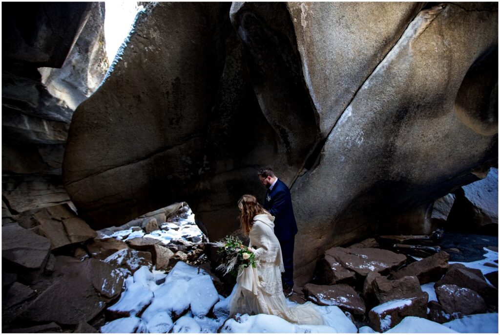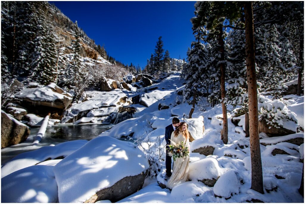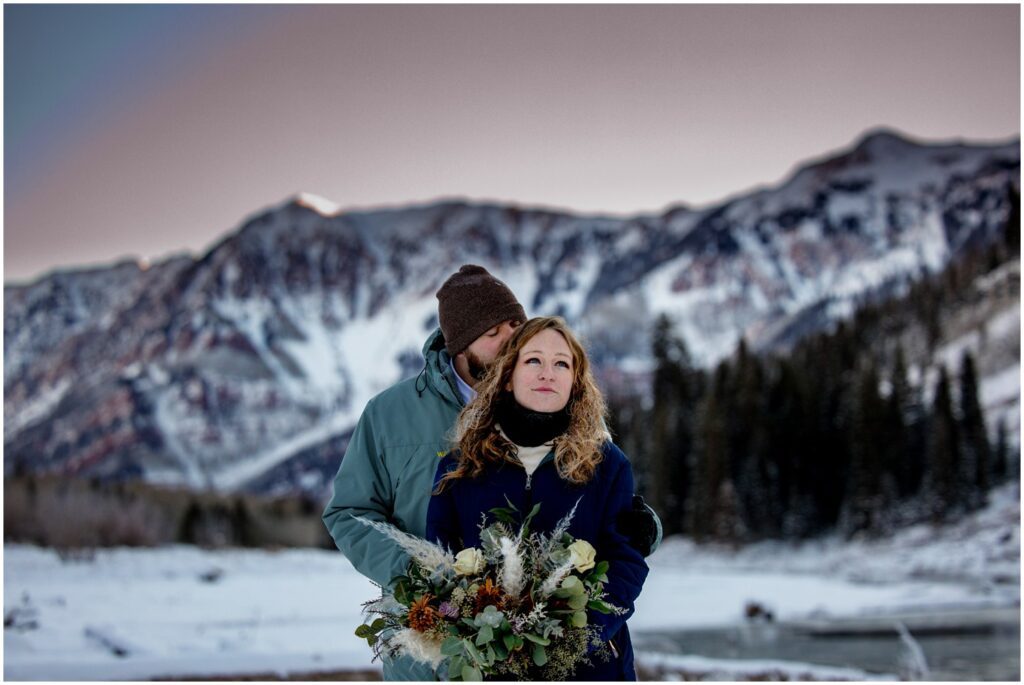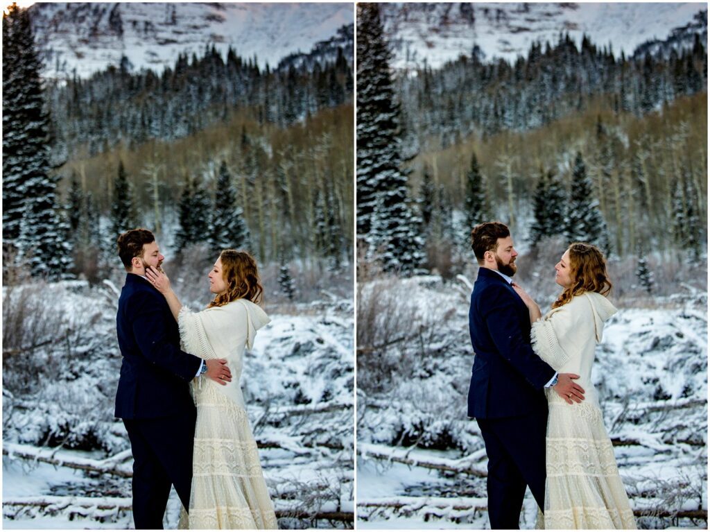 One of the trickiest parts of winter elopements is knowing if a road will be open or if snow will close it down. The road leading to Maroon Lake closes after there’s enough snow to need plowing – and the road becomes accessible by good ol’ foot power or a snowmobile. The road is 12 miles roundtrip – so it can be quite the undertaking.