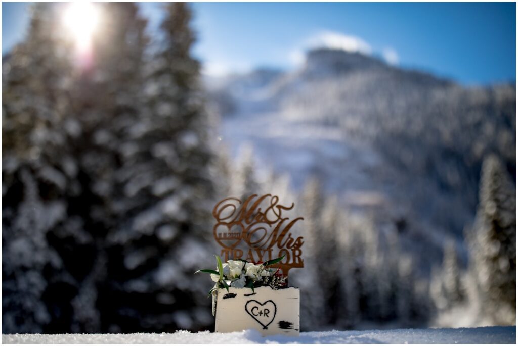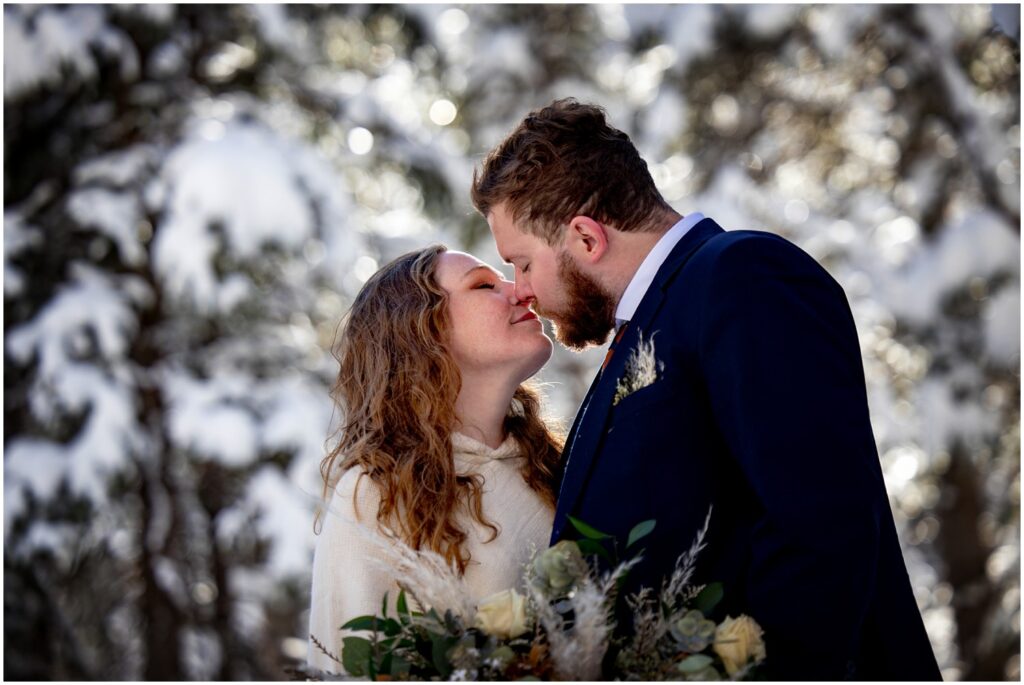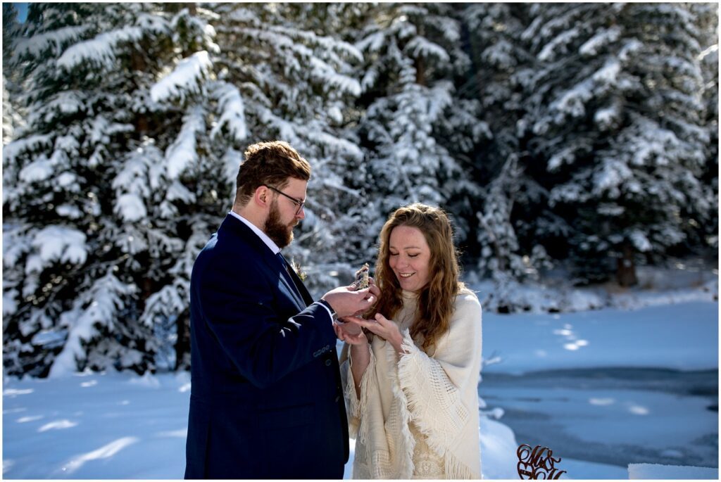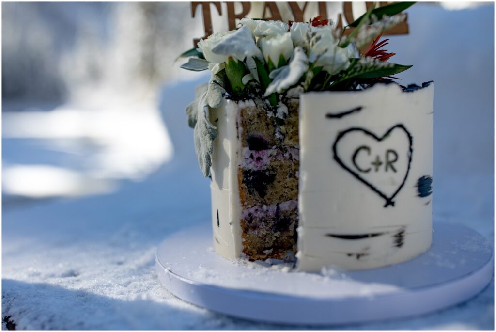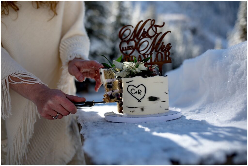 Back at the trailhead, Rachel and Charles cut into their delicious cake at one of the picnic tables nearby. Having an elopement doesn’t mean that you have to give up (or partake in) any traditional wedding events! A cake may even taste better slightly cold and eaten in a magical snow filled forest with just your significant other.