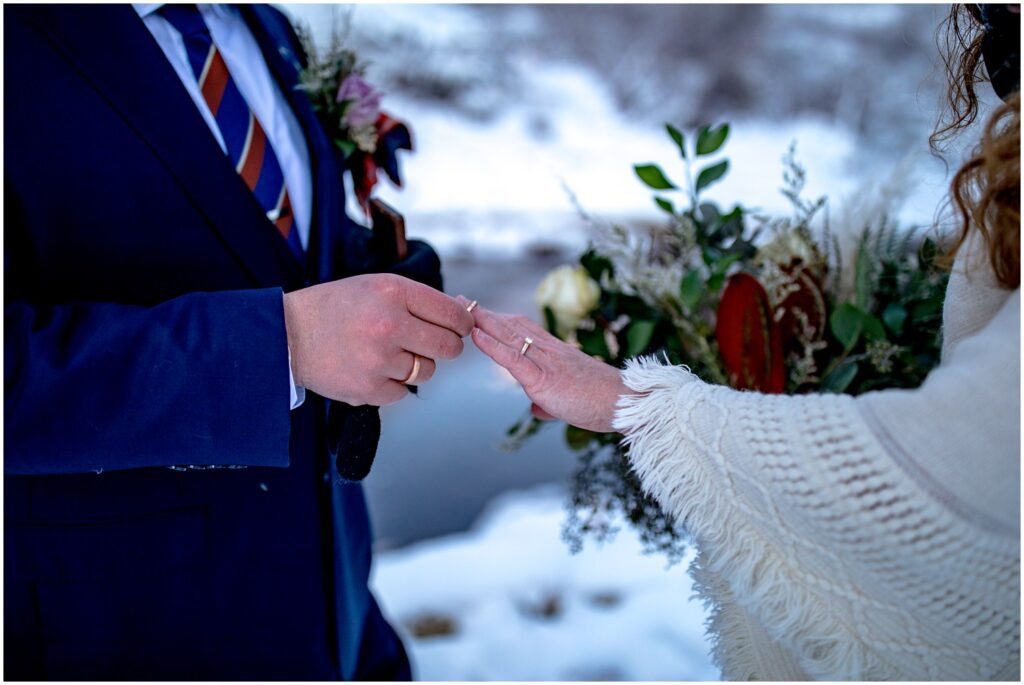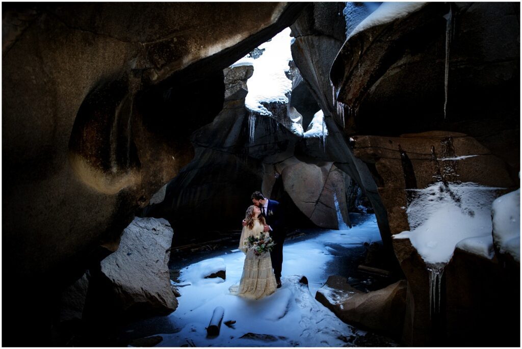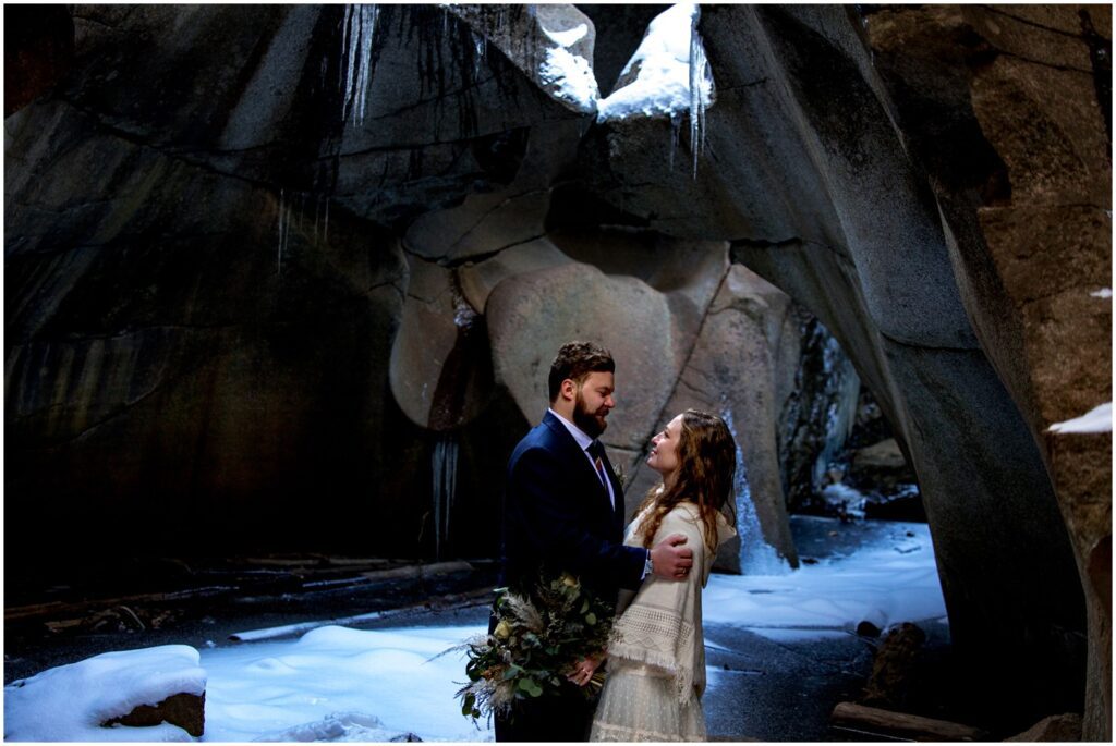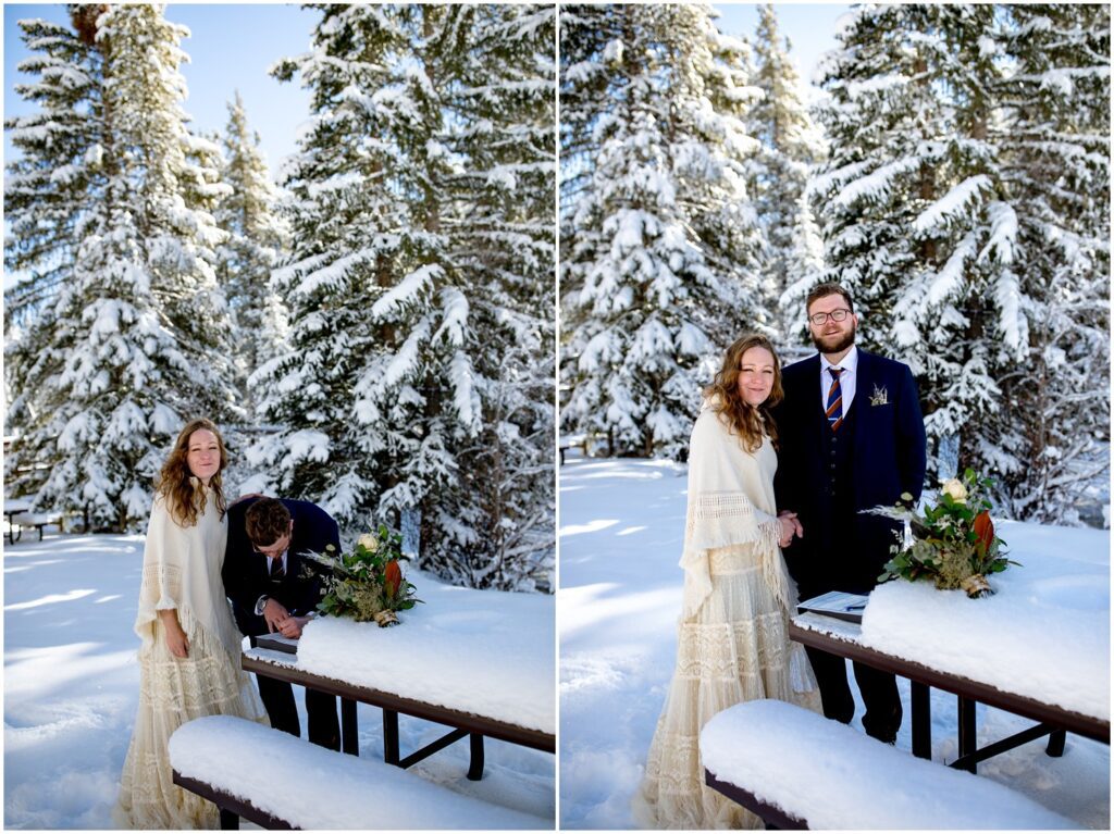 Back at the trailhead, Rachel and Charles cut into their delicious cake at one of the picnic tables nearby. Having an elopement doesn’t mean that you have to give up (or partake in) any traditional wedding events! A cake may even taste better slightly cold and eaten in a magical snow filled forest with just your significant other.