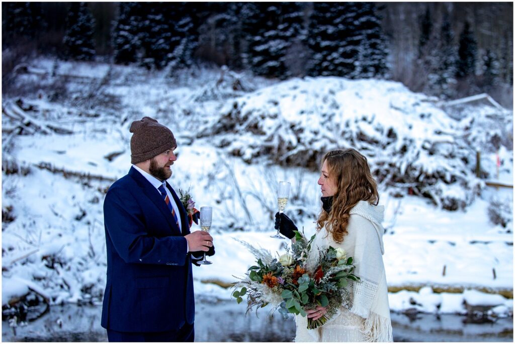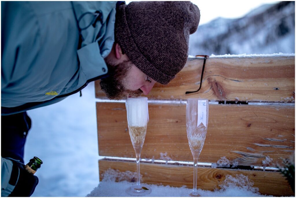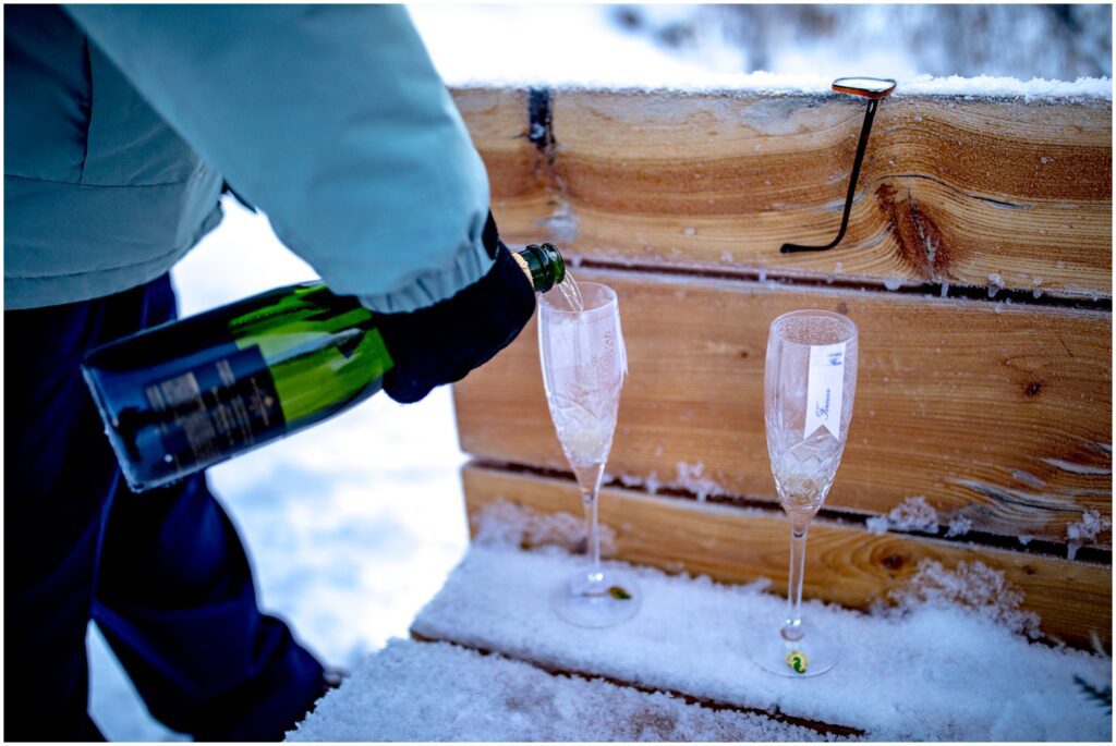 After loving vows and placing rings onto what I can only imagine were a few frozen fingers, Rachel and Charles celebrated with a champagne toast. The champagne only lasted a few minutes until we were left with champagne slushies that were well on their way to becoming blocks of boozy ice. Something that I’ve learned this year is that spraying champagne in near freezing temperatures means for slush, brozen corks, and most importantly – lots of laughs.